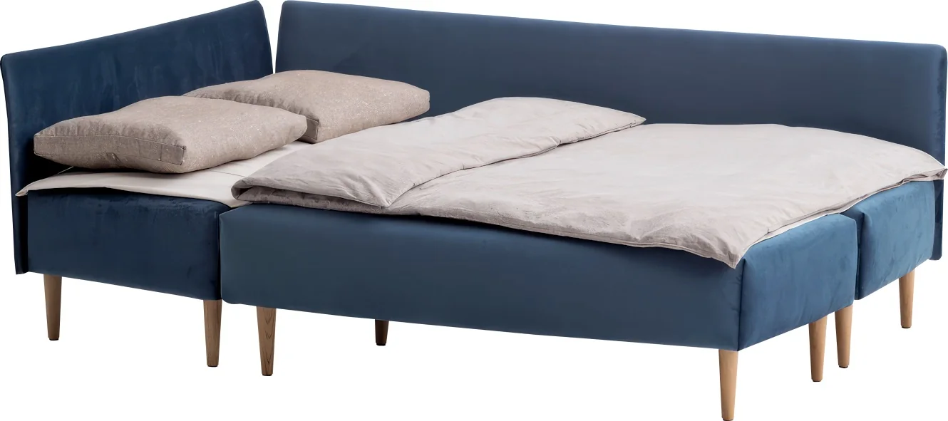 Mit kompakten Abmessungen von nur 145 x 205 cm passt das außergewöhnliche Design von TAIPEI auch in kleinere Wohnräume und überzeugt durch seine Vielseitigkeit. Der ergänzende Hocker fügt sich nahtlos in die Aussparung des Winkelsofas ein und verwandelt dieses im Handumdrehen in ein komfortables Doppelbett mit einer Liegefläche von 145 x 200 cm auf normaler Betthöhe.