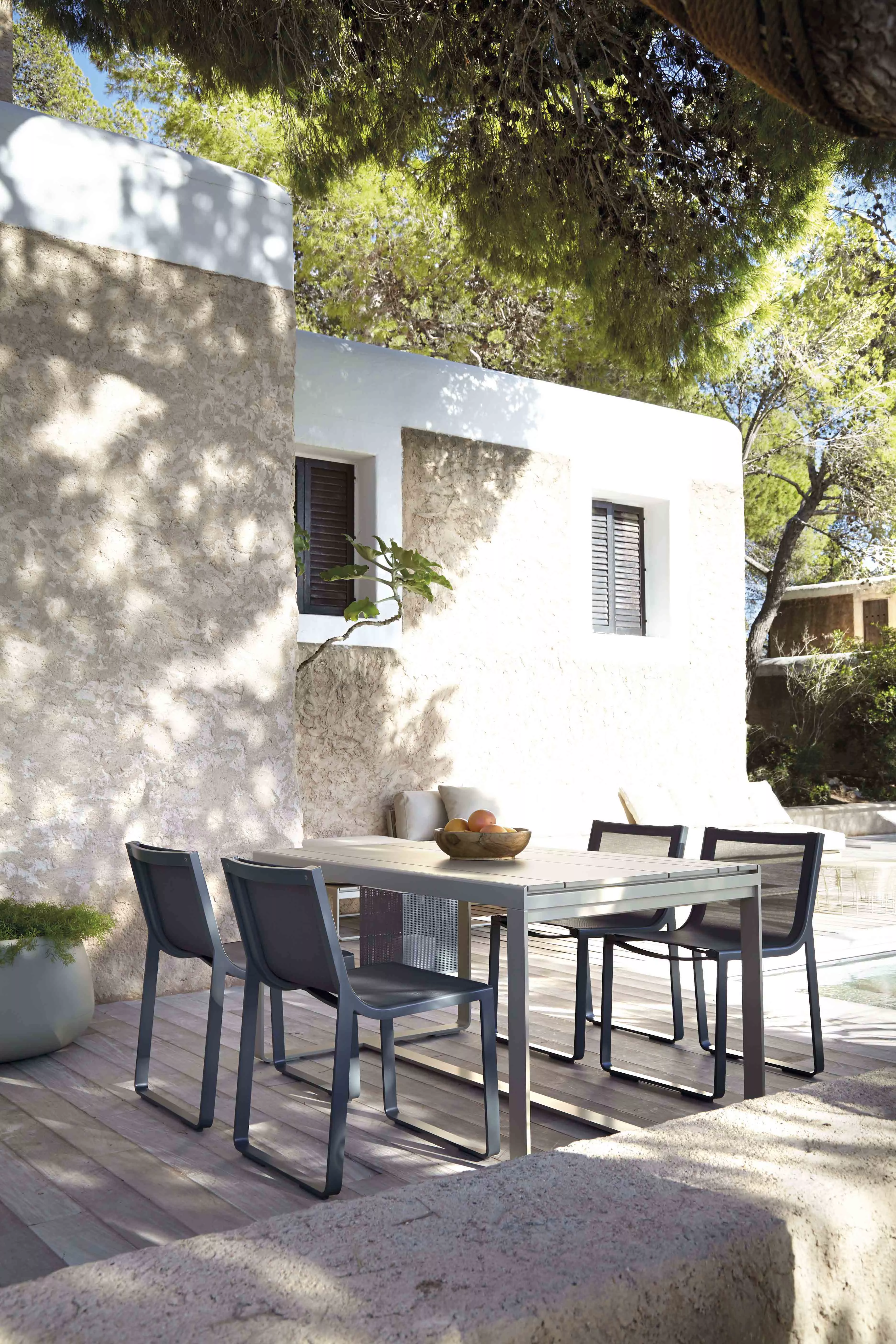 GANDIA BLASCO Timeless Gartentisch • Esstisch GANDIA BLASCO Timeless Gartentisch • 180 × 100 cm Hergestellt aus geschweißten thermolackierten Aluminiumprofilen. Tischplatte erhältlich in Decton®. Timeless, ein Plus an Stil und Komfort für den Outdoor-Möbelbereich In seiner neuen Outdoor-Kollektion Timeless, die aus der Feder von José A. Gandía-Blasco Canales und Borja García stammt, setzt GANDIABLASCO ganz auf Schlichtheit und zeitlose Eleganz. Die zurückhaltenden und dennoch kraftvollen Formen des Designs sind von der rationalen Architektur des beginnenden 20. Jahrhunderts inspiriert und stehen für eine Ehrlichkeit, der die eigene Struktur Verzierung und Schmuck genug ist. Jedes einzelne Teil der Kollektion ist ein überaus gelungenes Beispiel für minuziöse Ausgewogenheit und maximalen Komfort. TIMELESS entstand als gemeinsames Projekt des Firmeninhabers José A. Gandía-Blasco Canales, der selbst für einige der bekanntesten Kollektionen wie beispielsweise SALER oder die Produktlinie ESPACIOS EXTERIORES verantwortlich zeichnet, und des jungen valenzianischen Designers Borja García, der durch seine Arbeiten im Bereich Industriedesign und Architektur bekannt wurde und auch die Linie RAW von GAN, der Designmarke von GANDIABLASCO für handgefertigte Artikel, entworfen hat. TIMELESS ist vollständig aus Aluminiumguss mit Thermolackierung gefertigt, weshalb die Teile sehr leicht sind und man sie trotz ihrer Größe problemlos transportieren kann. Die Ausführung in Iroko- Holz, einem wetterbeständigen Naturmaterial, ist hervorragend für den Einsatz im Outdoor-Bereich geeignet. Die Aluminiumstrukturen sind in allen Farbtönen der Farbpalette GANDIABLASCO und in einer neuen, speziell für die Kollektion entworfenen Linie erhältlich. Die große Auswahl an Outdoor- Bezügen unterschiedlichster Art macht TIMELESS zu einem ungemein anpassungsfähigen Produkt, das sowohl für den Contract-Bereich als auch für Privathäuser immer elegante Lösungen bietet. Die Kollektion besteht aus fünf modularen Sofas, die vielfache Kombinationen ermöglichen, sowie aus einer Liege, einem modularen Sitzkissen und verschiedenen Sesseltypen (Lehnsessel, niedriger Sessel etc.), einem hohen Tisch und Hockern. Das 1941 gegründete Familienunternehmen begann mit der Herstellung von Decken. Mitte der 80er Jahre widmete es sich dem Design von Teppichen. Seit 2000 konzentriert sich das Unternehmen ausschließlich auf Produkte für den Außenbereich. Es folgt kontinuierlich seiner expansionistischen Unternehmensstrategie und gilt als weltweiter Marktführer für Designermöbel für den Außenbereich. Das Unternehmen expandiert in der ganzen Welt und eröffnet in vielen Ländern Geschäfte und Showrooms. Die Zusammenarbeit mit international anerkannten Designern erweitert, bereichert und vervollständigt moderne Stilrichtungen von GANDIA BLASCO Gartenmöbel. Die GANDIA BLASCO Lounge Kollektion Timeless ist aus jeder Perspektive ein Blickfang. Die stilsicheren Linien und elegante Lounge Atmosphäre passen perfekt in jeden Wohnraum und laden zur Gastlichkeit ein. Gestell: thermolackiertes Aluminium Tischplatte: HPL/Decton® Leicht zu reinigen Wetterfest Maße: (B × T × H) 180 × 100 × 74 cm