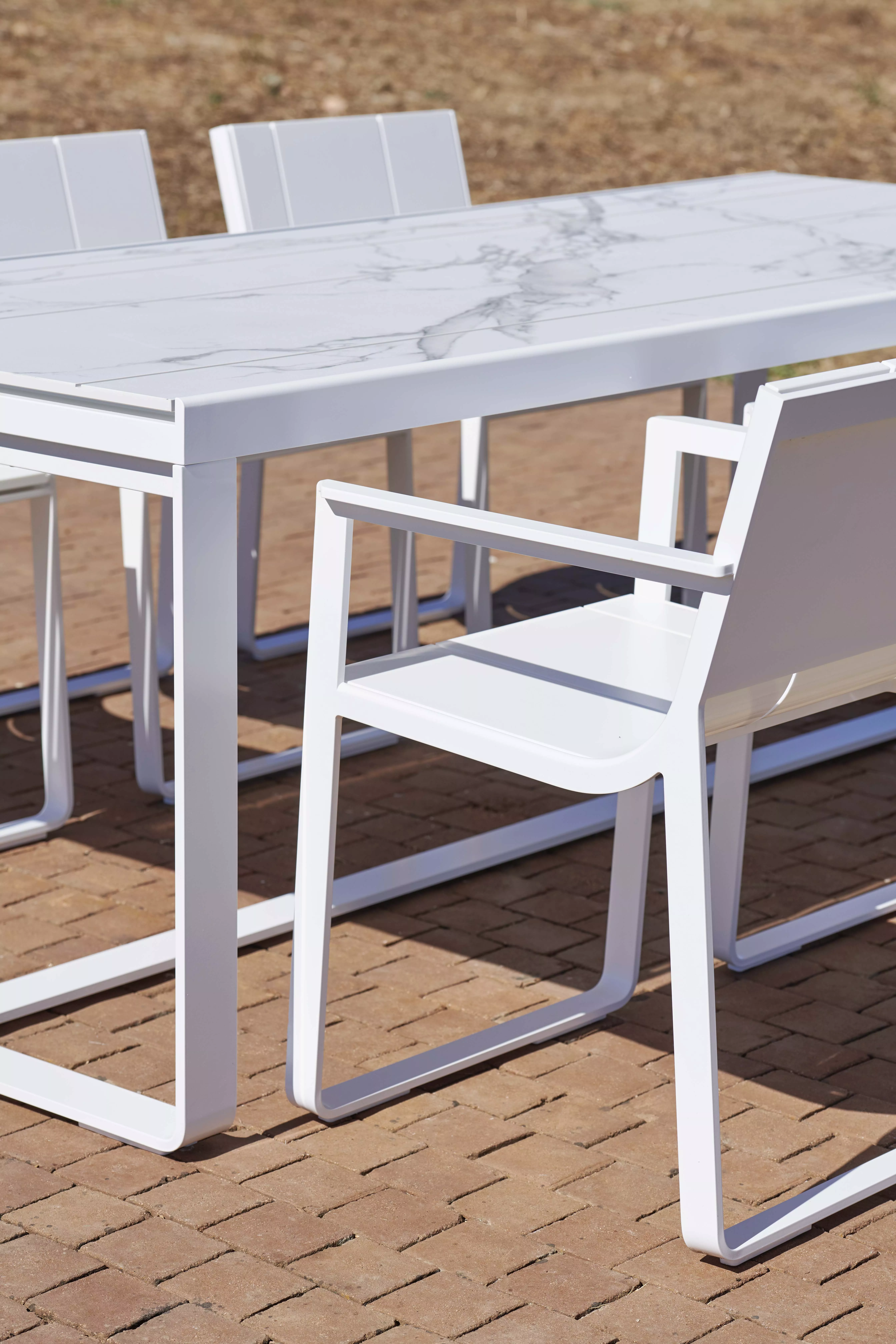 GANDIA BLASCO Flat Textil Eszimmerstuhl mit Armlehne "FLAT TEXTIL ist die wesentliche und leichte Version der ursprünglichen FLAT-Kollektion. Unter Beibehaltung des strengen minimalistischen Designansatzes und des starken architektonischen Profils wird bei der Kollektion FLAT TEXTIL die Silhouette durch die Betonung der Rückenlehne und der Sitzfläche aus wasserfestem Textil leicht abgemildert. Die ergonomischen Linien der verschiedenen Sitzgelegenheiten laden zum Entspannen ein, da diese Kollektion ein Möbelsystem für den Außenbereich mit einem Komfortstandard für den Innenbereich kombiniert. Die technische Leistung wird durch ihre Ästhetik ergänzt." Pulverbeschichtetes Auluminium Batyline®-Gewebe Maße: L x B x H 58cm x 54cm x 80cm