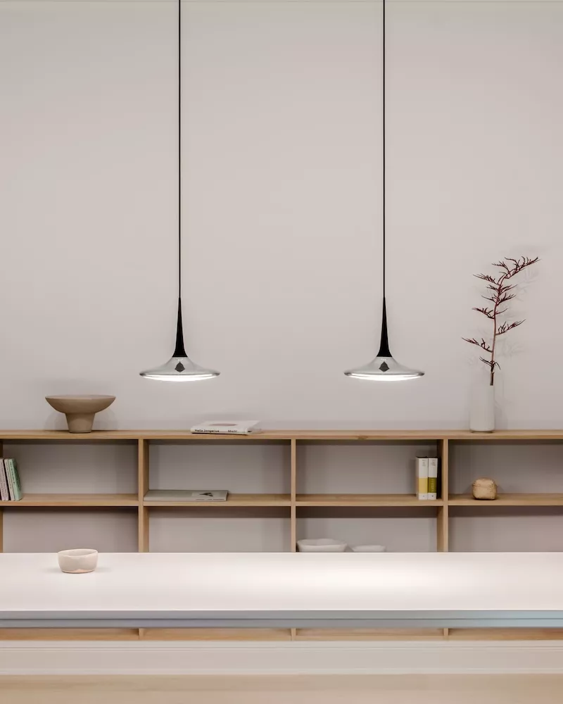 FALLING LEAF fungiert als zentrales Element im Raum. Durch die hochmoderne Linse strömt großzügig blendfreies Licht über den Tisch und passt sich dank der Warm Dim Technologie der Atmosphäre an.