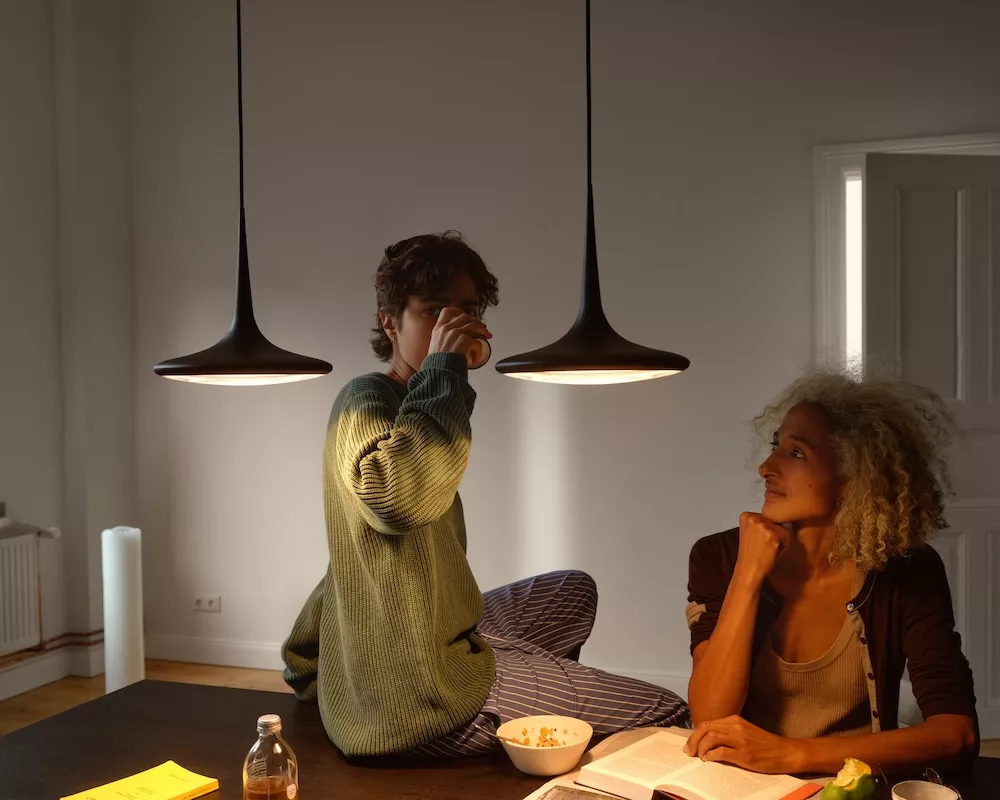 FALLING LEAF fungiert als zentrales Element im Raum. Durch die hochmoderne Linse strömt großzügig blendfreies Licht über den Tisch und passt sich dank der Warm Dim Technologie der Atmosphäre an.