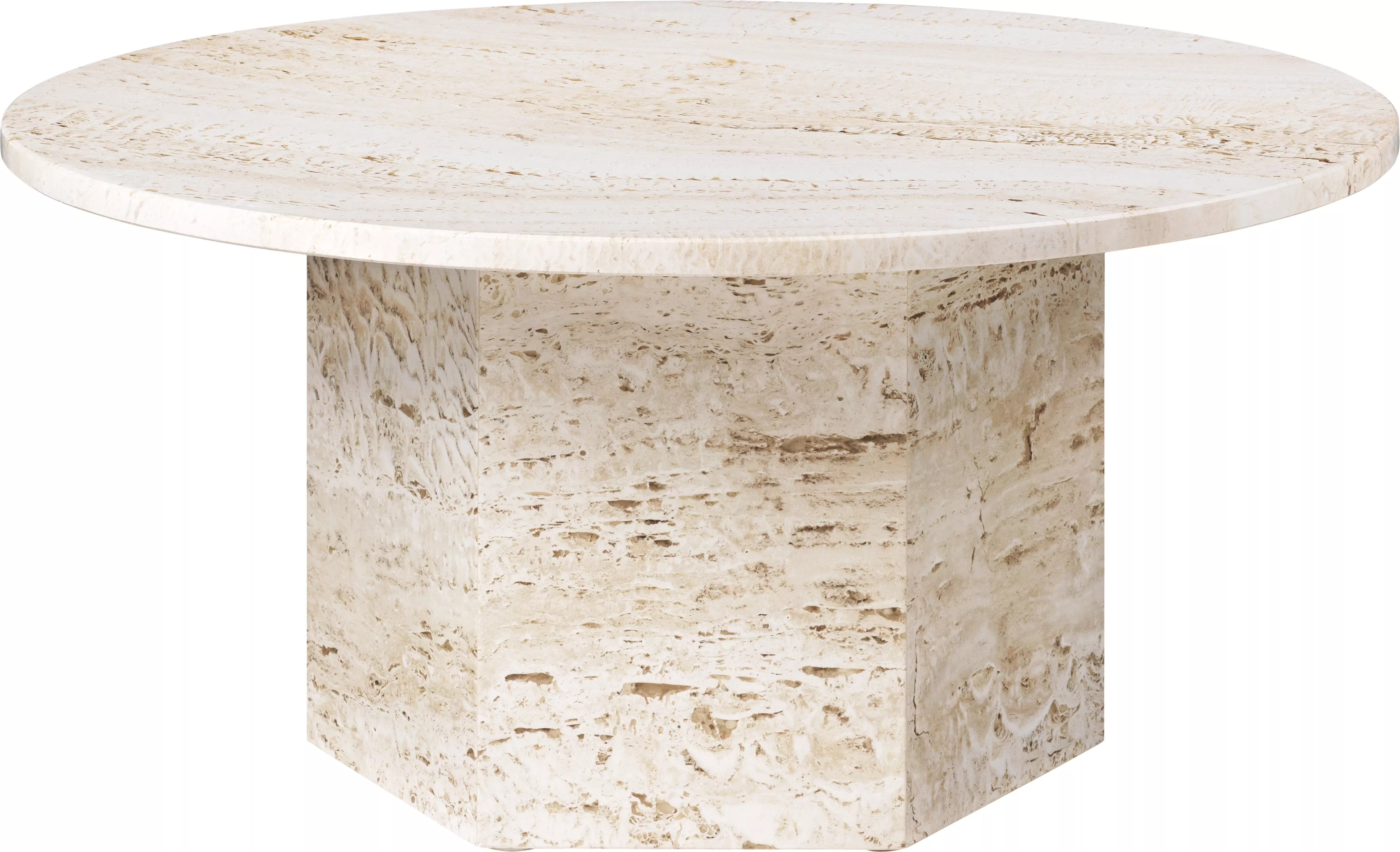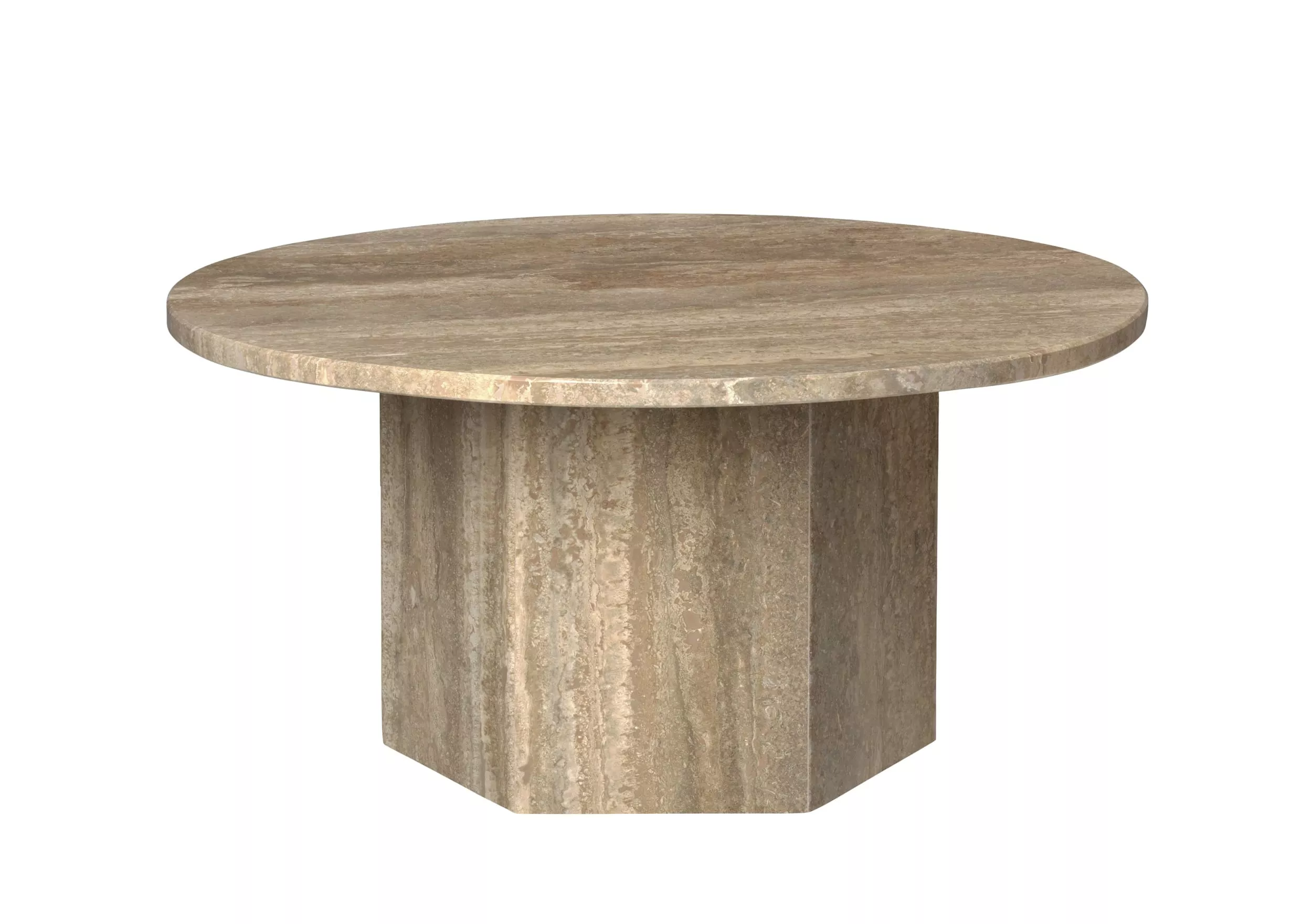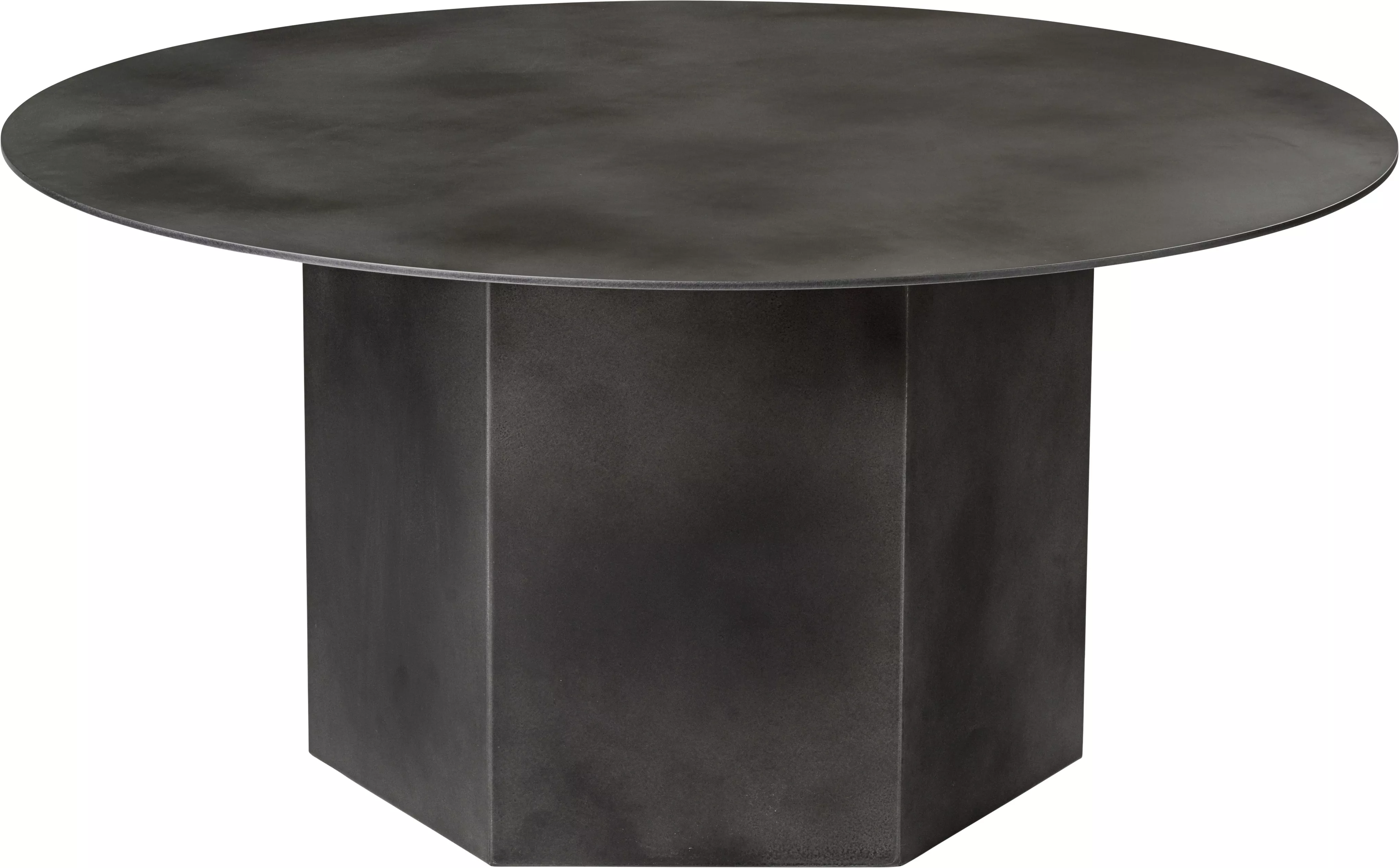 GUBI - EPIC Couchtisch • Rund GamFratesis Epic Table für GUBI, benannt nach den antiken epischen Gedichten, ist ein skulpturales Möbelstück, das von griechischen Säulen und römischer Architektur inspiriert ist. Ursprünglich in Italien aus Travertin gefertigt, markiert diese neue Variante das erste Mal, dass GamFratesi mit Stahlplatten arbeitet. Diese Platten durchlaufen Veredelungsprozesse wie Verzinkung, Lackierung und aufwendige Handfinish-Arbeiten, um jeder Tischplatte eine einzigartige Oberflächenstruktur zu verleihen.Während die monolithische Form des Tisches erhalten bleibt, strahlt er nun einen industriellen Charakter aus und offenbart bei jeder Benutzung neue Details. Diese Kollektion verleiht privaten Räumen Persönlichkeit und bringt ein faszinierendes Gefühl von Gewicht und Haptik in öffentliche und gastfreundliche Umgebungen, in denen robuste Oberflächen außergewöhnliche Haltbarkeit bieten. Die Epic Table Collection bietet verschiedene Höhen und Durchmesser, sodass ein einzelner monochromatischer Tisch eigenständig stehen oder harmonisch in dynamischen Gruppen aus verschiedenen Materialien, Höhen und Farben kombiniert werden kann.Während die monolithische Form des Tisches erhalten bleibt, strahlt er nun einen industriellen Charakter aus und offenbart bei jeder Benutzung neue Details. Diese Kollektion verleiht privaten Räumen Persönlichkeit und bringt ein faszinierendes Gefühl von Gewicht und Haptik in öffentliche und gastfreundliche Umgebungen, in denen robuste Oberflächen außergewöhnliche Haltbarkeit bieten. Die Epic Table Collection bietet verschiedene Höhen und Durchmesser, sodass ein einzelner monochromatischer Tisch eigenständig stehen oder harmonisch in dynamischen Gruppen aus verschiedenen Materialien, Höhen und Farben kombiniert werden kann. Maße: 110 Durchmesser x H34 cmAuswahlmöglichkeit zwischen Stahl und Travertin