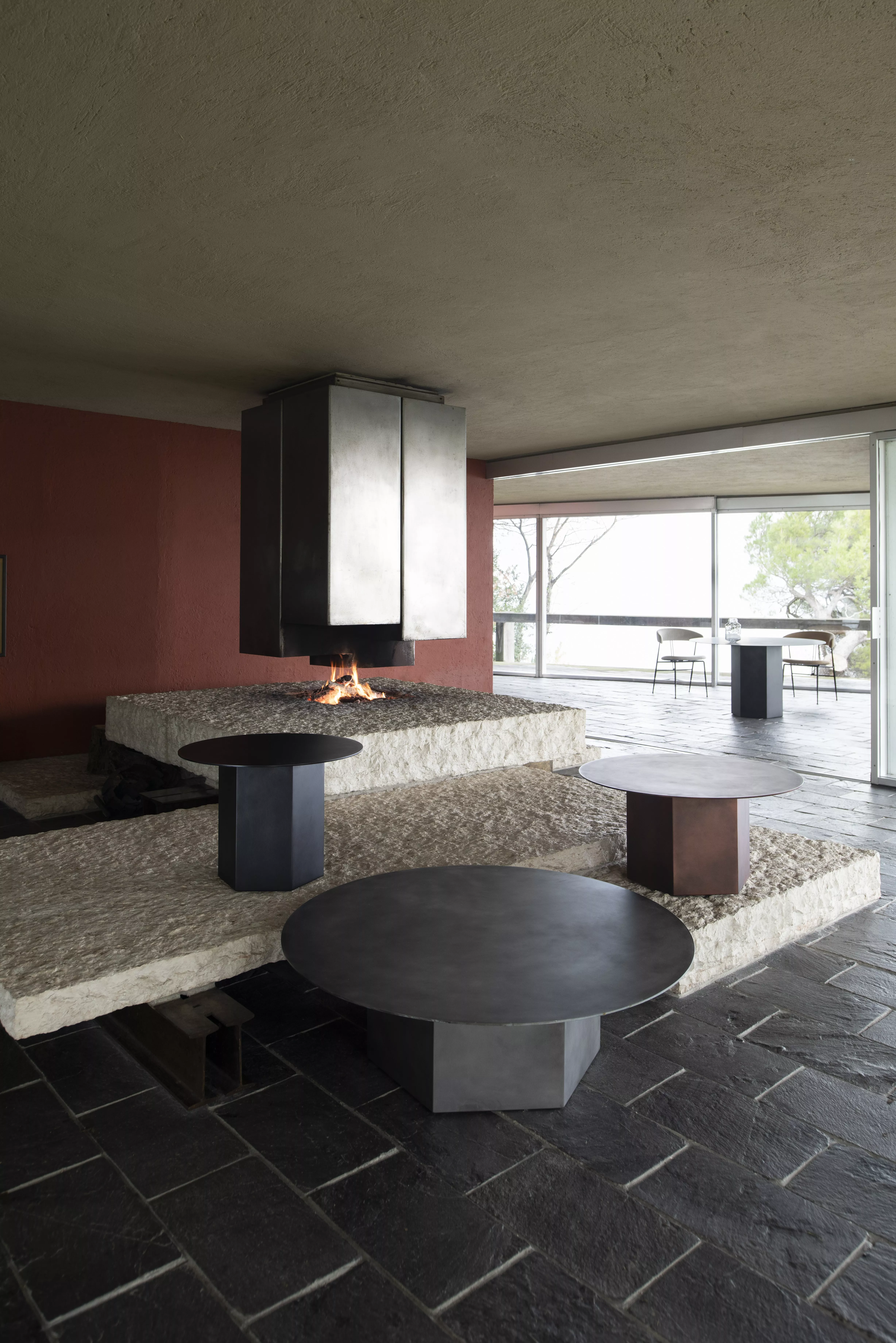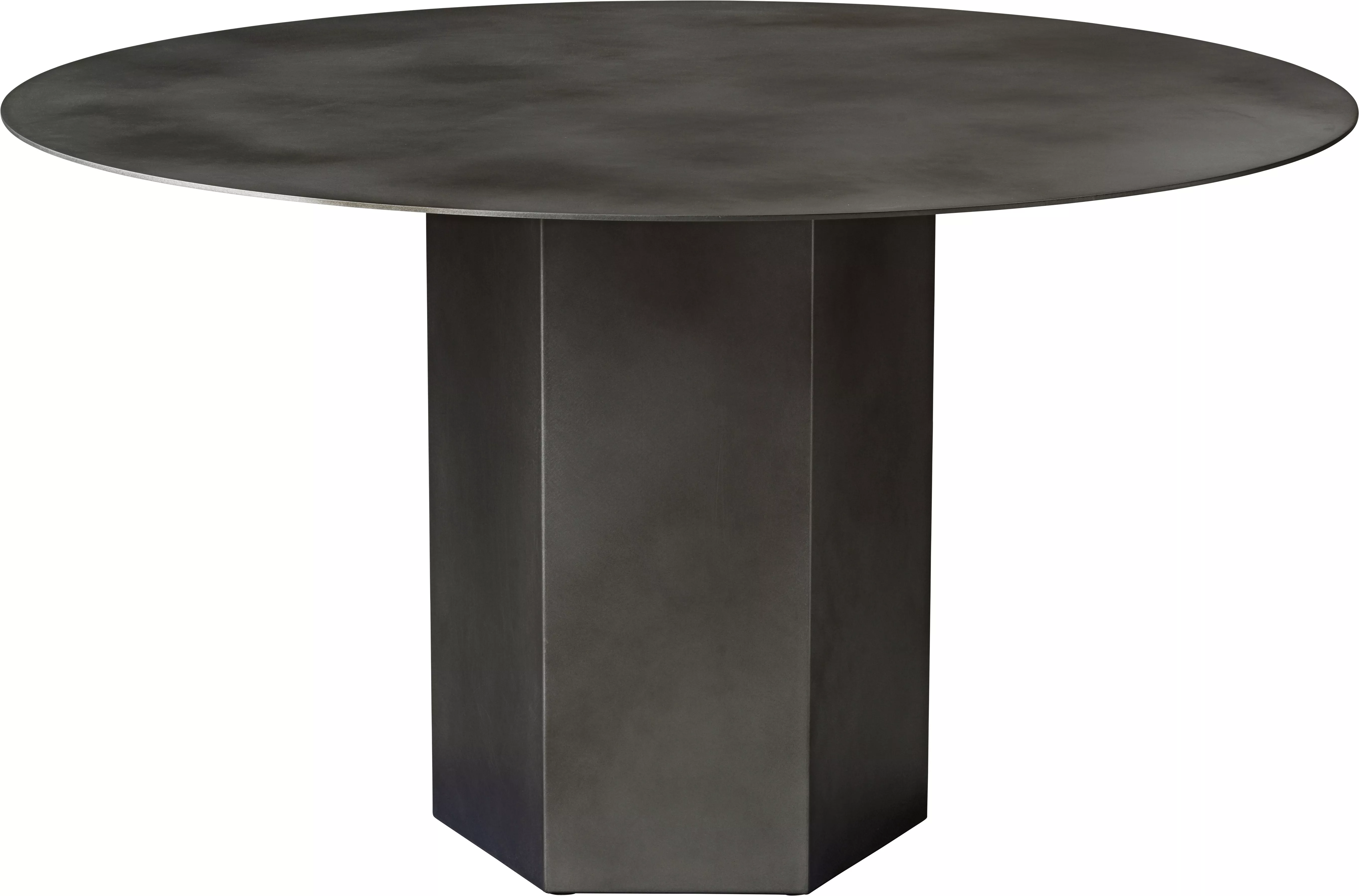 GUBI - EPIC Couchtisch • Rund GamFratesis Epic Table für GUBI, benannt nach den antiken epischen Gedichten, ist ein skulpturales Möbelstück, das von griechischen Säulen und römischer Architektur inspiriert ist. Ursprünglich in Italien aus Travertin gefertigt, markiert diese neue Variante das erste Mal, dass GamFratesi mit Stahlplatten arbeitet. Diese Platten durchlaufen Veredelungsprozesse wie Verzinkung, Lackierung und aufwendige Handfinish-Arbeiten, um jeder Tischplatte eine einzigartige Oberflächenstruktur zu verleihen.Während die monolithische Form des Tisches erhalten bleibt, strahlt er nun einen industriellen Charakter aus und offenbart bei jeder Benutzung neue Details. Diese Kollektion verleiht privaten Räumen Persönlichkeit und bringt ein faszinierendes Gefühl von Gewicht und Haptik in öffentliche und gastfreundliche Umgebungen, in denen robuste Oberflächen außergewöhnliche Haltbarkeit bieten. Die Epic Table Collection bietet verschiedene Höhen und Durchmesser, sodass ein einzelner monochromatischer Tisch eigenständig stehen oder harmonisch in dynamischen Gruppen aus verschiedenen Materialien, Höhen und Farben kombiniert werden kann.Während die monolithische Form des Tisches erhalten bleibt, strahlt er nun einen industriellen Charakter aus und offenbart bei jeder Benutzung neue Details. Diese Kollektion verleiht privaten Räumen Persönlichkeit und bringt ein faszinierendes Gefühl von Gewicht und Haptik in öffentliche und gastfreundliche Umgebungen, in denen robuste Oberflächen außergewöhnliche Haltbarkeit bieten. Die Epic Table Collection bietet verschiedene Höhen und Durchmesser, sodass ein einzelner monochromatischer Tisch eigenständig stehen oder harmonisch in dynamischen Gruppen aus verschiedenen Materialien, Höhen und Farben kombiniert werden kann. Maße: 110 Durchmesser x H34 cmAuswahlmöglichkeit zwischen Stahl und Travertin
