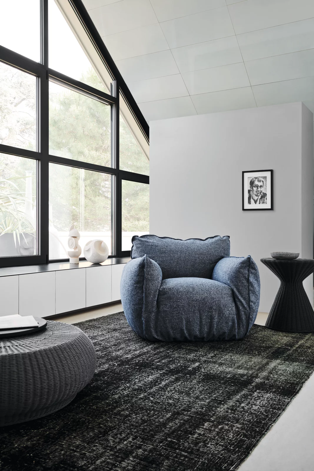 Ein Ort zum Entspannen: Nuvola ist eine Polstermöbelkollektion, bestehend aus Sesseln und Sofas, die sich durch weiche und attraktive Formen auszeichnet. Ihre „mollige“ Linie, die sie zu einer echten Ikone gemacht hat, weist hohe Armlehnen und eine tiefe Sitzfläche auf und empfängt den Gast wie eine Umarmung, ganz wie in einem Kokon. Ein informelles und komplett abziehbares Oversize-Polsterelement, das sein Aussehen je nach Bezug verändert: Wenn die schweren und verarbeiteten Stoffe seine volle Form hervorheben, lehnen sich die leichten Baumwoll- und Leinenstoffe an die Struktur an, als ob sie von der Luft getragen würden.