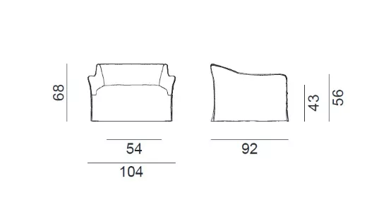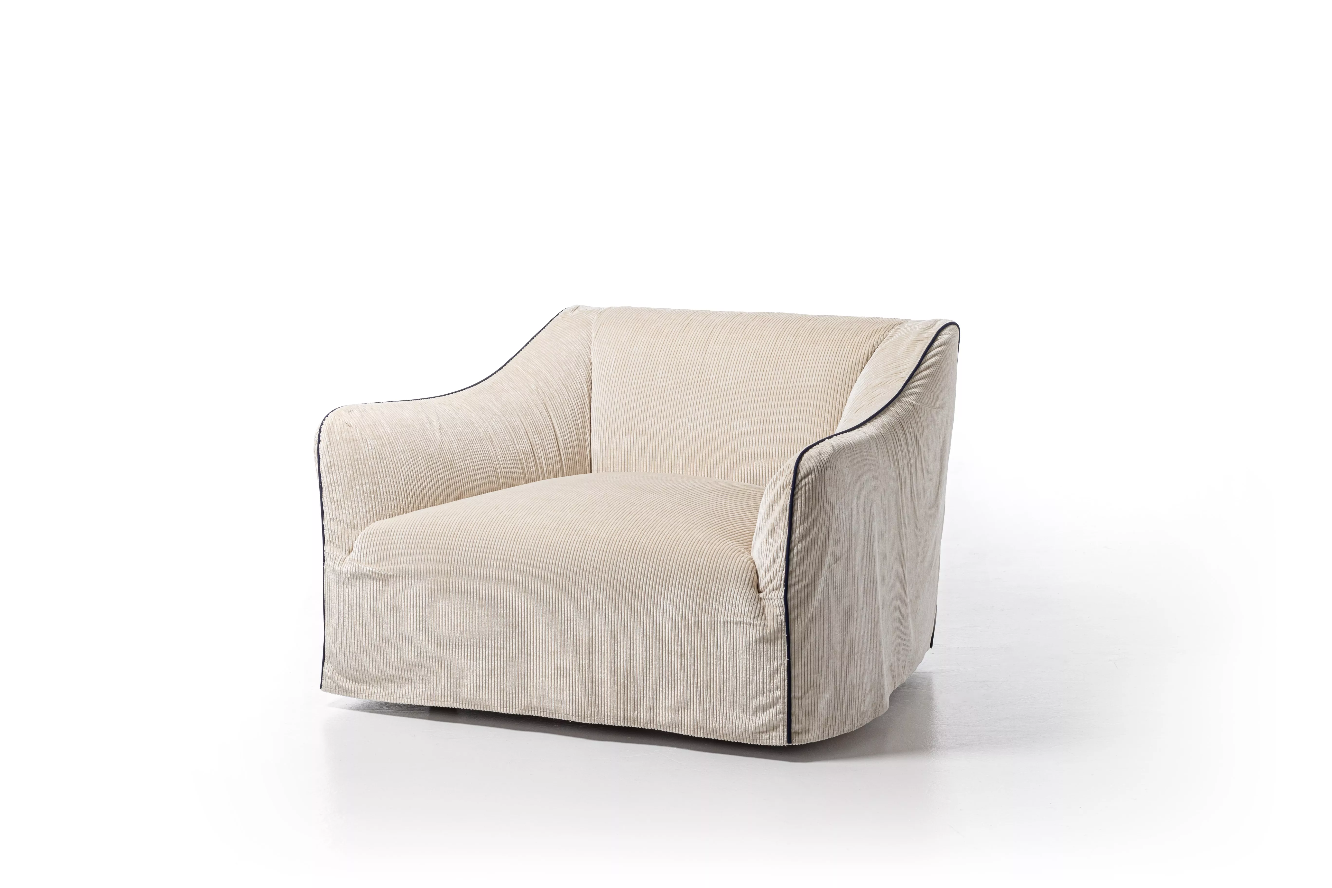 Sessel, Polsterung aus Polyurethan differenzierter Dichte, Sitz mit Taschenfederkern, um Komfort, Weichheit und Langlebigkeit zu verbessern. Rollkissen mit Daunenfüllung. Abziehbare Hussen mit Keder.