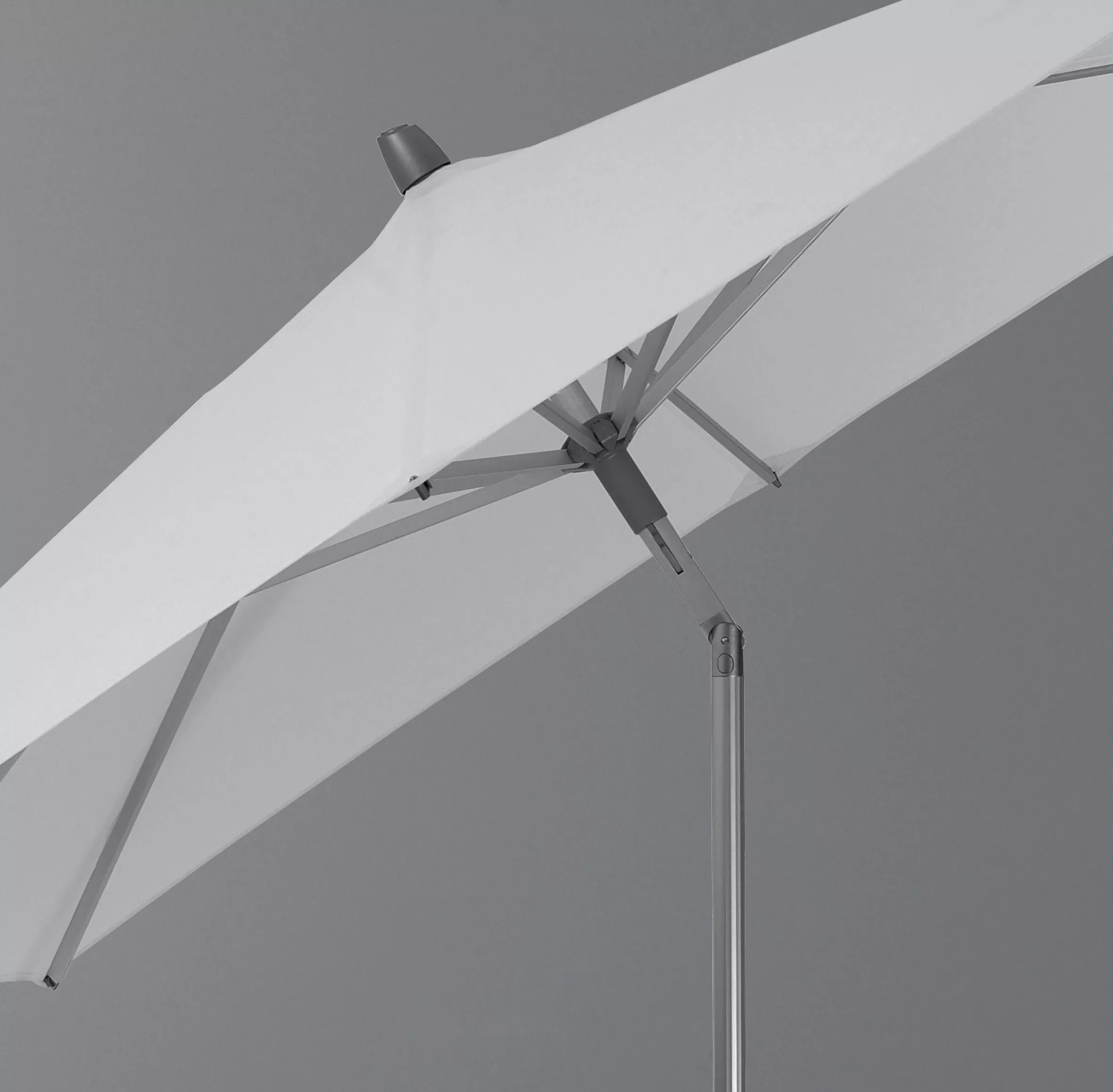 Material und Technik: Das Gestell ist aus Aluminium mit profiliertem Mast, Kurbelantrieb und Drehmechanismus für stufenlose Schrägstellung. Schirmbezug ist auswechselbar und selbstspannend, dank den flexiblen Strebenenden.