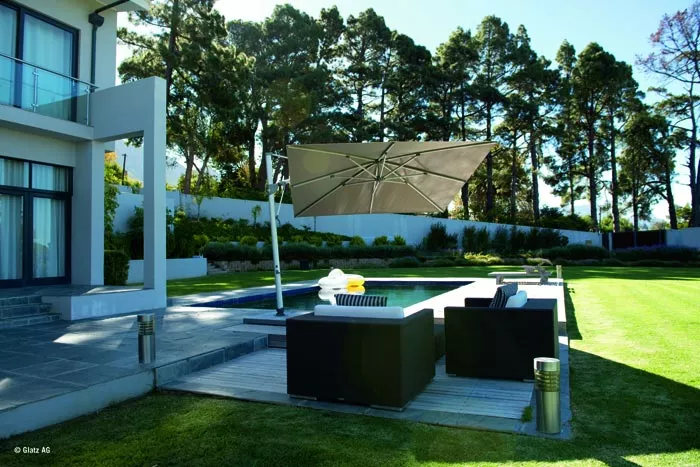 Bedienung: Sie öffnen und schließen Sombrano S+ easy mit der abnehmbaren Handkurbel. Der Kurbelantrieb ist selbstarretierend. Mit der Lenkstange neigen Sie das Schirmdach auf beiden Seiten um 54° in 18°-Schritten. Sombrano S+ easy lässt sich dank kugelgelagertem Drehfuß um 360° drehen.