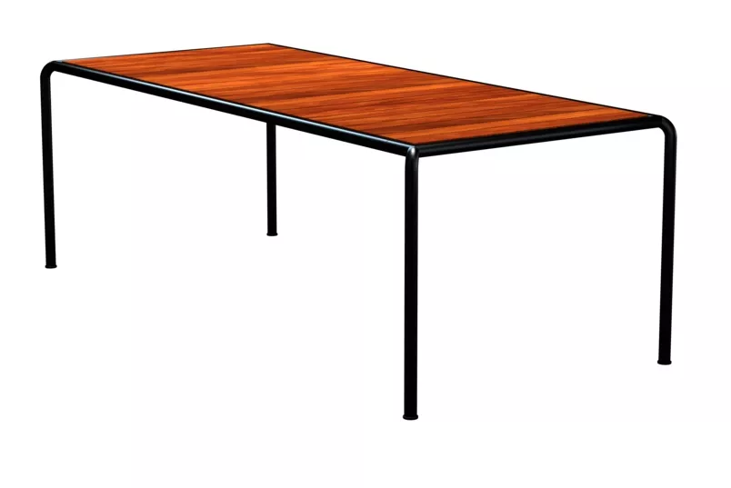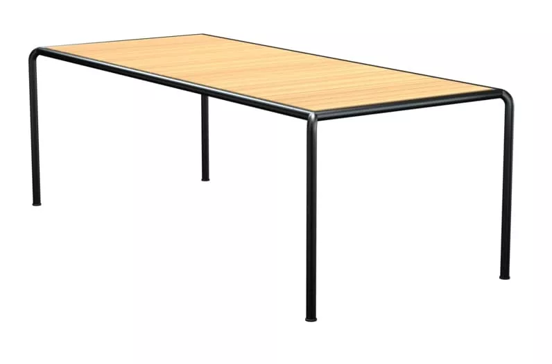 Houe Four Gartentisch • Outdoor Esstisch mit pulverbeschichtetem Aluminiumgestell Die Outdoor Gartentische Houe Four, entworfen von dem Designer Henrik Pedersen, lassen sich vielfältig mit Click Gartenstühlen kombinieren und bilden zusammen eine hochwertige Essgruppe auf Ihrer Terrasse oder im Garten. Das robuste, pulverbeschichtete Aluminiumgestell der Four Kollektion ist mit einem speziell entwickelten Strangpressprofil hergestellt. Die Tischplatte besteht aus gepressten Bambusholzlatten, die besonders pflegeleicht und resistent gegen Feuchtigkeit sind. Die originelle und komfortable Four Gartenmöbel schafft eine leichte, lockere und dennoch hochwertige Atmosphäre. Die klare Formen faszinieren durch eine organische, hochwertige Gestaltung. Der hervorragende Sitzkomfort macht die Four Essgruppe schnell zum Liebling in Ihrem Garten. Aluminiumgestell pulverbeschichtetTischplatte aus Bambusholz, belattetLeicht zu reinigenGanzjährig wetterfest Maße: (B × T × H) 210 × 90 × 74 cm