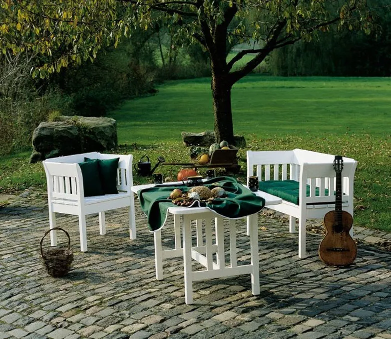 Herrenhaus Philippe Zweisitzer Bank 120 cm Bank Philippe von Herrenhaus, komplett aus hochwertigstem afrikanischen Tola-Holz gefertigt. Das Holz des Tola-Baumes weist einen hohen Gehalt an Harzen und Ölen auf und ist damit hervorragend gegen Verwitterung gewappnet. Es hat eine sehr homogene Struktur und lässt sich gut verarbeiten. Das sind wichtige Faktoren, wenn man - wie bei Herrenhaus - noch traditionelle Techniken des Schreinerhandwerks einsetzt. Aus ökologischer Überzeugung verwendet Herrenhaus nur Holz aus Nutzholzbeständen, deren Wiederaufforstung sichergestellt ist. Auf Wunsch lieferbar mit passender Auflage in Ihrer Wunschfarbe. Philippe ist eine Einladung der exklusiven Art, draußen Platz zu nehmen - wobei die Möbel mit ihrer tiefen Sitzfläche auch in großzügige Wintergärten oder in Wohnräume eine ausgesprochen gemütliche Atmosphäre zaubern. Das Styling ist konsequent geradlinig, der sanfte Schwung in den Oberkanten nimmt den Möbeln jedoch jede Strenge. Und dann wären da noch die dicken Kissen, wahlweise nur für die Sitzfläche, oder zusätzlich auch im Rücken und an den Seiten. Die Polster bieten unendlichen Komfort. Sie sind fest und weich zugleich. Das ist kein Widerspruch! Denn Sie sollen darin nicht versinken. Wir sind sicher - Sie werden gar nicht mehr aufstehen wollen. Drei unterschiedliche Tische in Couchtischhöhe komplettieren das gemütliche Ensemble. Die Esstische der Modellreihe Philippe passen perfekt. Massives Tola-Holz Weiß lackiert UV-beständig Maße (B × T × H) 120 × 50 × 83 cm