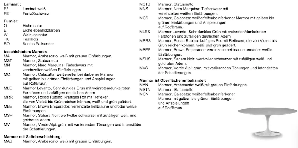 Knoll Studio Saarinen Esstisch • Saarinen KollektionMit der Pedestal Collection hobt sich Eero Saarinen von bisher bestehenden Tischen und Stühlen ab. Die Kollektion ist eine herausragende Leistung des modernen Designs. Wetterbeständige Materialien bereiten den klassischen Saarinen-Tisch auf ein Leben im Freien vor - ein moderner Mittelpunkt für jede Außenumgebung.Gestell: Originaldesign von Saarinen. Schwerer Aluminiumformguss. Schwarze und weiße Säulenfüße sind mit Rilsan geschützt. Tischplatten: Glattes Laminat, Akrylstein, Marmor oder Furnier mit abgeschrägten Kanten. Marmor mit transparenter Polyesterbeschichtung zur Vermeidung von nutzungsbedingten Flecken.Akrylstein ist ein solides Material aus Aluminiumhydroxid, Akrylharz und Naturpigmenten. Das Aluminiumhydroxid verleiht dem Produkt besondere Kraft, die Qualität des Akrylharzes sorgt dafür, dass der Tisch sauber bleibt und deshalb für den Kontakt mit Lebensmitteln geeignet ist; hohe Wasserfestigkeit und Lebensdauer (für den Outdoor-Bereich geeignet).Es bestehen 1 cm Unterschied in der Höhe zwischen den Laminat-Tischen, Holz- und zu den Acrylstein und Marmorplatten, es kommt von der Stärke der Tischplatten. Marmor/Akrylstein = 2 cm stark Laminat-/Furniertischplatte = 3 cm stark Versand: Die Platte und der Säulenfuß werden in getrennten Verpackungen versandt. Hinweis: Das Logo "Knoll" befindet sich auf der Tischunterseite. Ein Namensschild mit dem Logo "Knoll Studio" und der Unterschrift des Designers befindet sich ebenfalls unter der Tischplatte oder der Auflagefläche der Tischplatte.Weitere Informationen entnehmen Sie bitte der Broschüre: Bitte beachten Sie, dass die angezeigten Bilder Illustrationszwecken dienen und von dem tatsächlichen Endprodukt abweichen können.