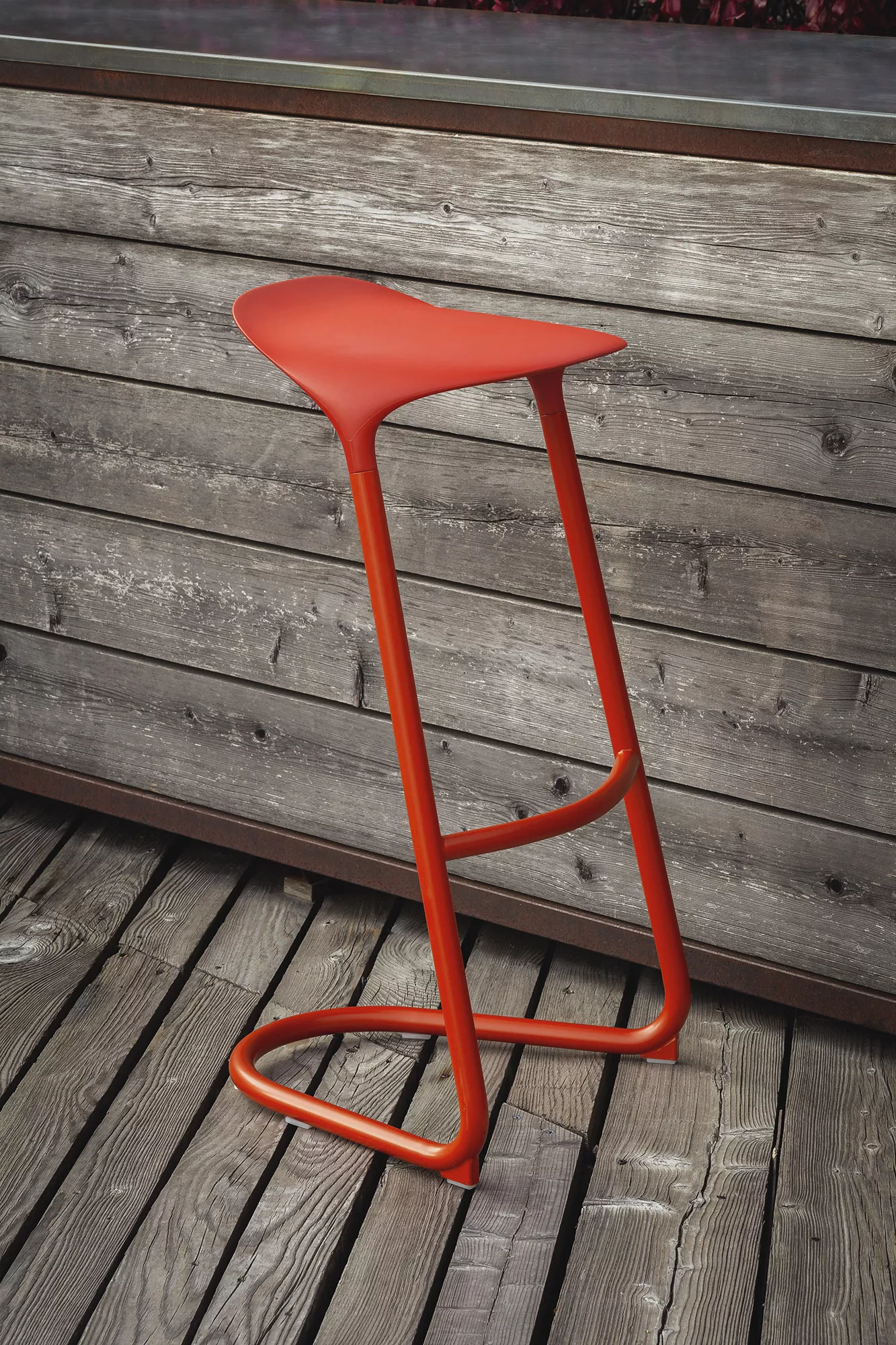 Hocker mit Gestell aus pulverbeschichtetem Stahlrohr. Sitz komplett aus Polyurethan, mit Einlage aus Polyurethanhartschaum. Die Anti-Kipp-Füße sind angesschweißt und passend zum Rahmen lackiert. Gleiter aus Polyethylen.