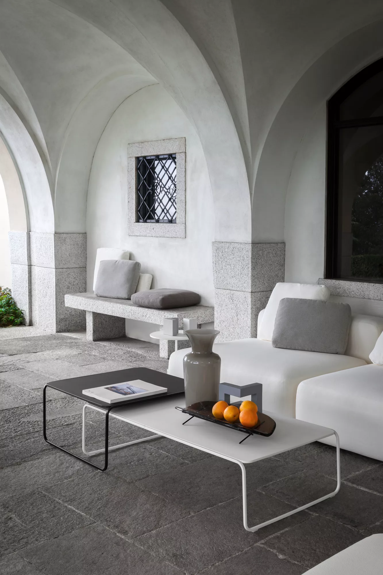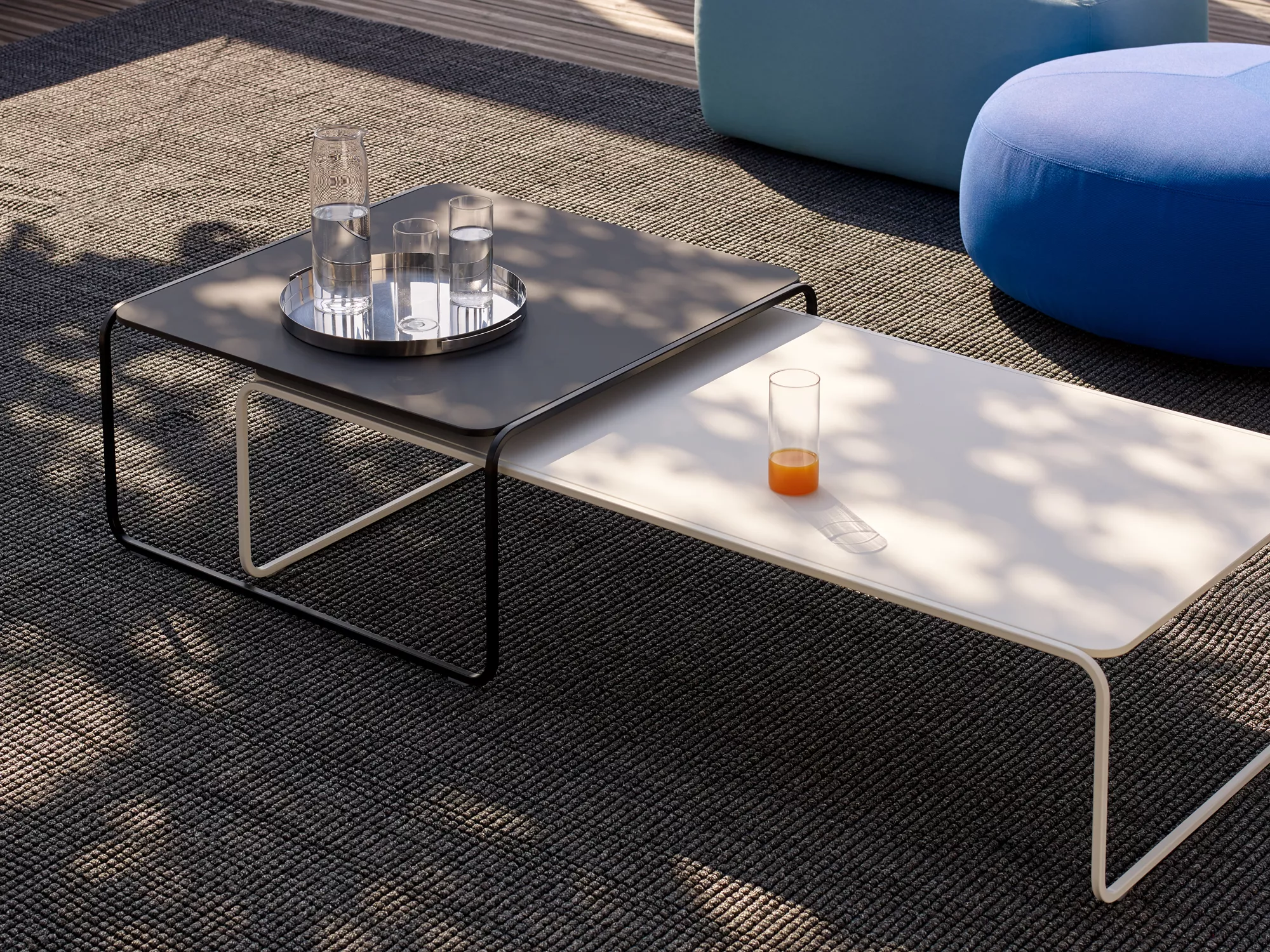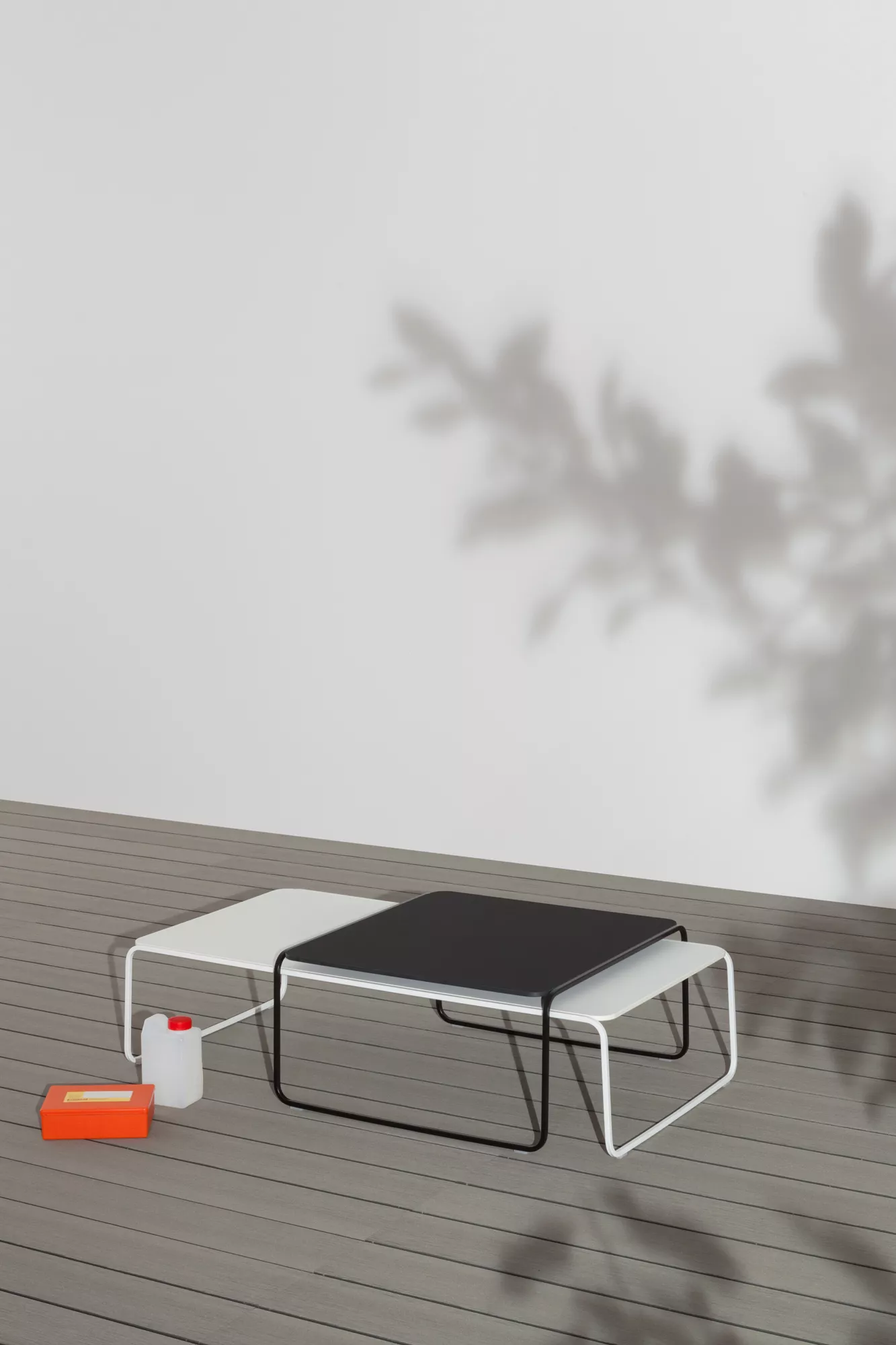 Besonders beeindruckend ist die Kombination des rechteckigen Modells mit dem quadratischen Modell, die den Dialog zwischen Form und Funktion perfekt vollendet. Diese Couchtische verfügen über ein Gestell aus quadratischem Stahlrohr (Aisi 304), das mit einer pulverlackierten Polyesterbeschichtung versehen ist. Sie können problemlos übereinander gestapelt werden und bieten somit flexible Einsatzmöglichkeiten. Die Tischplatten sind 10 mm stark und bestehen aus HPL-Material. Um empfindliche Böden zu schonen, sind Gleiter aus Polyethylen angebracht.
