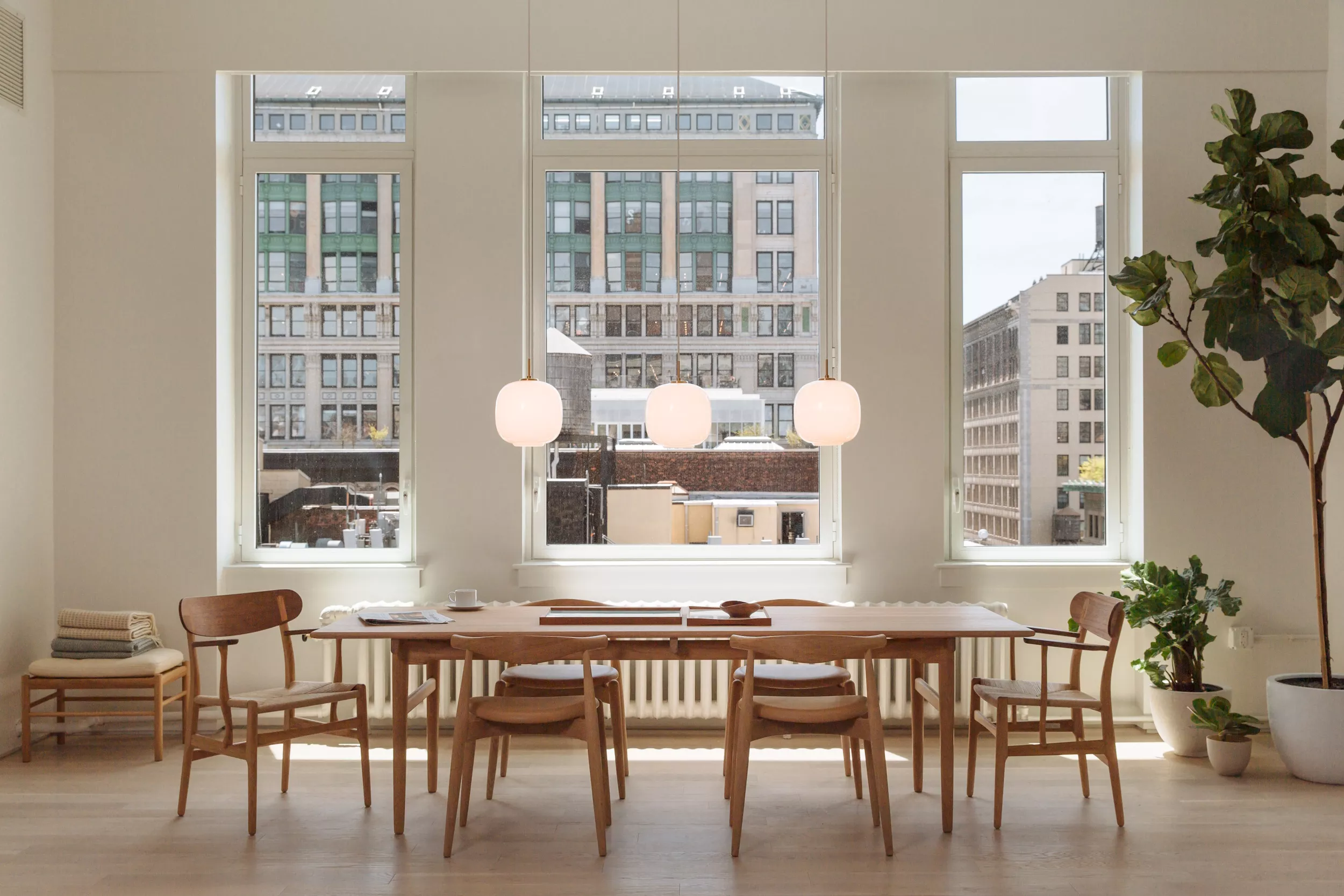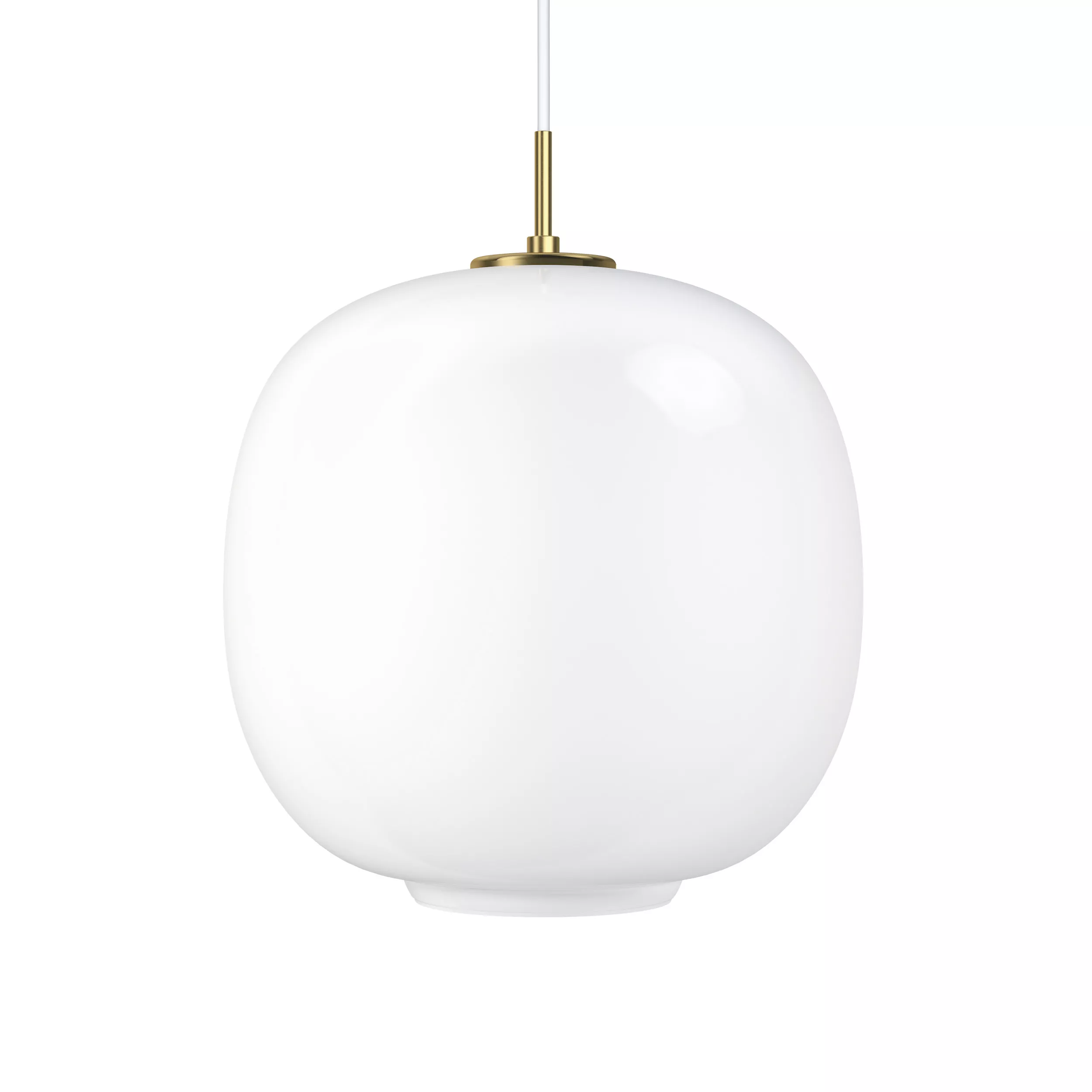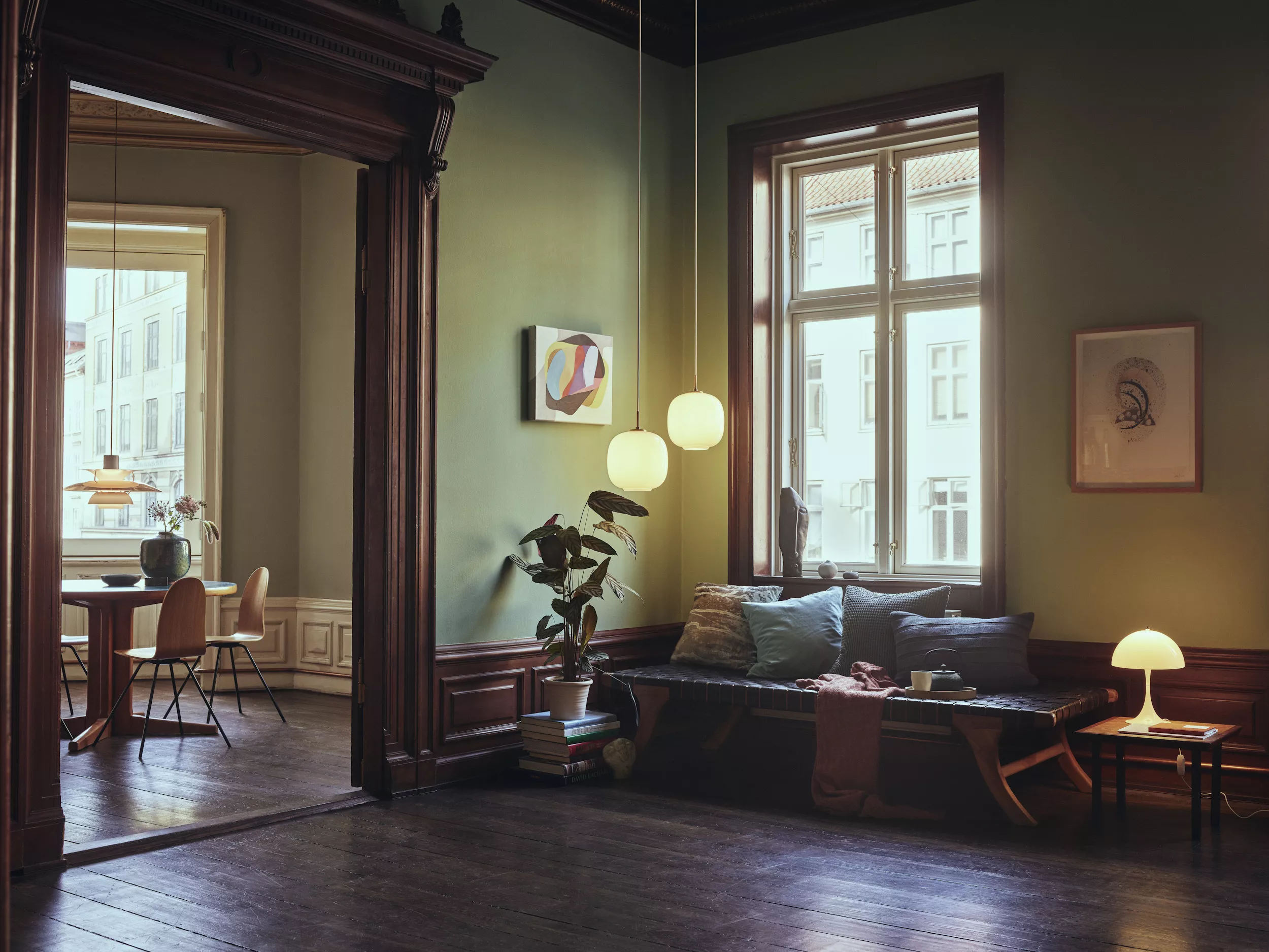 Die VL 45 RADIOHUS Pendelleuchte von Louis Poulsen feierte 2016 ihr Comeback unter dem Namen VL45 Radiohus. Ursprünglich in den 1940er Jahren von dem dänischen Architekten Vilhelm Lauritzen für das dänische Rundfunkgebäude "Radiohus" in Kopenhagen entworfen, präsentiert sie immer noch das Originaldesign: eine Messing-Aufhängung und einen Schirm aus dreischichtigem, mundgeblasenem Glas. Die Pendelleuchte verfügt über eine innere und äußere Schicht aus transparentem, glänzendem Glas, während die Zwischenschicht aus weißem Glas besteht. Im Jahr 2019 wurde die Serie um eine kleinere Version erweitert, um noch mehr Möglichkeiten für vielseitige Anwendungen und Anordnungen zu bieten.