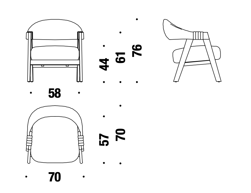- Sitz gepolstert mit Polyurethanschaum unterschiedlicher Dichte und Rückenlehne aus kaltgeschäumtem Polyurethan mit einer internen Holz- Mehrschichtstruktur.