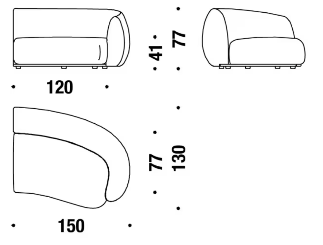 - Gestell / Struktur: Holz- und Stahlrahmen, bezogen mit Polyurethanschaum unterschiedlicher Dichten, kalt injiziertem Polyurethan und Polyesterfaser.