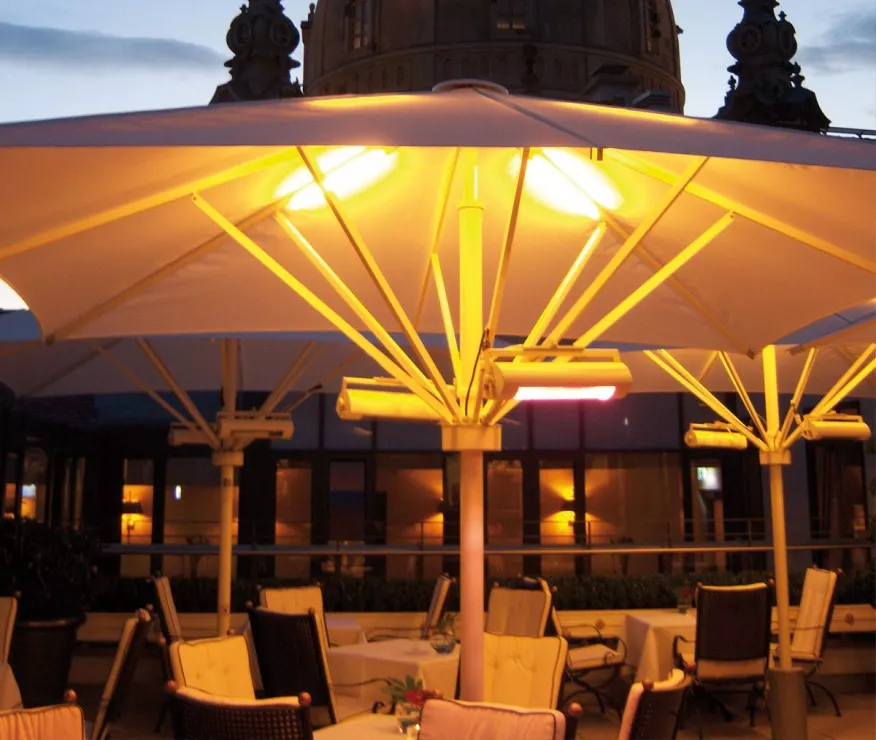 Speziell auf die Außengastronomie zugeschnitten, bietet dieses Schirmkonzept exklusive Atmosphäre auf großer Fläche.