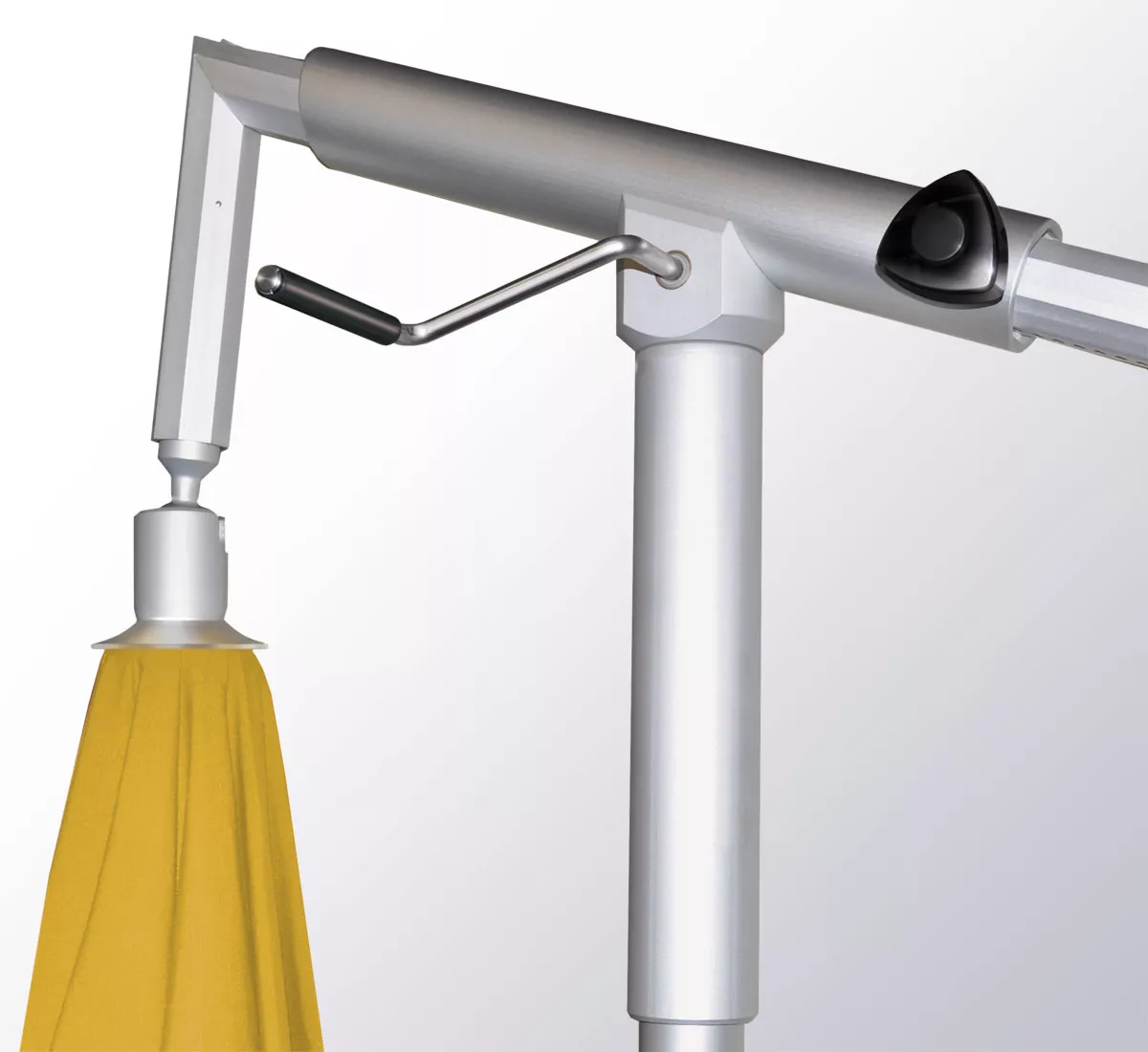 Der serienmäßige Einbau einer Gasfeder im Schirmmast (bei DG und DK) bietet eine komfortable Hebehilfe bei der Höhenverstellung (Vertikale). Zudem kann der Schirm optional mit einer horizontalen Verstellung des Kragarmes durch eine Kurbelbedienung geordert werden (bei DK).