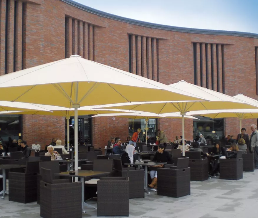 Bei Tests im Windkanal konnten wir die Stabilität und hohe Standfestigkeit unserer Schirme unter Beweis stellen. So konnten selbst Windgeschwindigkeiten von 50 km/h einem Schirm mit Ø 5 m nichts anhaben. Wichtig ist, dass der Standrahmen je nach Windanfälligkeit des Aufstellungsortes entsprechend beschwert wird.