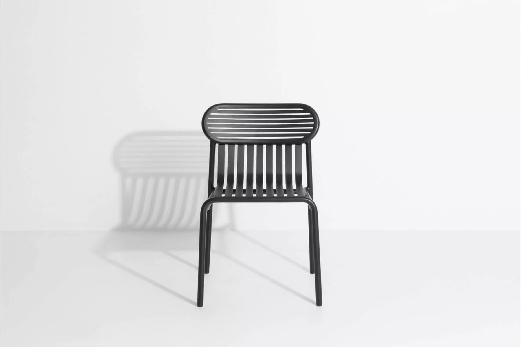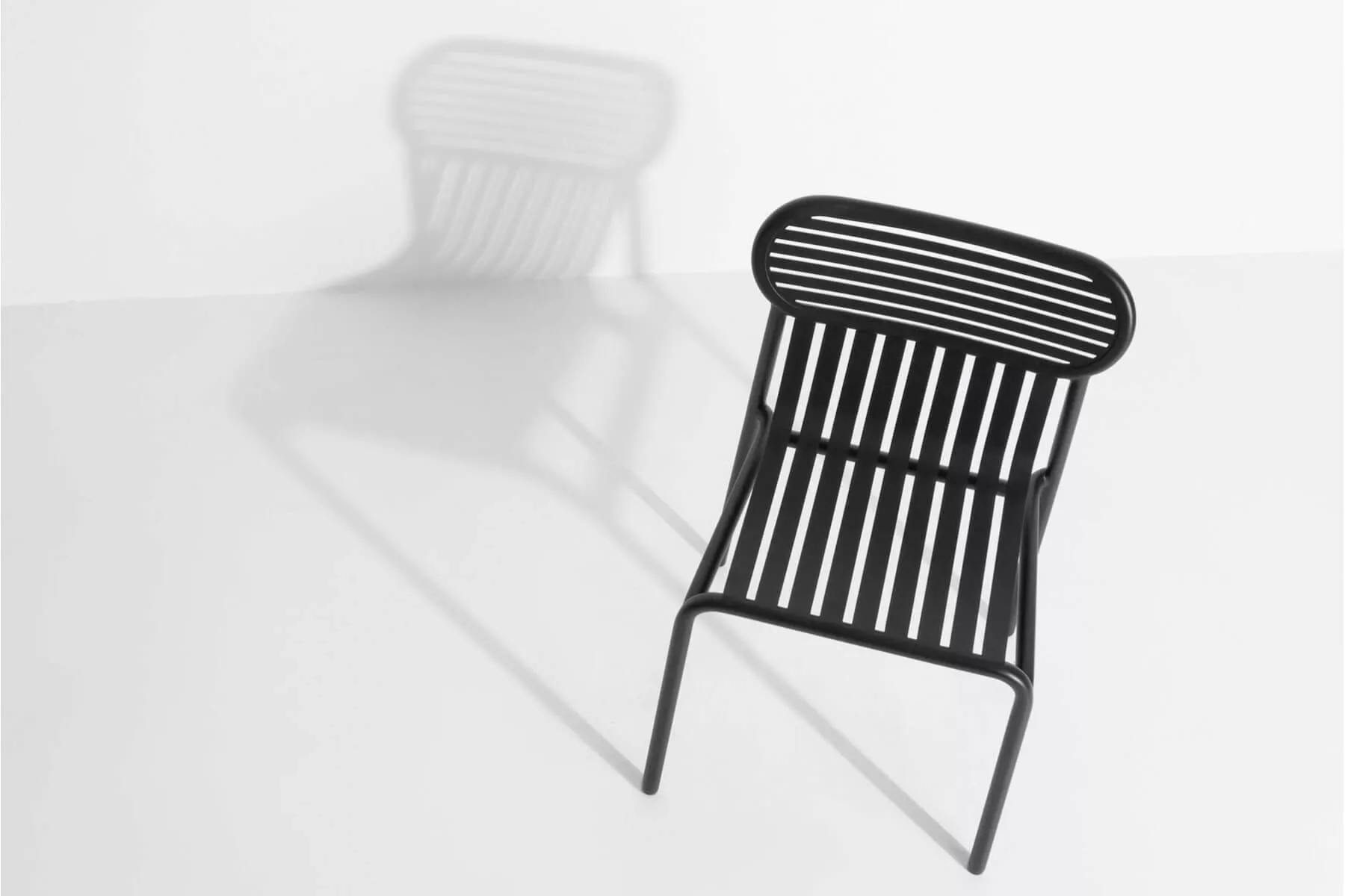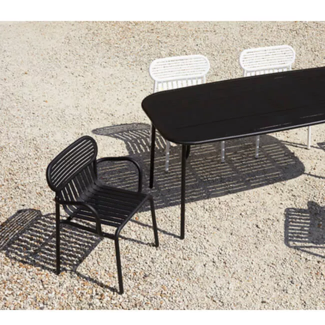 The range includes a chair, a bridge chair, a low armchair, a bench, a bistrot table, big tables for 8 and 12 persons, a coffee table, a sunbed, a bar table and a stool, and a kid's range. Designed for an easy use all chairs and tables are stackable. The oval and encircled shape draws the back rests as a graphic sign. The work of horizontal and vertical slats as stripes underlines the heights and the space, asserting the identity of the collection.