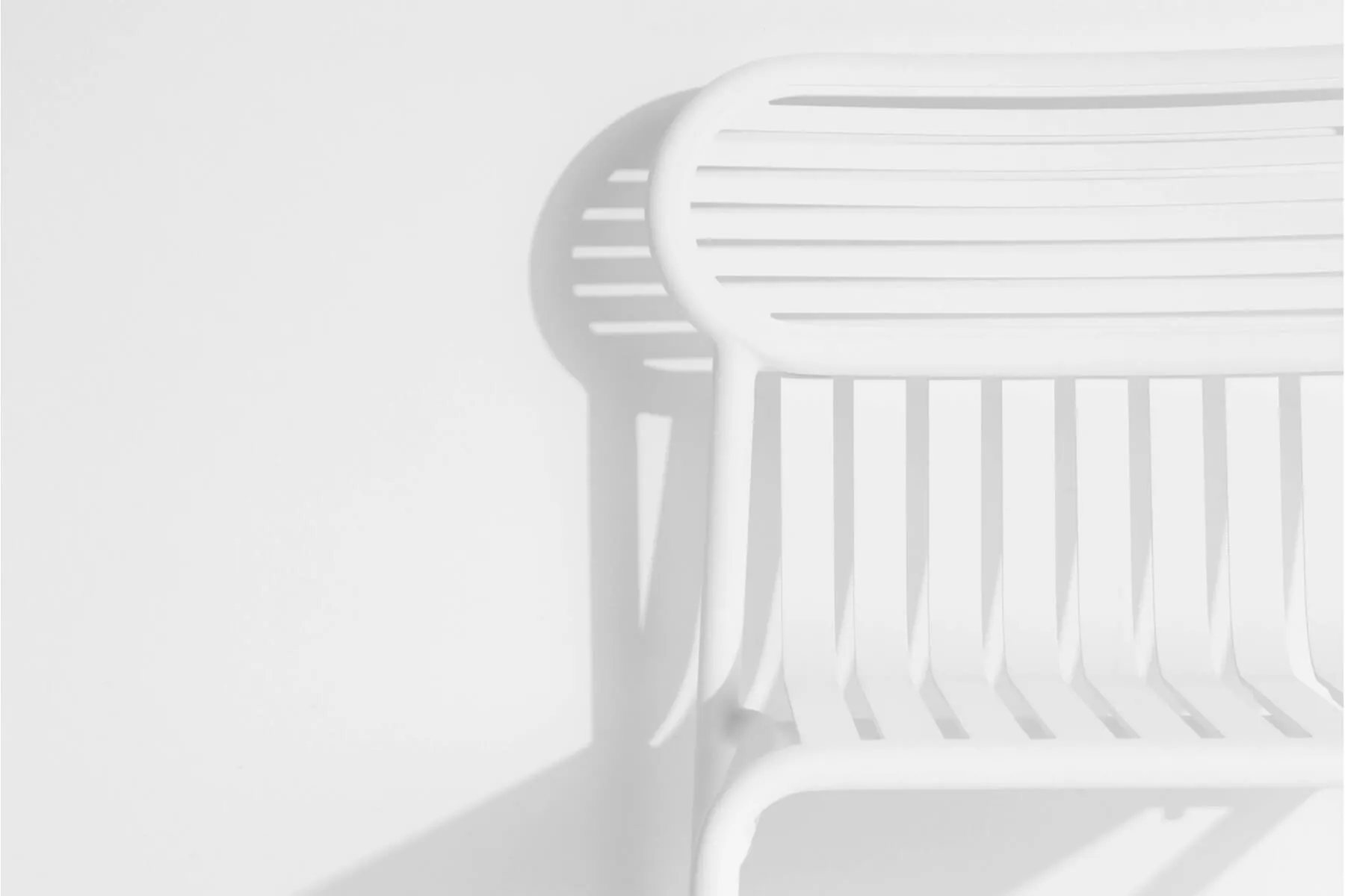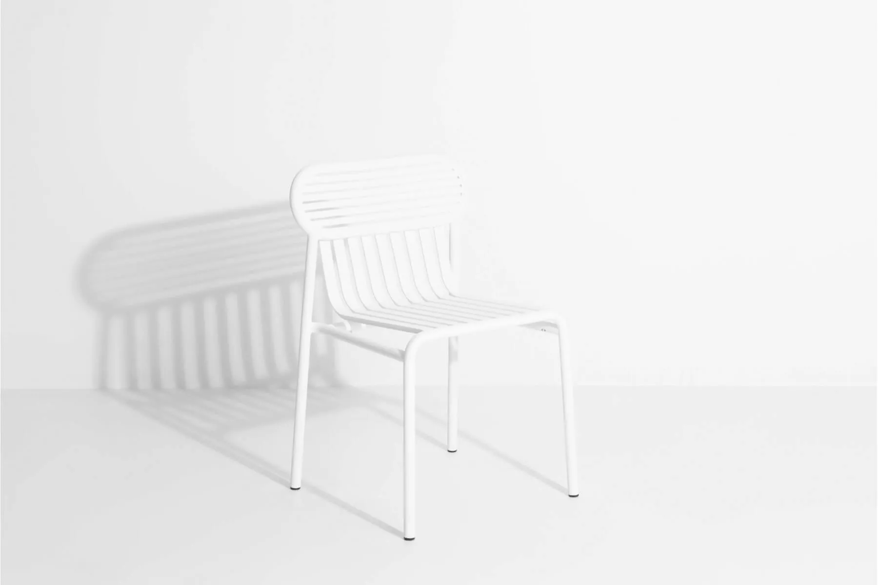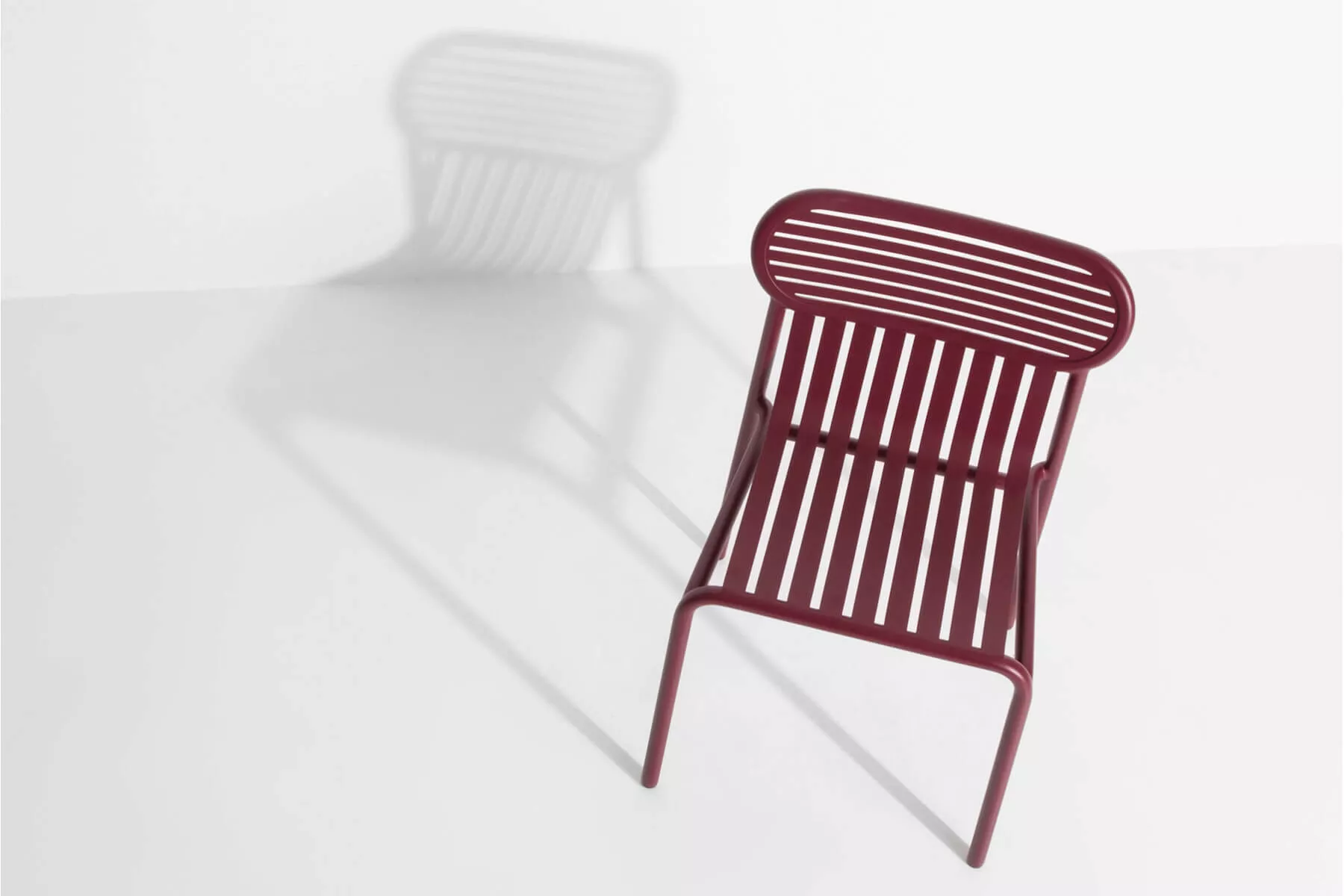 The range includes a chair, a bridge chair, a low armchair, a bench, a bistrot table, big tables for 8 and 12 persons, a coffee table, a sunbed, a bar table and a stool, and a kid's range. Designed for an easy use all chairs and tables are stackable. The oval and encircled shape draws the back rests as a graphic sign. The work of horizontal and vertical slats as stripes underlines the heights and the space, asserting the identity of the collection.