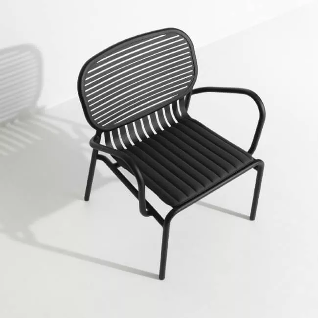 Es handelt sich um einen neuwertigen Outletartikel! Ausführung in Schwarz Petite Friture Week-end Sessel • 2 Stück The WEEK-END collection is a full range of outdoor furniture. Designed with practicality in mind, all of the seats are stackable. The oval and circular shape drawn by the backrests makes them a graphic statement. The impact of the horizontal and vertical slats, so similar to stripes, highlights the full and empty spaces, asser ting the identity of the collection. Optional: cushions in two different colours. The cushions are suitable for outdoor use with high UV resistance (to be removed in bad weather conditions) and are made of hot pressed foam+textile sandwich and HR 35 foam insert for a better comfort. Produkteigenschaften: Gestell: Aluminium ideal für Terasse, Balkon oder Garten ganzjährig wetterfest Sitzhöhe: 45 cm Maße: B62 x T64 x H77 cm Gewicht: 5 kg