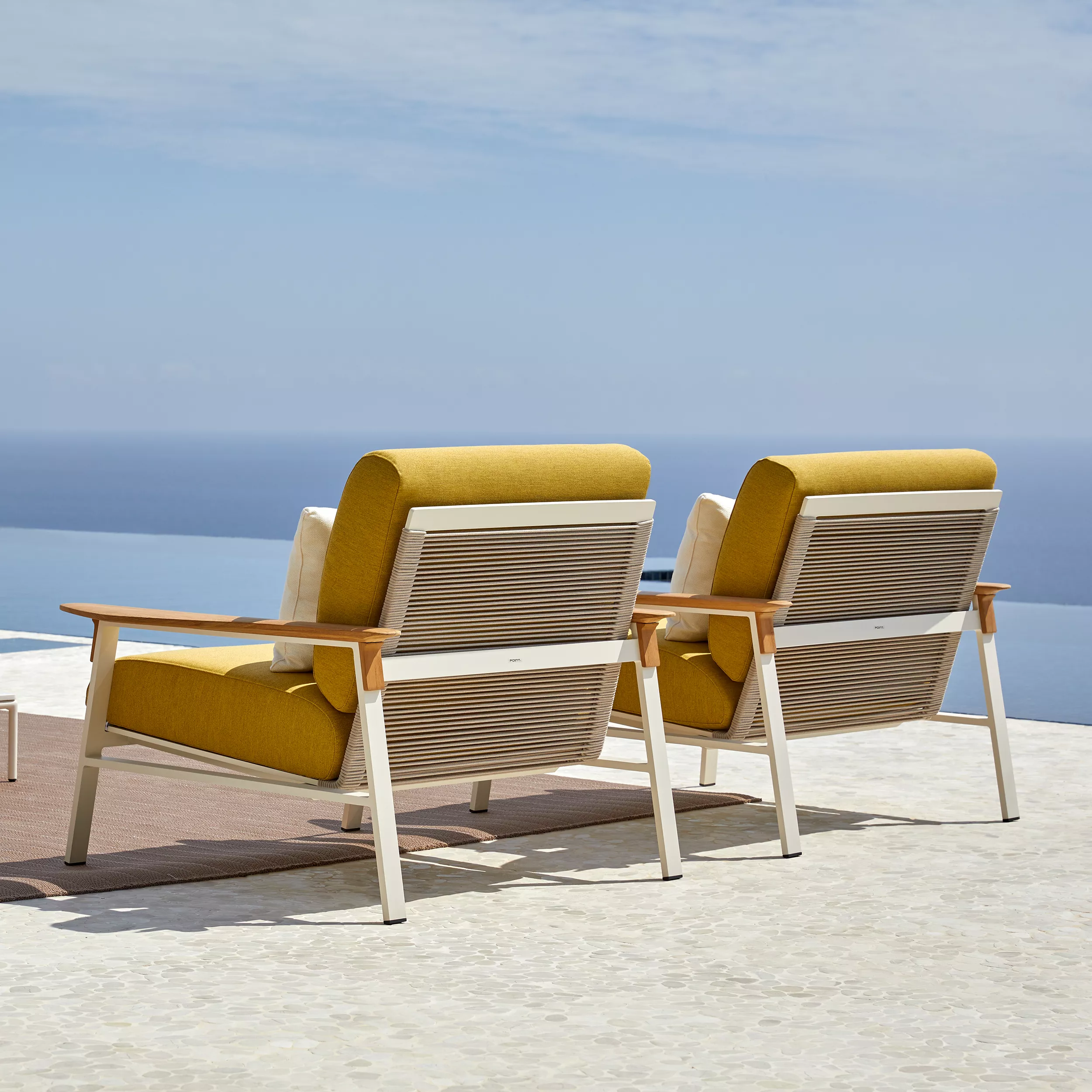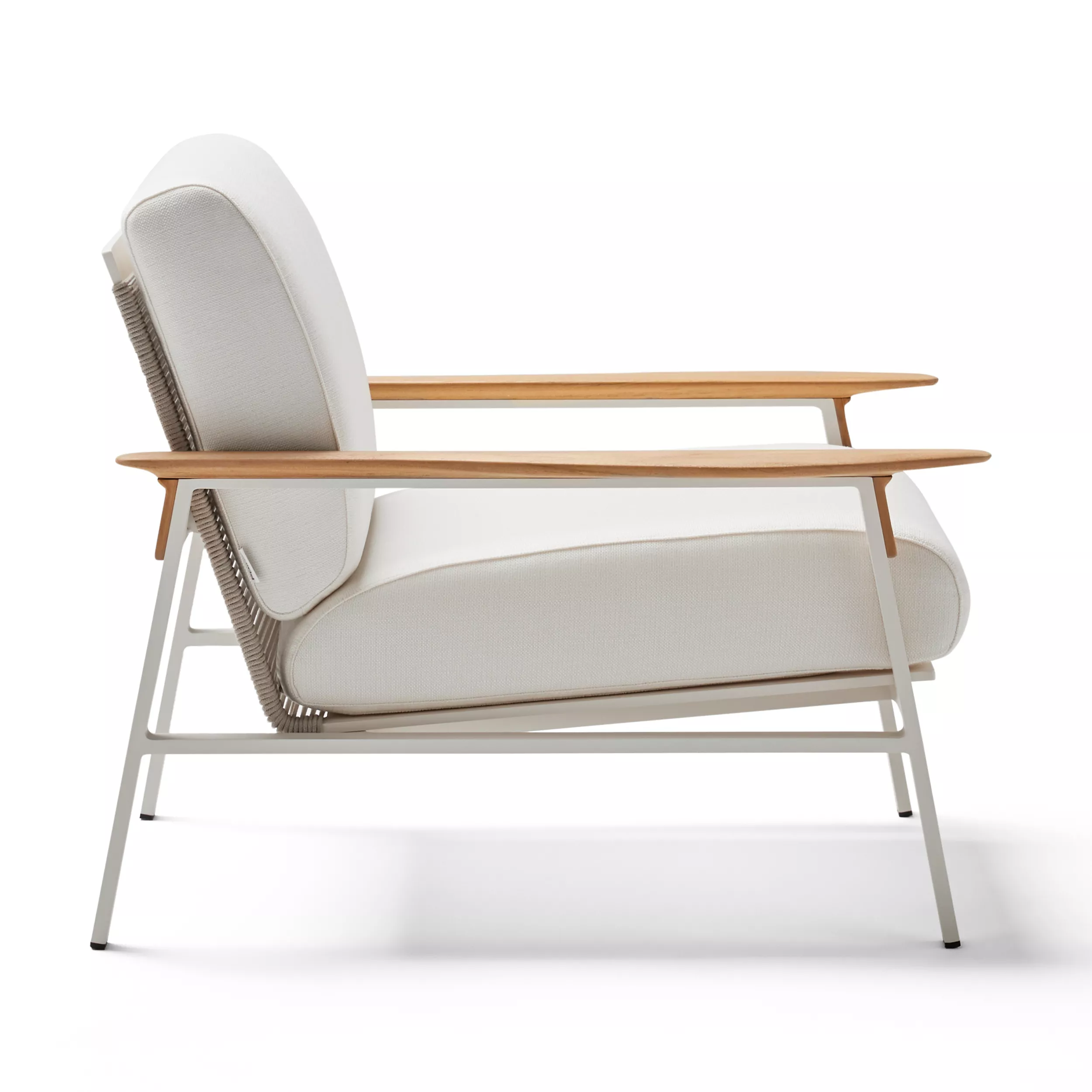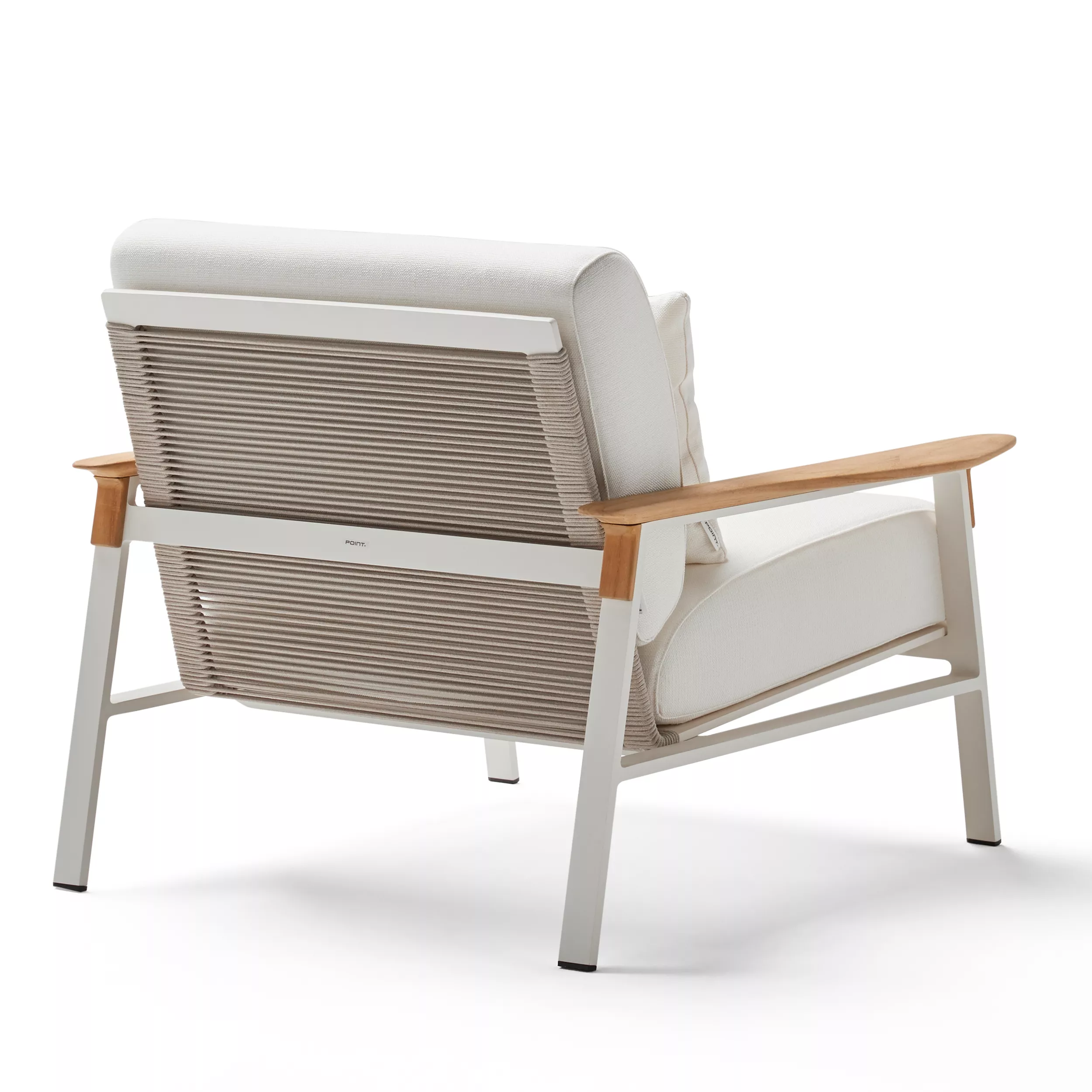Der Loungesessel aus der Point 1920 City-Kollektion ist in drei Farben erhältlich. Die Rückenlehne ist mit dem farblich passenden 4mm Rope bespannt, das die Lounge auch von der Rückseite zu einem Hingucker macht. Die Armlehne aus Teakholz rundet das Bild der edlen Lounge ab und unterstützt den Komfort der Sitzpolster, die es in vielen tollen Farben und Stoffen gibt.