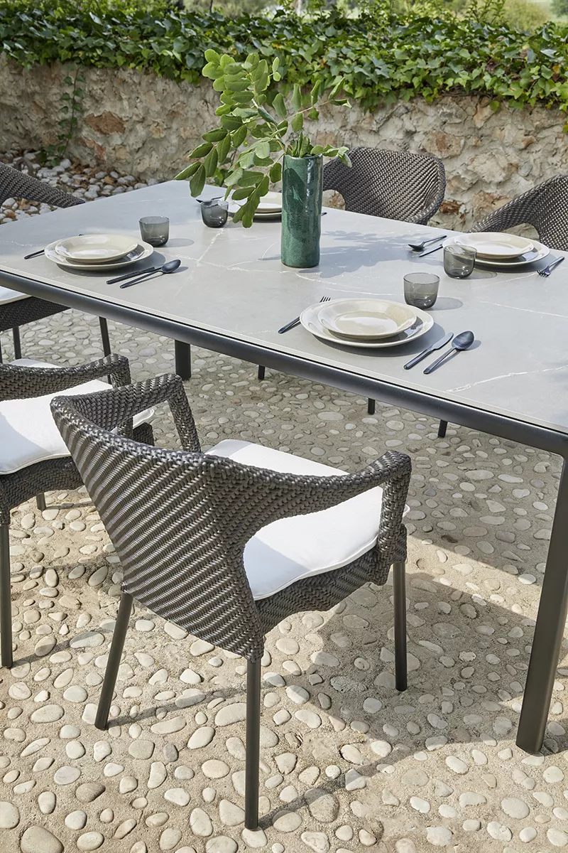 Der Esszimmerstuhl Caddie ist ein stapelbarer Esszimmerstuhl, der durch sein elegantes und modernes Design besticht. Die Struktur des Sessels besteht aus lackiertem Aluminium, das mit einer 6 mm dicken, ovalen Shintotex-Faser umflochten ist. Diese von POINT entwickelte recycelbare Faser ist in zwei Farben erhältlich: 03 getoastet und 36 elfenbein. Außerdem gibt es eine schwarze Variante, die sich nahtlos in jede moderne Umgebung einfügt.