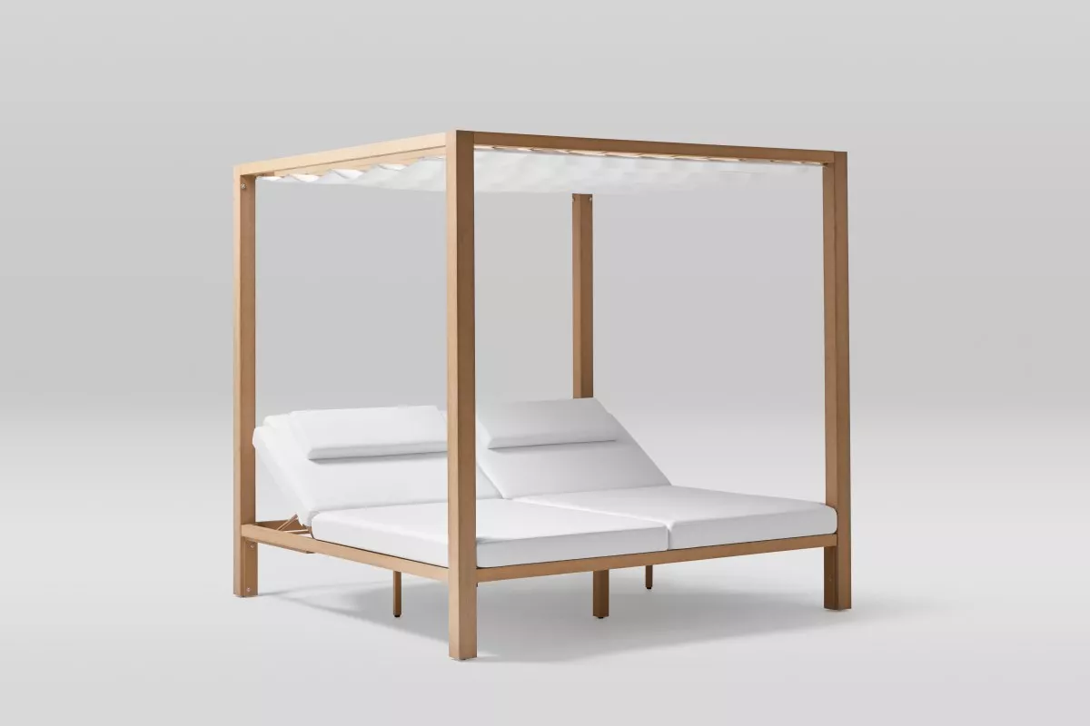 Das Gestell der Doppelliege Kahn besteht aus TechTeak, einem Material, das für seine Langlebigkeit und Witterungsbeständigkeit bekannt ist. Es verbindet die natürliche Schönheit des Teakholzes mit moderner Technologie zu einer robusten und pflegeleichten Struktur.