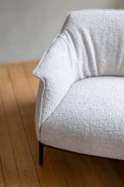 Der Archibald Sessel ist mit Pelle Frau®-Leder oder abnehmbarem Stoff erhältlich, mit kontrastierenden Nähten bei der Lederausführung und Ton-in-Ton bei der Stoffausführung. Die tragende Struktur ist aus Stahl, während die Polsterung aus Polyurethanschaum besteht, auf den an den Stellen, an denen mehr Komfort benötigt wird, Polyesterwatte aufgebracht ist. Der Unterbau besteht aus vier Aluminiumgussfüßen und einem Stahlrohrrahmen, der in verschiedenen Finishs erhältlich ist. Die Federung wird durch elastische Bänder erreicht.