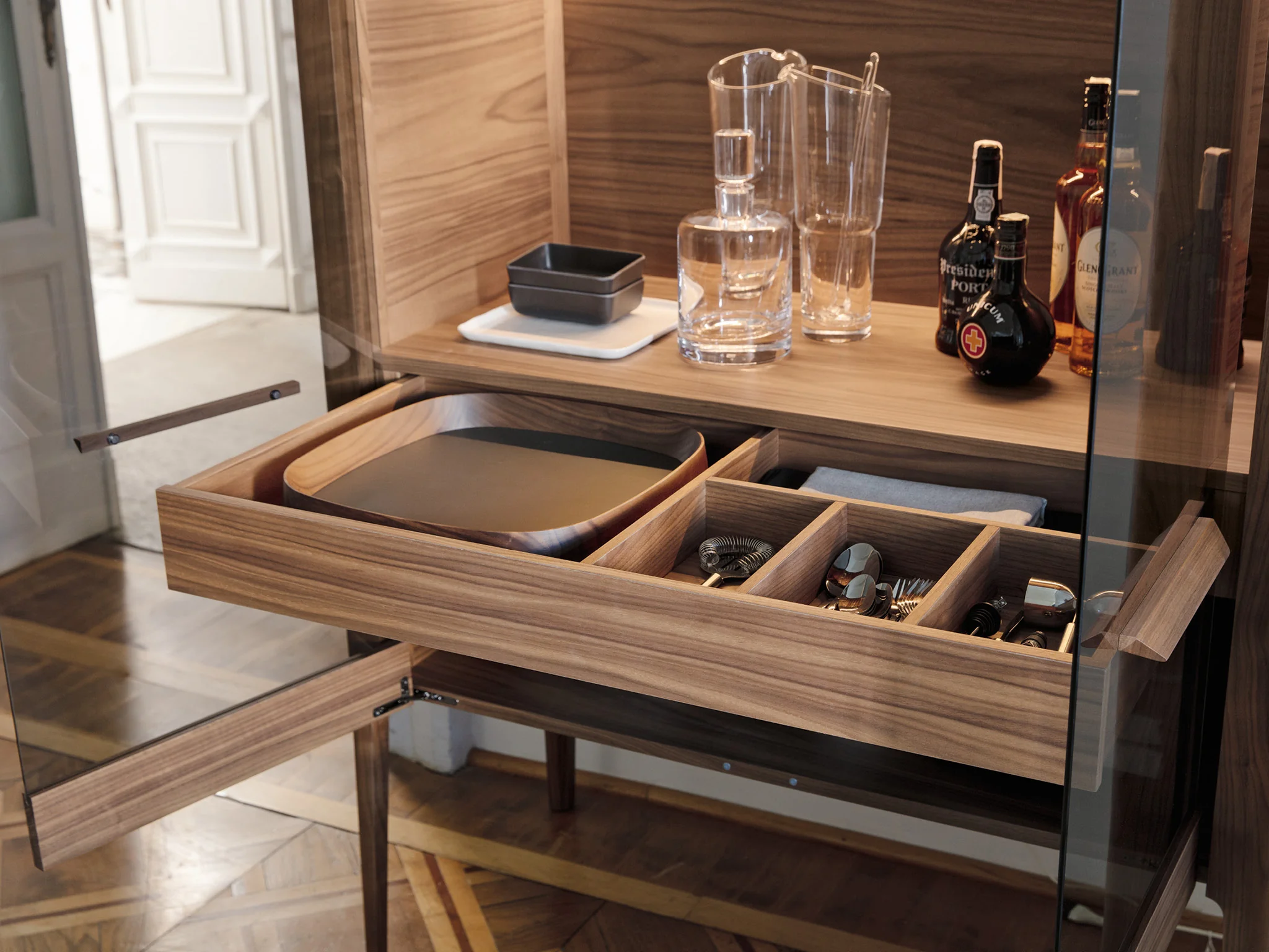 Die obere Abdeckplatte besteht ebenfalls aus hochwertigem Holz und rundet das Design perfekt ab. Der Innenraum des Atlante Bar ist sorgfältig durchdacht: Drei separate Fächer bieten ausreichend Platz zur stilvollen Aufbewahrung von Gläsern und Barzubehör. Zusätzlich sorgen Schubladen mit Soft-Close-Funktion für ein sanftes und geräuschloses Schließen.