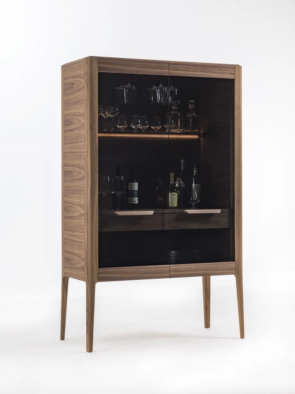 Der Atlante Bar Barschrank von Porada ist ein stilvolles Möbelstück, das Eleganz und Funktionalität in sich vereint. Gefertigt aus edlem Nussbaum Canaletta oder Esche, verleiht dieser Barschrank jedem Raum eine luxuriöse Note. Die zwei Türen aus Rauchglas ermöglichen einen dezenten Blick ins Innere und sorgen gleichzeitig für einen eleganten Kontrast zur warmen Holzstruktur.