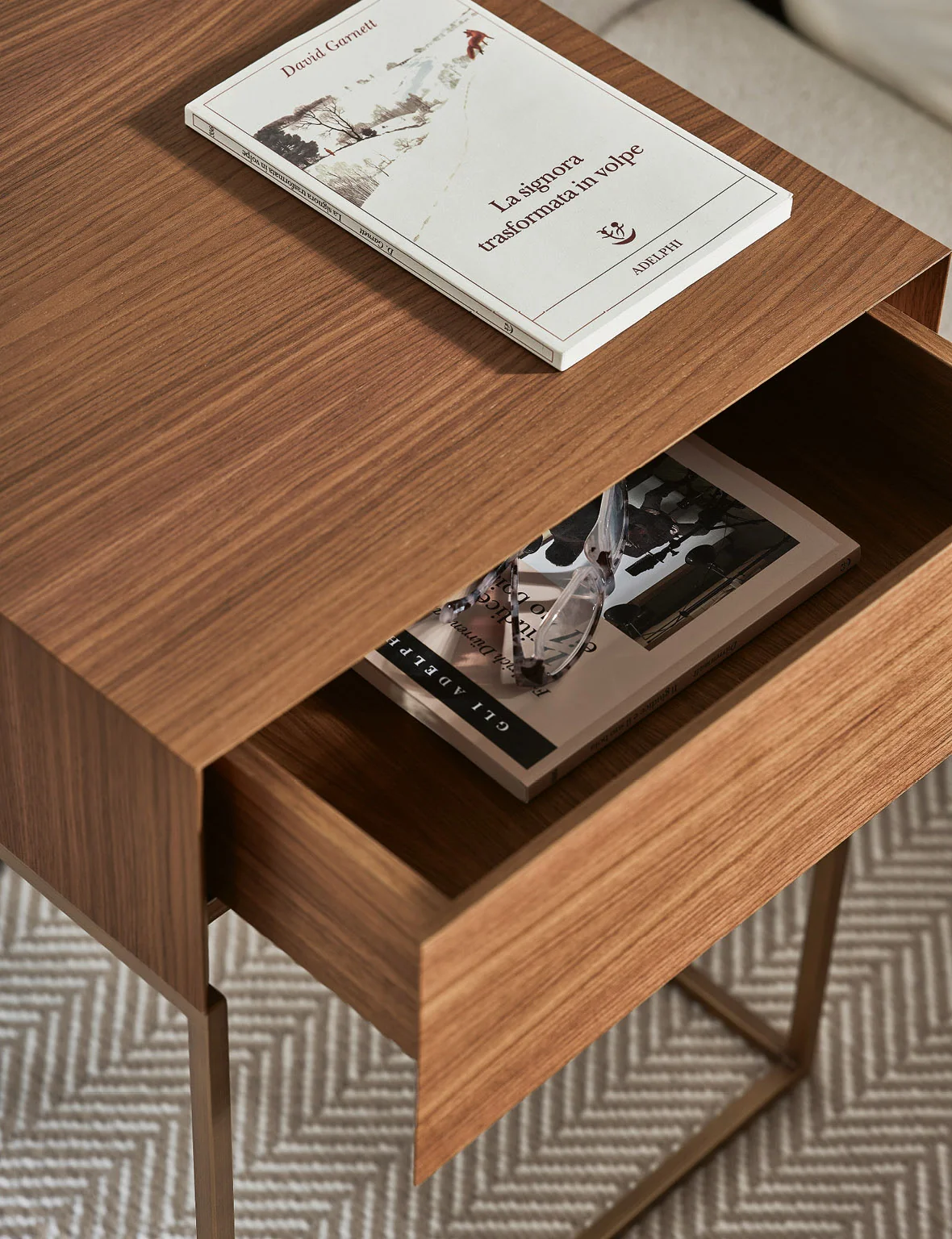 Der Baby Nachttisch von Porada vereint formschönes Design mit funktionaler Vielseitigkeit. Dieser elegante Beistelltisch oder kleine Kommode überzeugt durch seine klare Linienführung und die Verwendung edler Materialien. Das Metallgestell verleiht dem Möbelstück eine filigrane, moderne Note, während die Tischplatte aus hochwertigem Nussbaum Canaletta Wärme und natürliche Eleganz ausstrahlt.