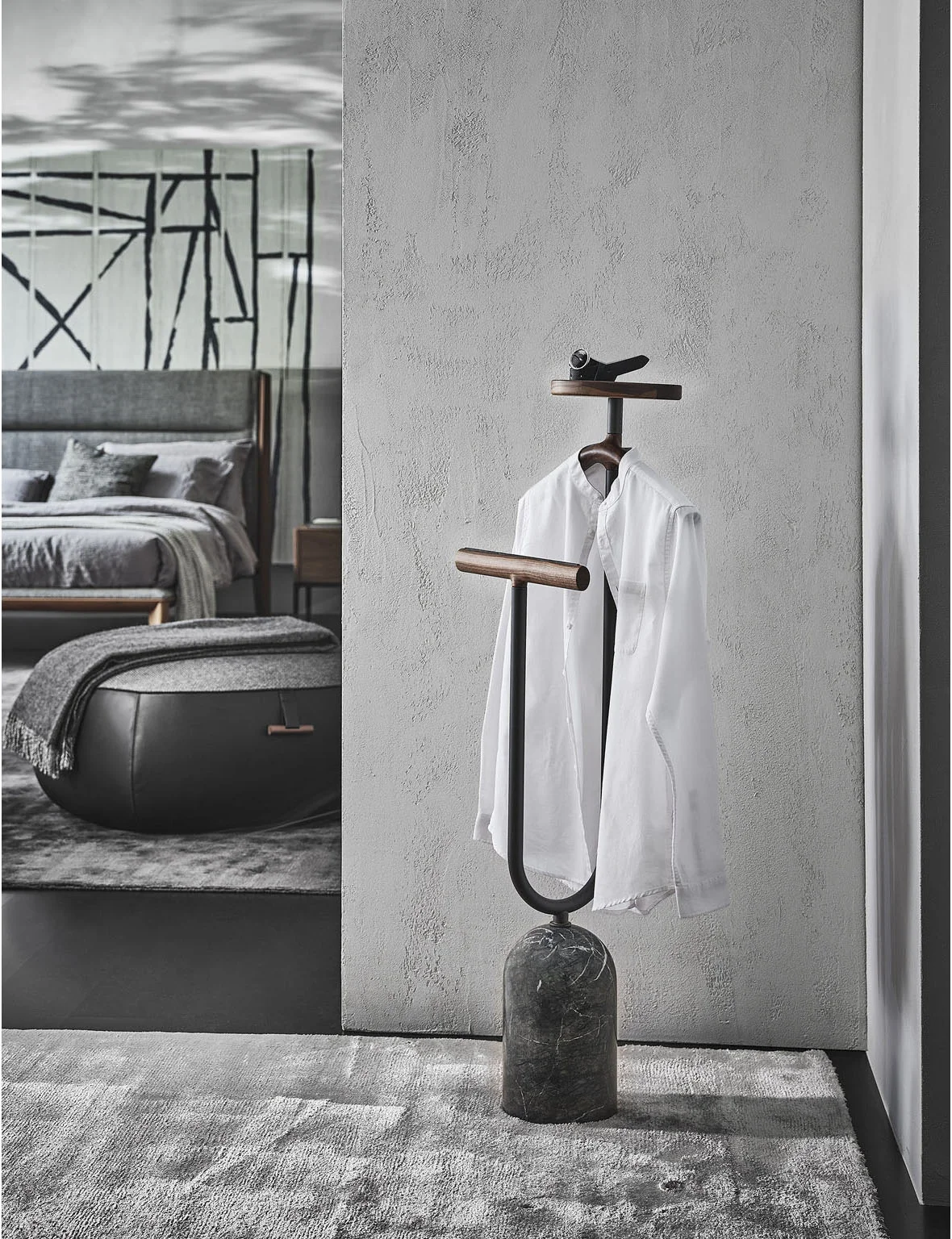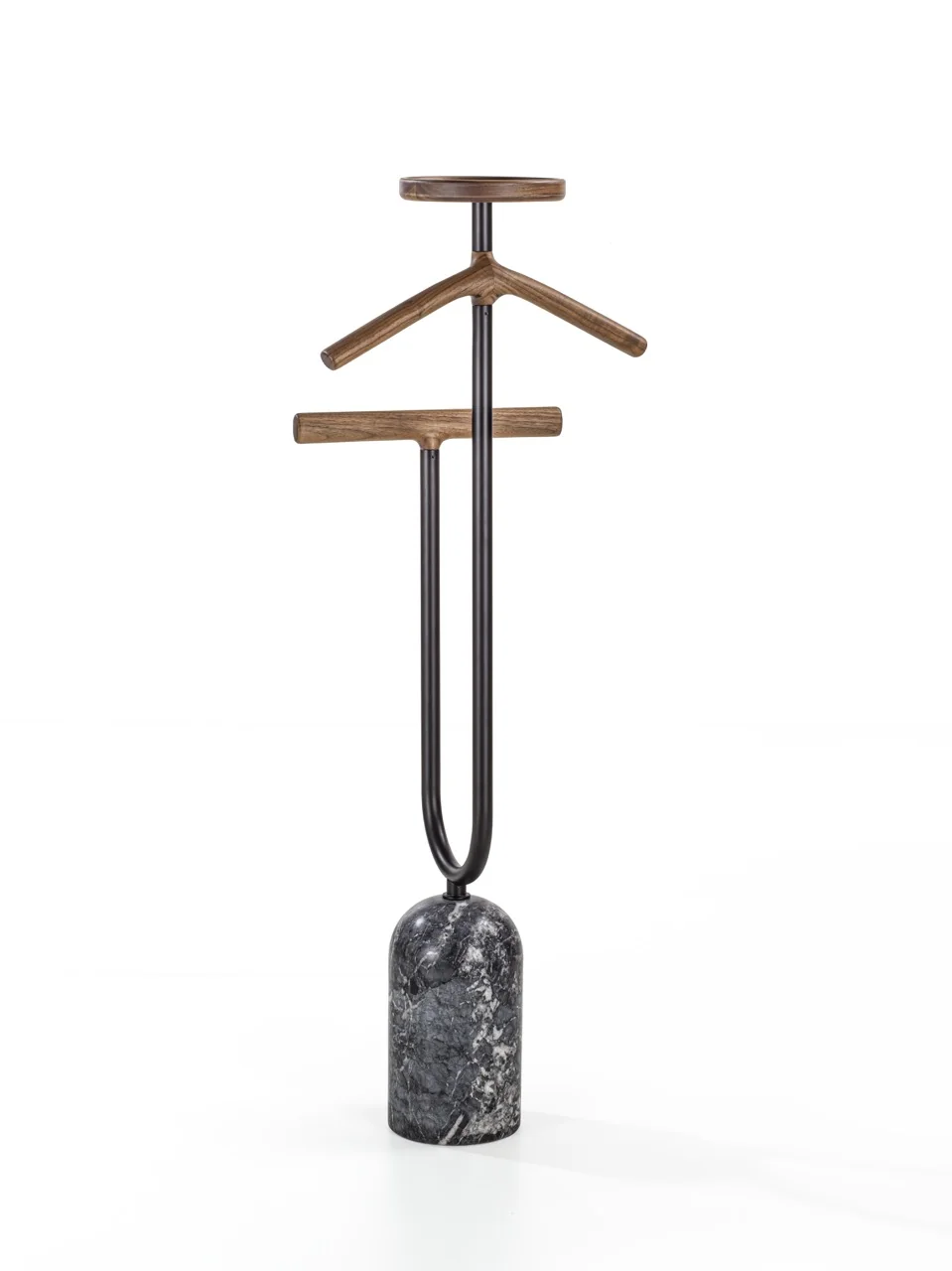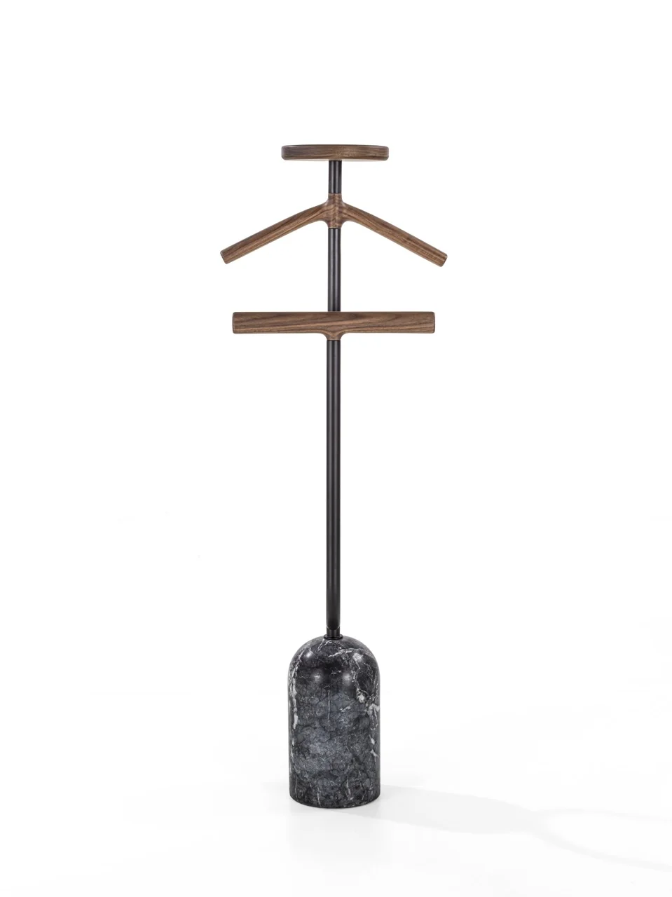 Gefertigt aus edlem massivem Nussbaum Canaletta, strahlt der Ekero Kleiderständer natürliche Wärme und Eleganz aus. Die zylindrische Basis aus hochwertigem weißem Carrara-Marmor oder Carnico-grauem Marmor sorgt für Stabilität und verleiht dem Möbelstück einen Hauch von Luxus. Das schlanke Gestell aus zinngrau lackiertem Metall setzt einen modernen Akzent und fügt sich nahtlos in verschiedenste Einrichtungsstile ein.