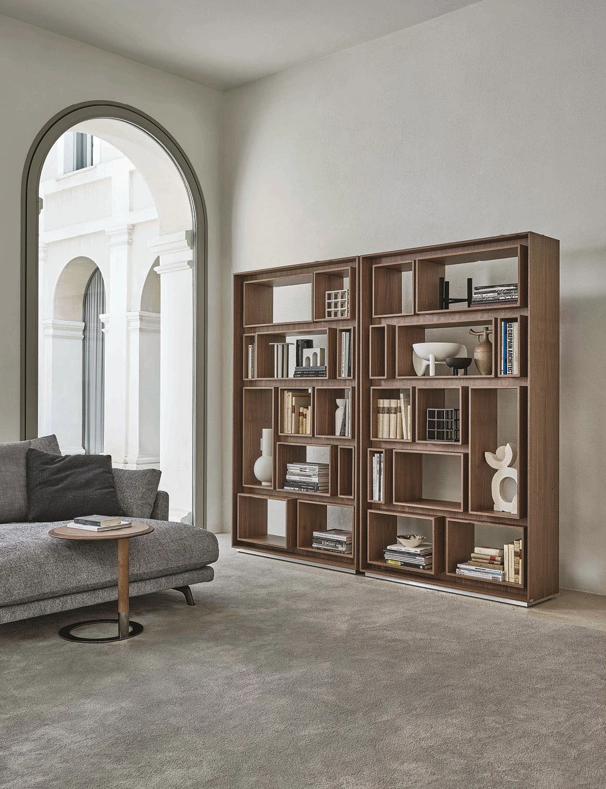 Das First Bücherregal von Porada vereint zeitlose Eleganz mit funktionalem Design. Es ist aus hochwertigem Nussbaum Canaletta oder Eiche Spessart gefertigt, was ihm eine warme und natürliche Ausstrahlung verleiht. Die offene, modulare Struktur ermöglicht eine flexible Anordnung der Fächer, wodurch das Regal sowohl als klassischer Bücheraufbewahrungsort als auch als stilvolles Präsentationsmöbel genutzt werden kann.