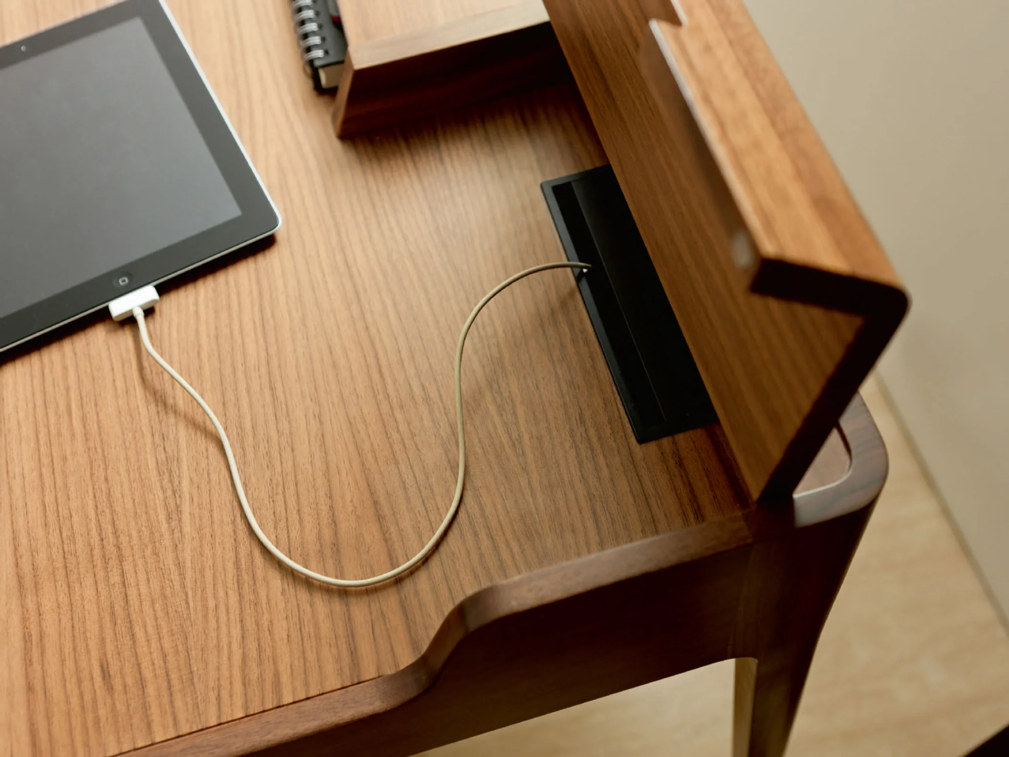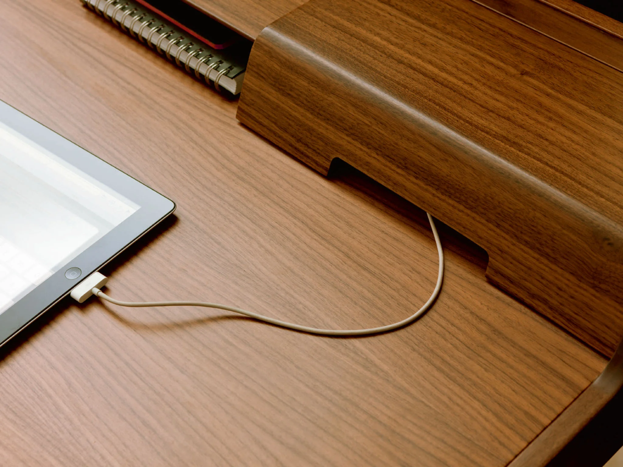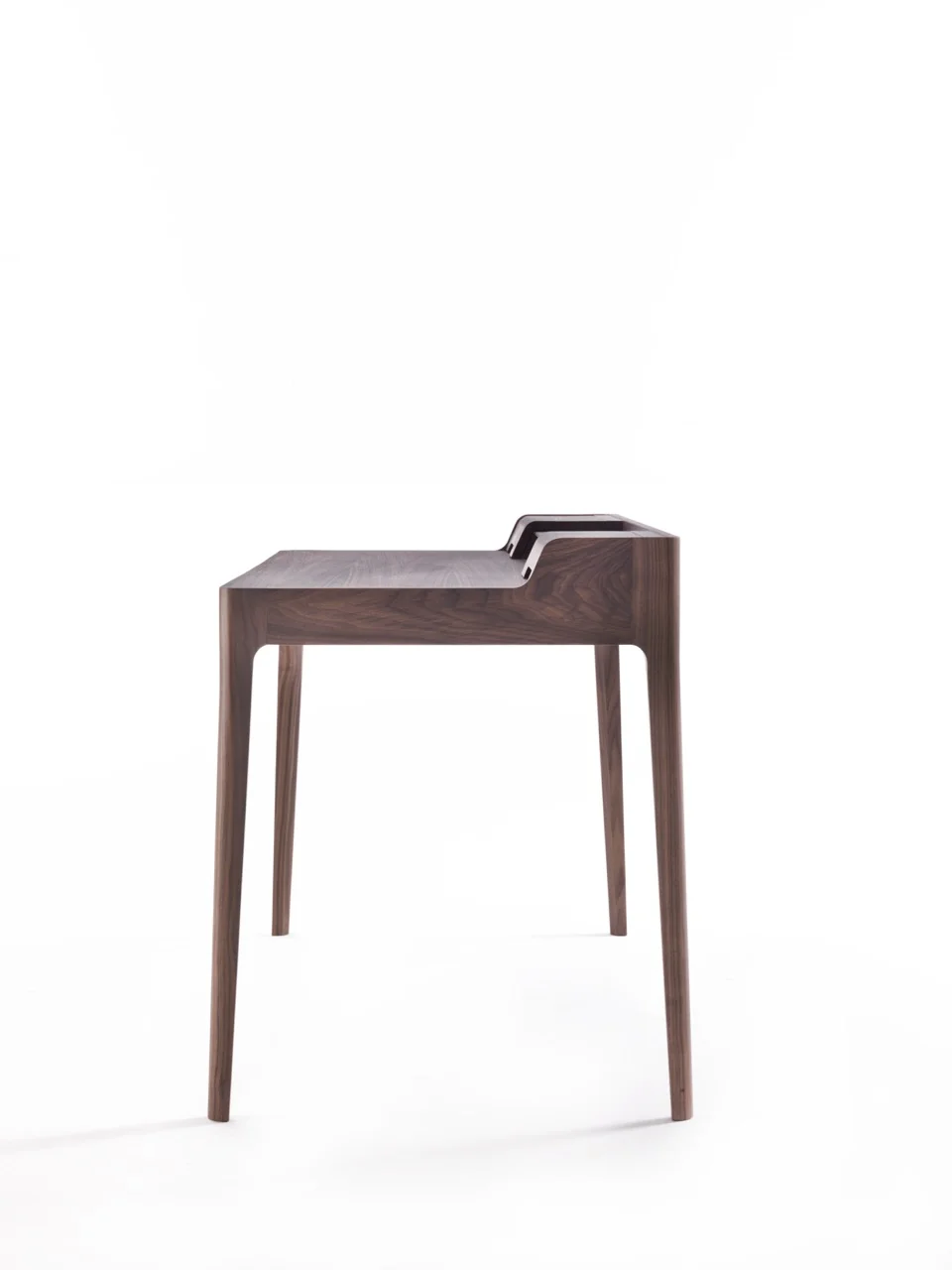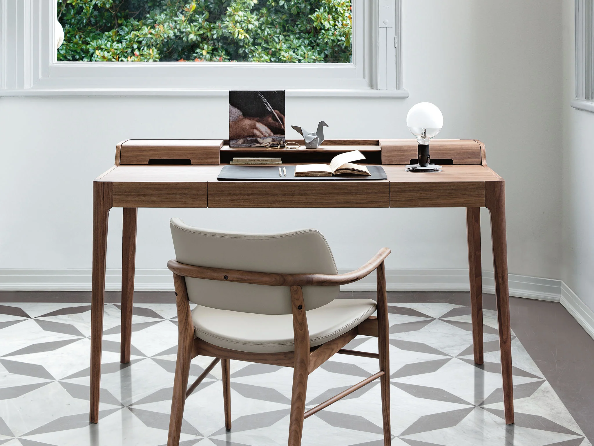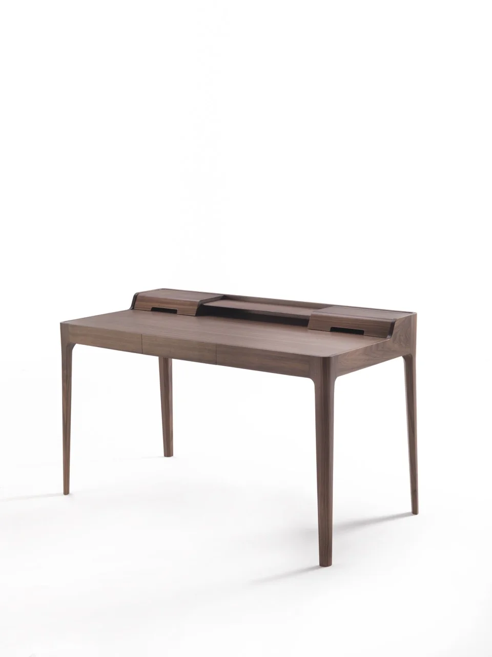 Der Saffo Schreibtisch ist ein Meisterwerk der Schlichtheit und Funktionalität. Die klare Linienführung und die edlen Materialien machen ihn zu einem echten Blickfang in jedem Büro. Der Tisch ist mit einer praktischen Schublade aus massivem Nussbaum Canaletta ausgestattet, die großzügigen Stauraum für Ihre Schreibutensilien oder Dokumente bietet. Eine subtile Ablagefläche sorgt für zusätzlichen Platz, während die versteckte Kabeldurchführung für ein ordentliches, aufgeräumtes Arbeitsumfeld sorgt. Besonders hervorzuheben ist die Schreibunterlage aus Cuoietto, die dem Schreibtisch eine luxuriöse Haptik verleiht und das Arbeiten noch angenehmer macht.