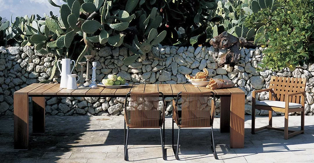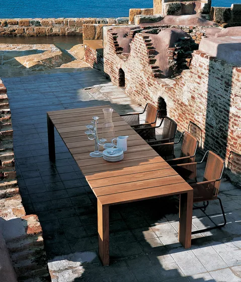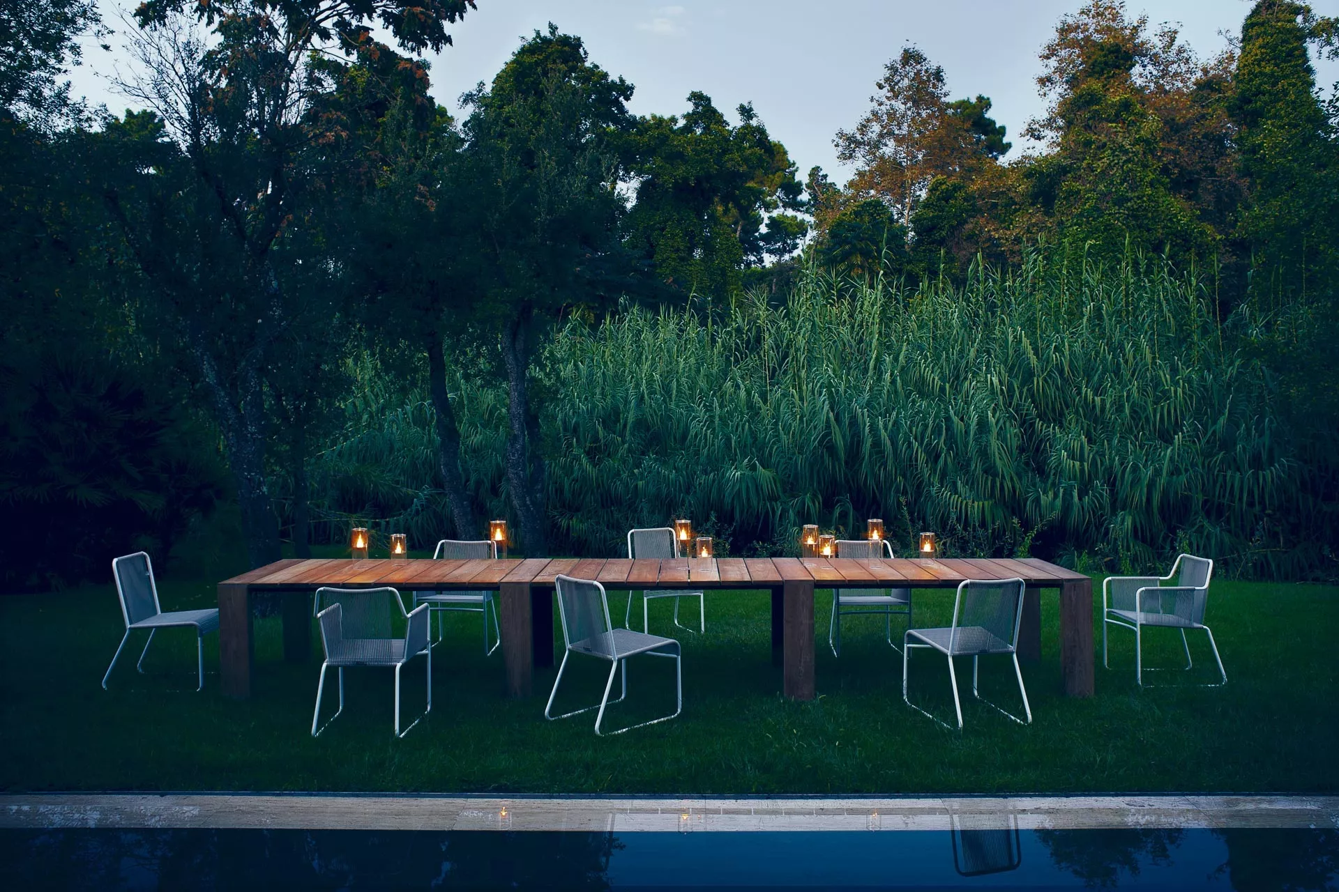 Die Kollektion Pier von Roda präsentiert einen ebenso schlichten wie faszinierenden Teakholztisch für den Außenbereich. Die Tischplatte besteht aus zahlreichen Holzleisten, die sich wie die Tasten eines Klaviers harmonisch aneinanderreihen. Diese Leisten sind leicht versetzt angeordnet, so dass der Eindruck einer endlosen Linie entsteht. Plötzlich steigen sie vertikal an und bilden die Beine des Tisches, wodurch ein einzigartiges und dynamisches Design entsteht. Pier verbindet schlichte Eleganz mit innovativem Design und ist eine stilvolle Bereicherung für jeden Außenbereich.