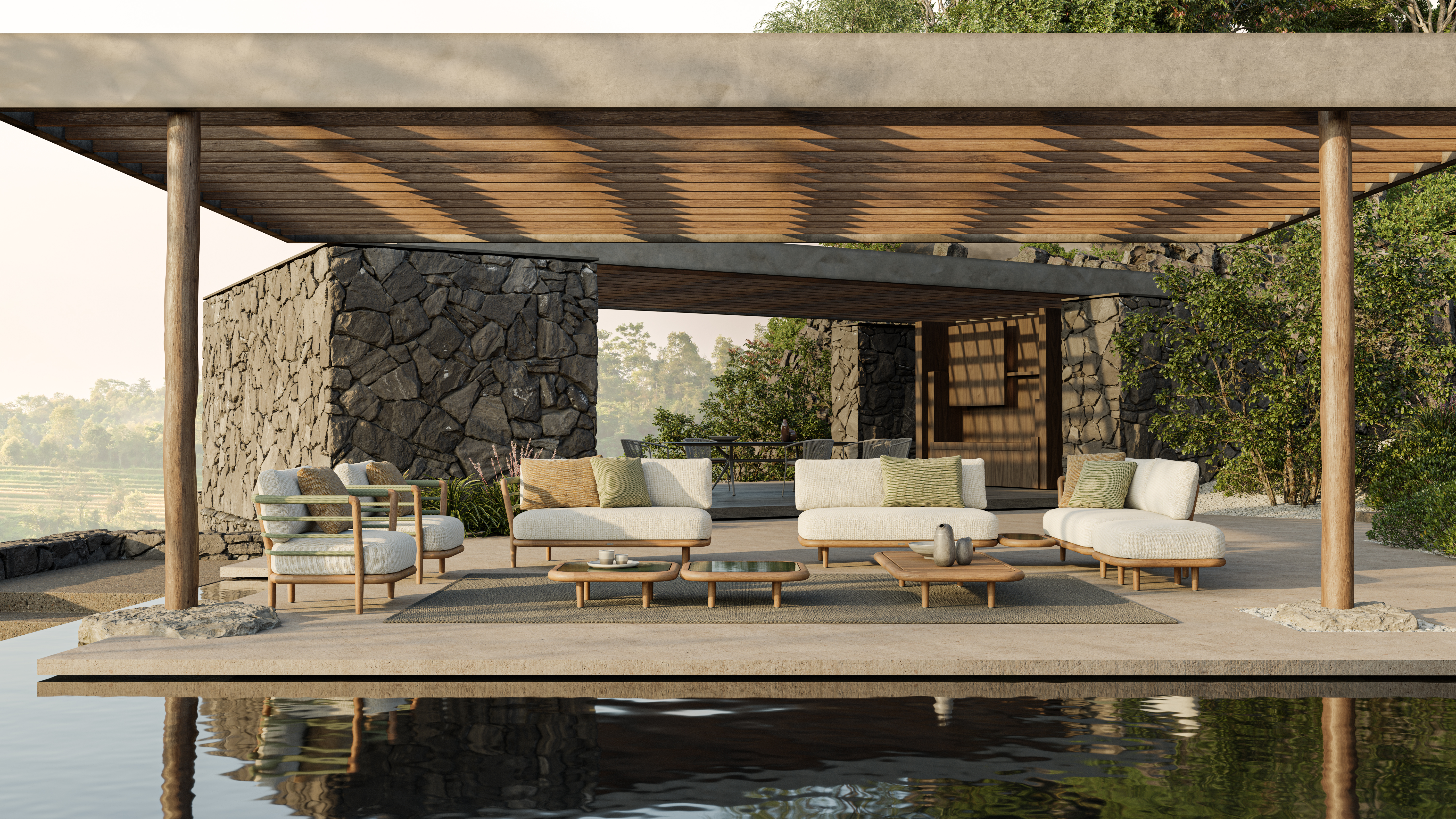 Das Set ist als komfortable Lounge-Komposition konzipiert und lässt sich flexibel platzieren – als großzügige Ecklösung oder als zwei harmonisch aufeinander abgestimmte Sofaelemente. Die tiefen Sitzflächen und die komfortablen Outdoor-Kissen machen Archy zum Mittelpunkt für entspannte Nachmittage und lange Abende im Freien.