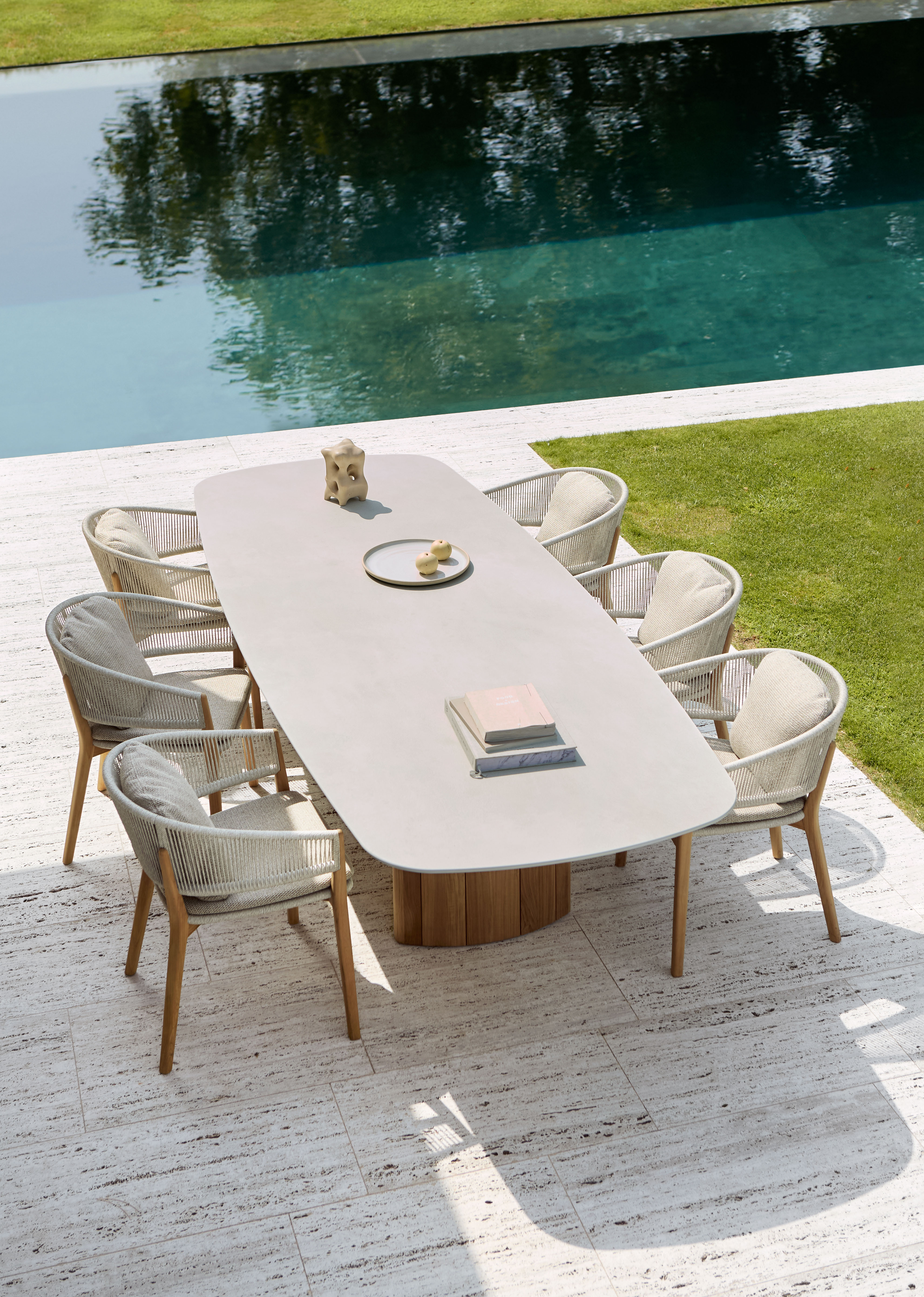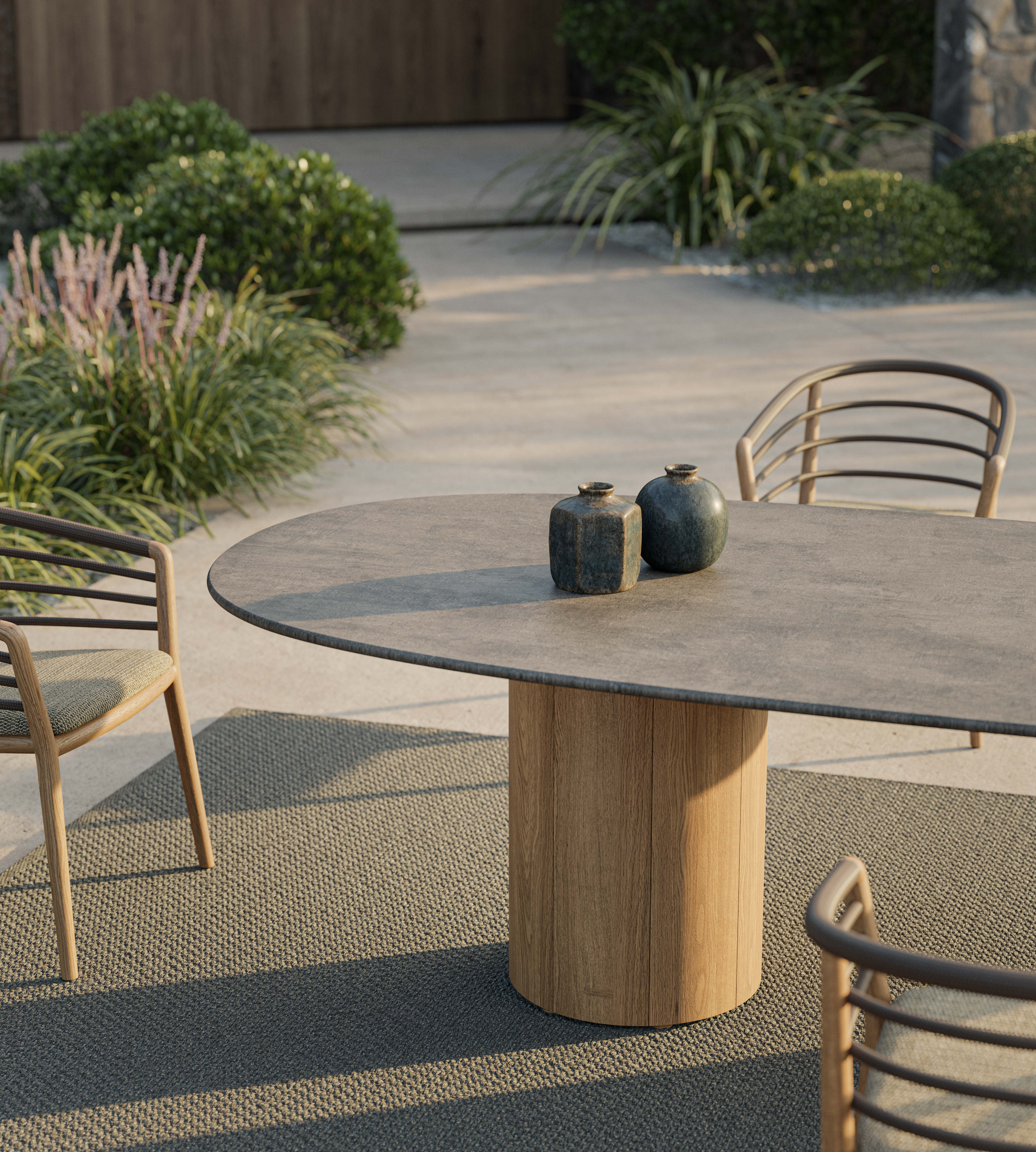 Royal Botania Furniz Gartentisch Ellipse | versch. Größe Der Furniz Tisch verbindet elegantes Outdoor-Design mit saisonaler Vielseitigkeit: Im Sockel kann ein integriertes Heizelement Platz finden – dezent gelöst und ideal für kühlere Abende im Freien. So verlängert Furniz das Outdoor-Dining über den Sommer hinaus, ohne die klare, ruhige Designsprache zu stören. Furniz ist in Standard Dining Höhe und in Low Dining Höhe erhältlich – jeweils in unterschiedlichen Formen und Größen. Je nach Ausführung stehen Tischplatten in Keramik, Teak oder Beton zur Wahl. Hinweis: Das Heizelement ist separat zu bestellen. Optionale Heizfunktion im Sockel – für längere Outdoor-Saisons Zwei Höhen: Standard Dining (75 cm) und Low Dining (67 cm) Viele Formen: Plectrum, rund, rechteckig, elliptisch Heizelement separat zu bestellen Maße ( L x B x H ): 250 x 120 x 67 250 x 120 x 75