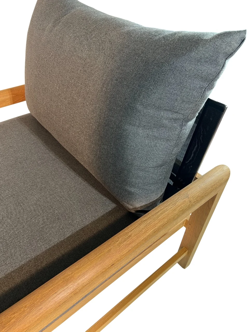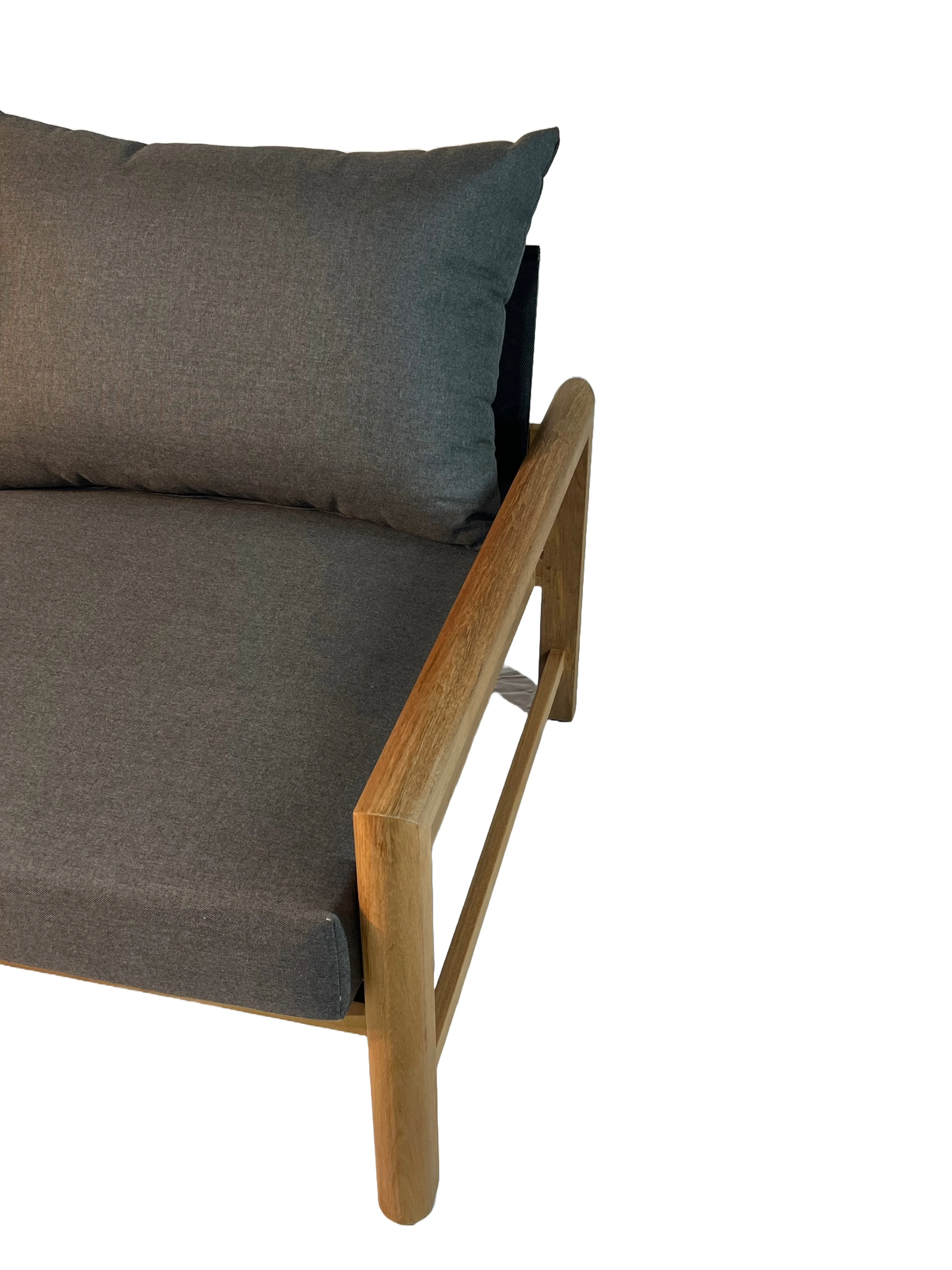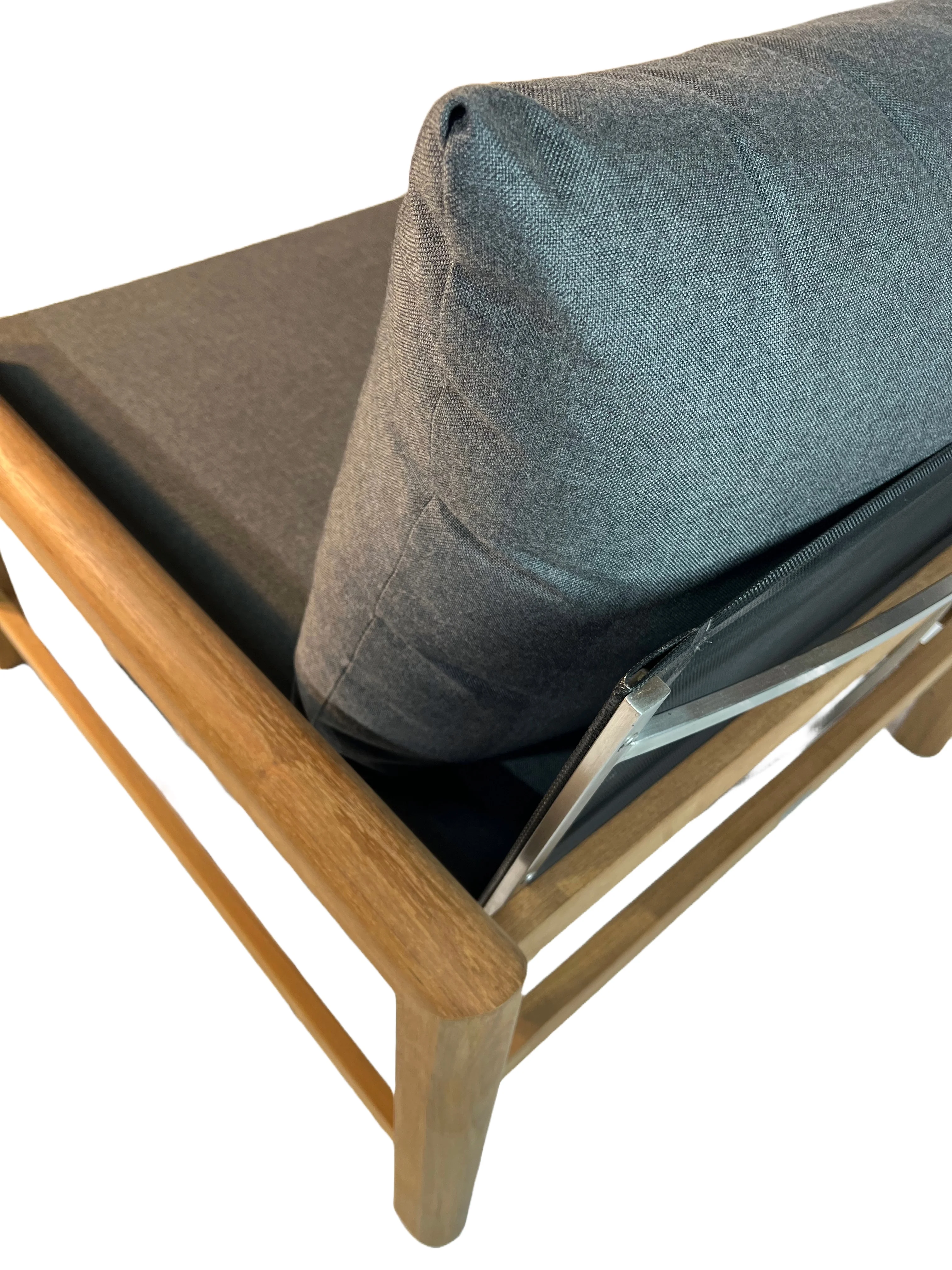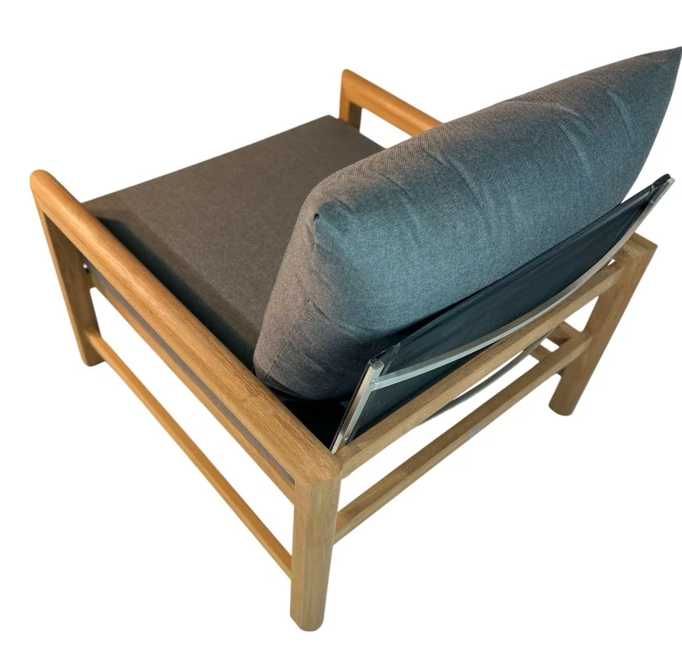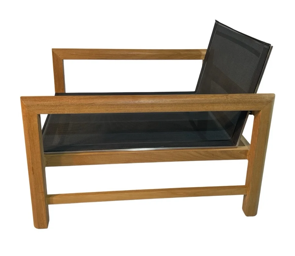 Dieser Loungesessel mit Sitzfläche aus Batyline und Teak- sowie Edelstahlhighlights überzeugt mit vielerlei Charme. Die Kombination der verschiedenen Elemente mit dem der Polster in Frosted Black runden das Gesamtkonzept ab. Royal Mirage verwendet nur ausgereiftes und sorgfältig ausgesuchtes Teakholz. Der hohe Ölanteil sorgt für geringe Feuchtigkeitsaufnahme sowie geringes Arbeiten im Holz und resultiert in einer enormen Stabilität.