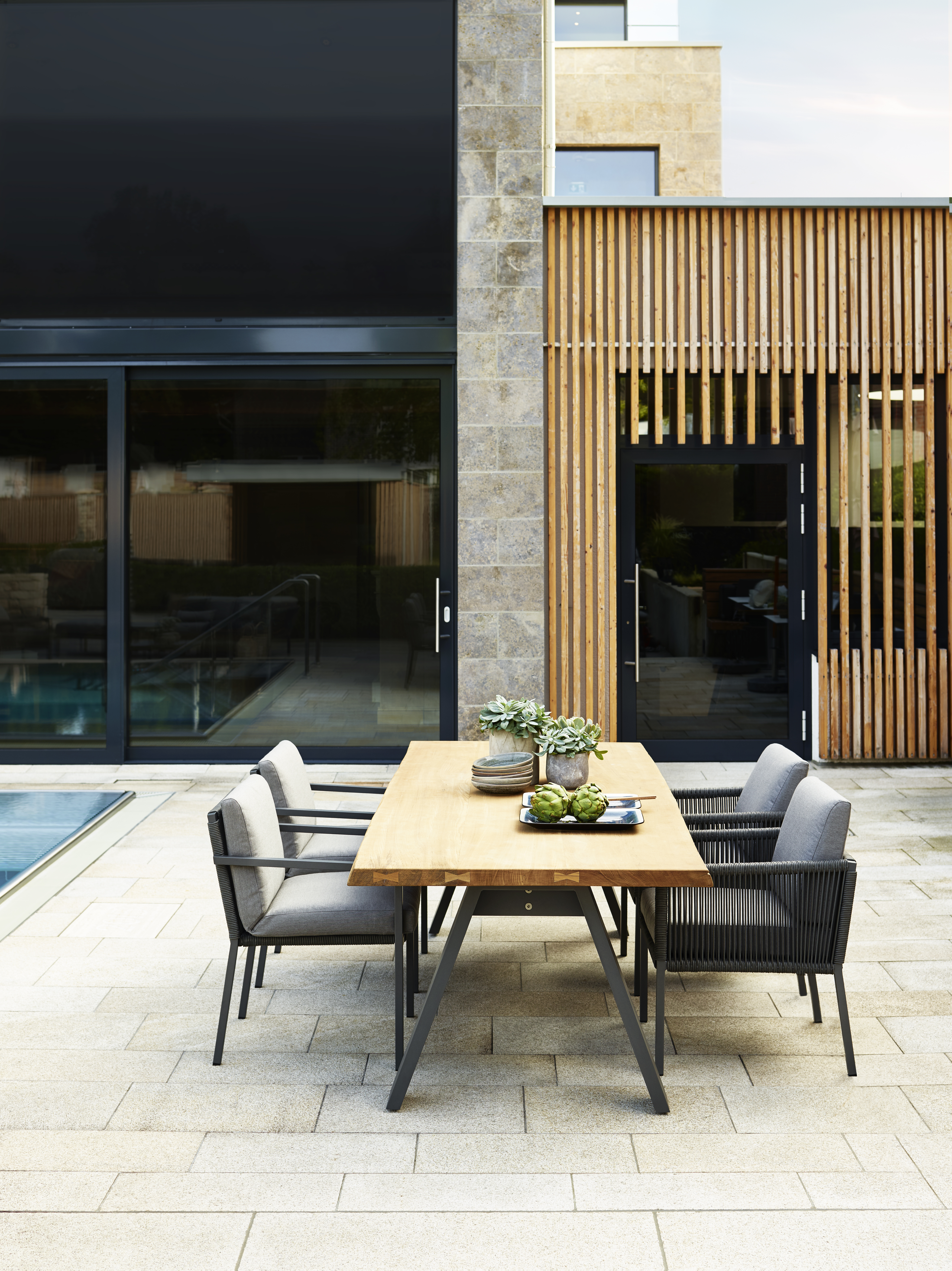 Der TIMBER Dining Tisch von SOLPURI verbindet natürliche Ursprünglichkeit mit einer klaren, modernen Formensprache und hochwertiger Materialität. Charakteristisch sind die in ihrer natürlichen Baumform belassenen Außenkanten der massiven, durchgehenden Teakplatte sowie die soliden Aluminiumbeine in markanter, umgekehrter V-Form. So entsteht ein ausdrucksstarker Tisch, der jede Outdoor-Dining-Situation mit Wärme, Individualität und zeitloser Präsenz bereichert.