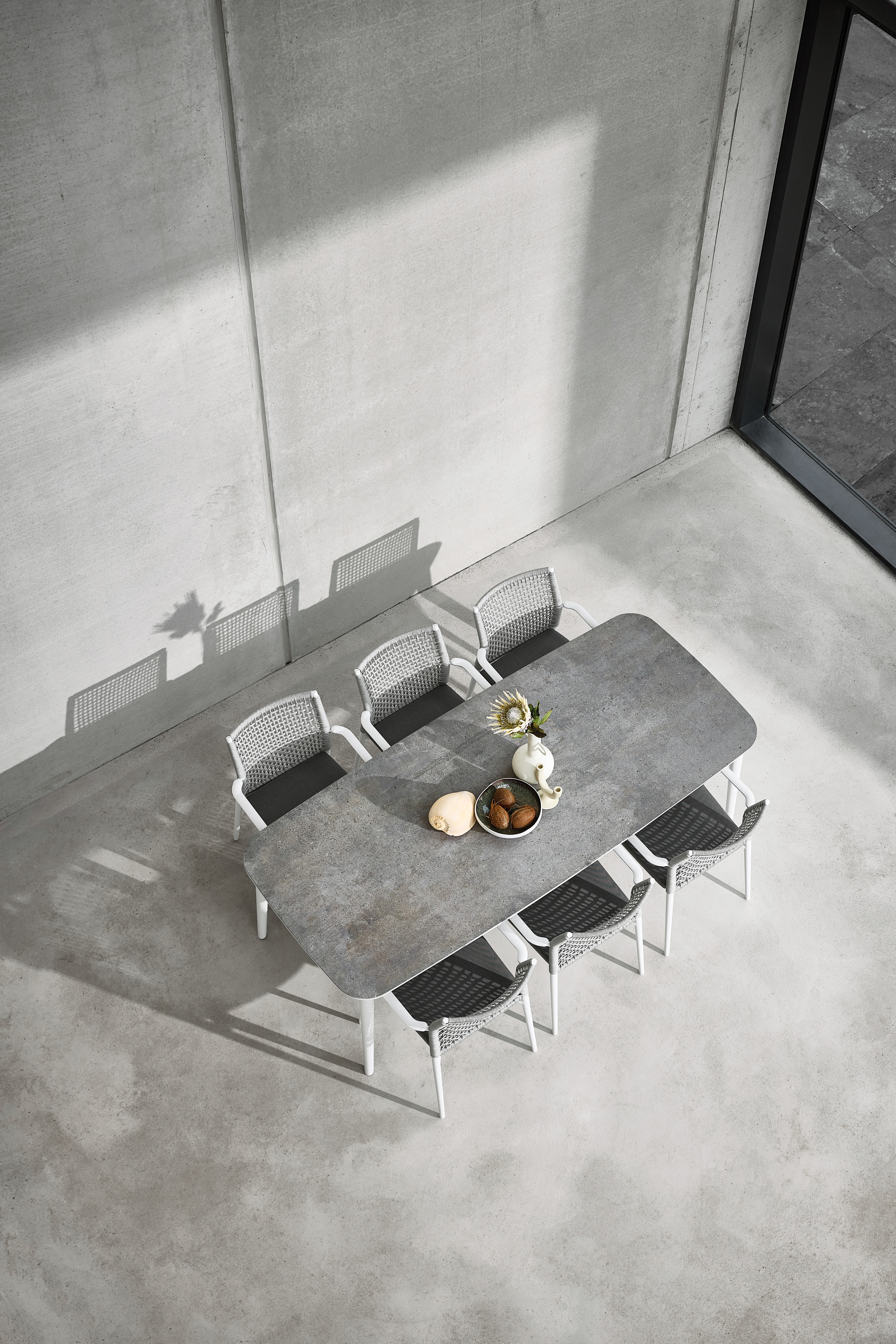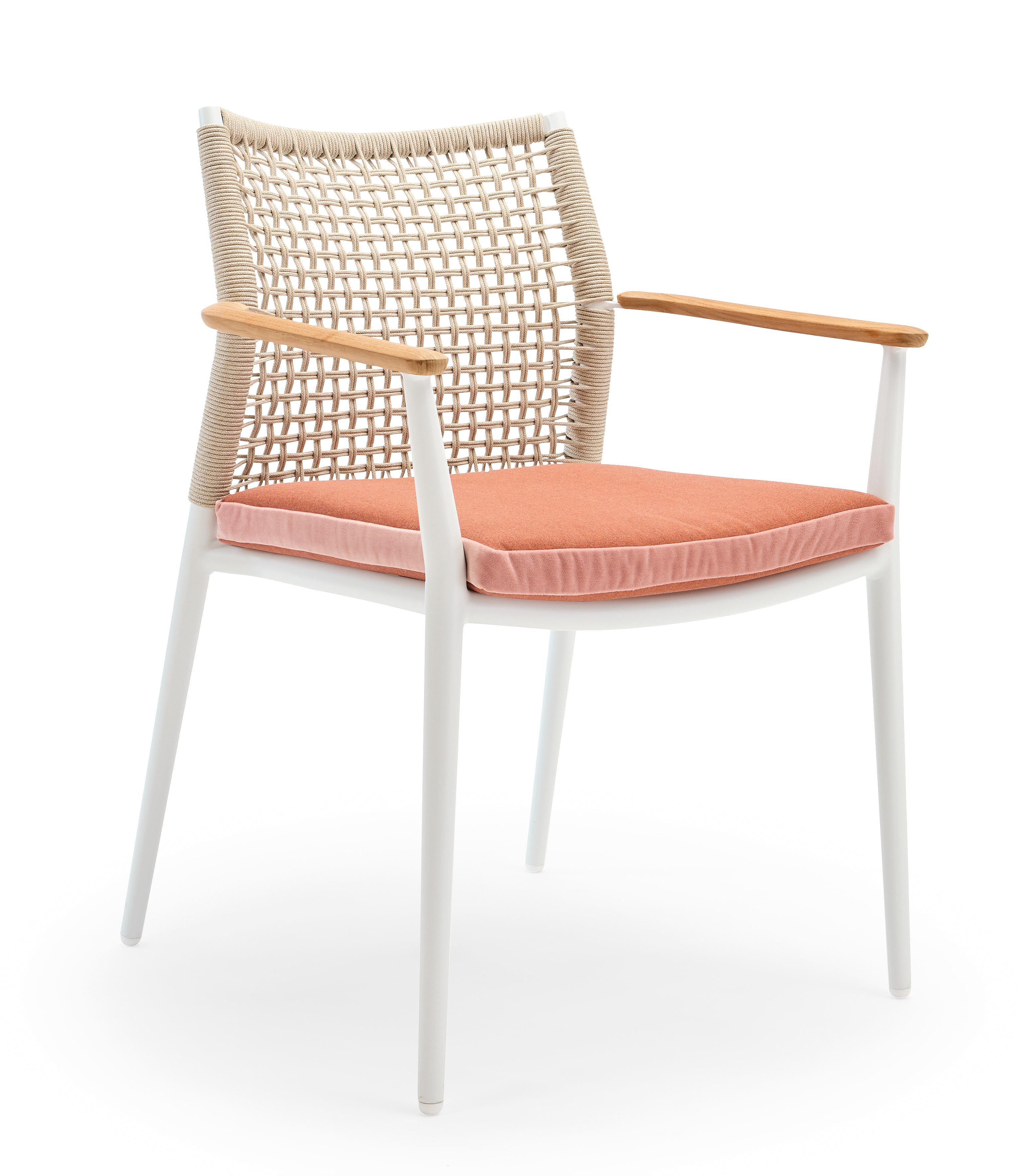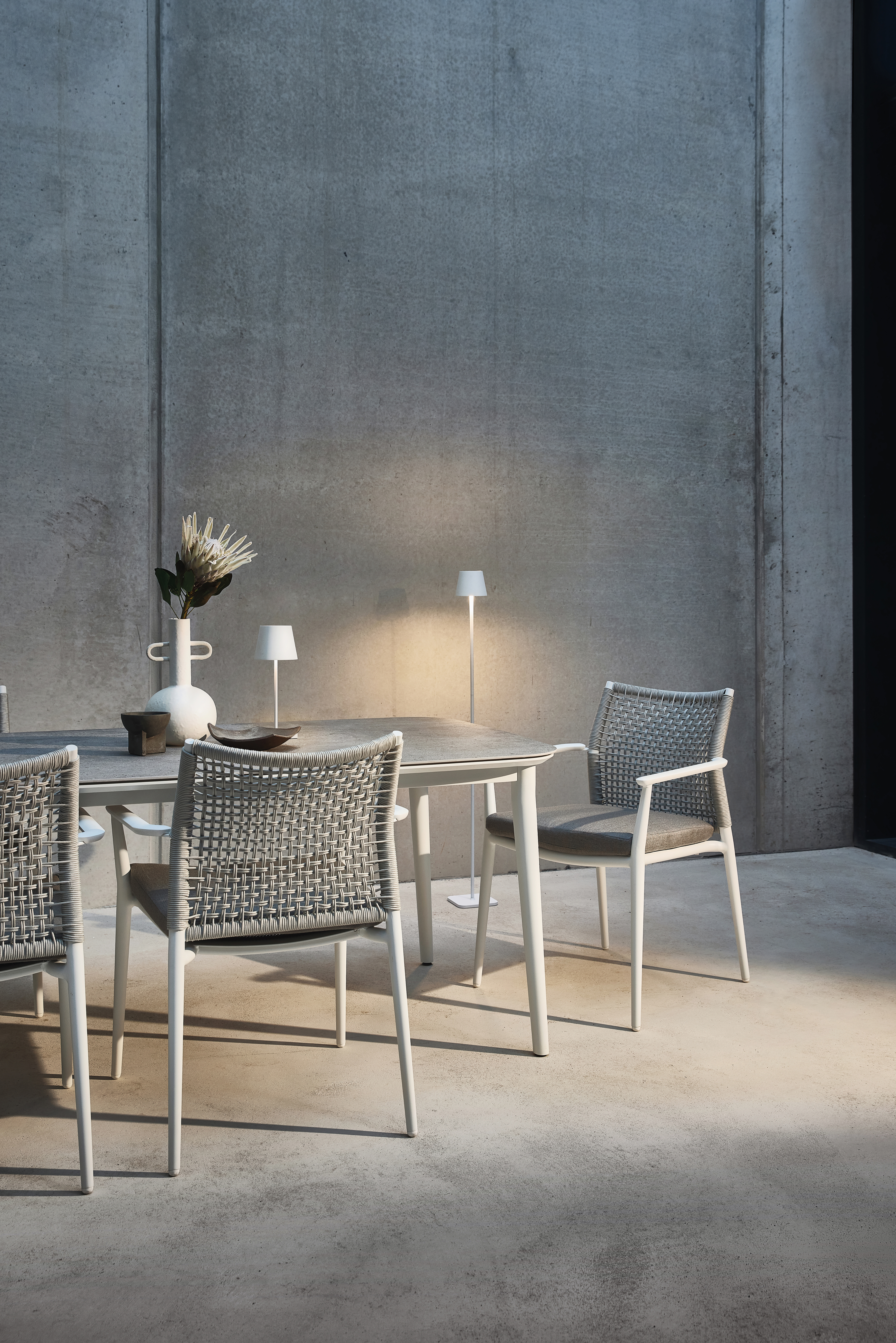 Der VERA Stapelsessel von SOLPURI verbindet filigrane Leichtigkeit mit einer eleganten, modernen Formensprache. Der schlanke Aluminiumrahmen mit verjüngten Beinen und das markante, handgearbeitete Flechtmuster aus String-Flex-Seil verleihen dem Sessel eine stilvolle, hochwertige Ausstrahlung und machen ihn zu einer komfortablen Wahl für anspruchsvolle Outdoor-Dining-Bereiche.