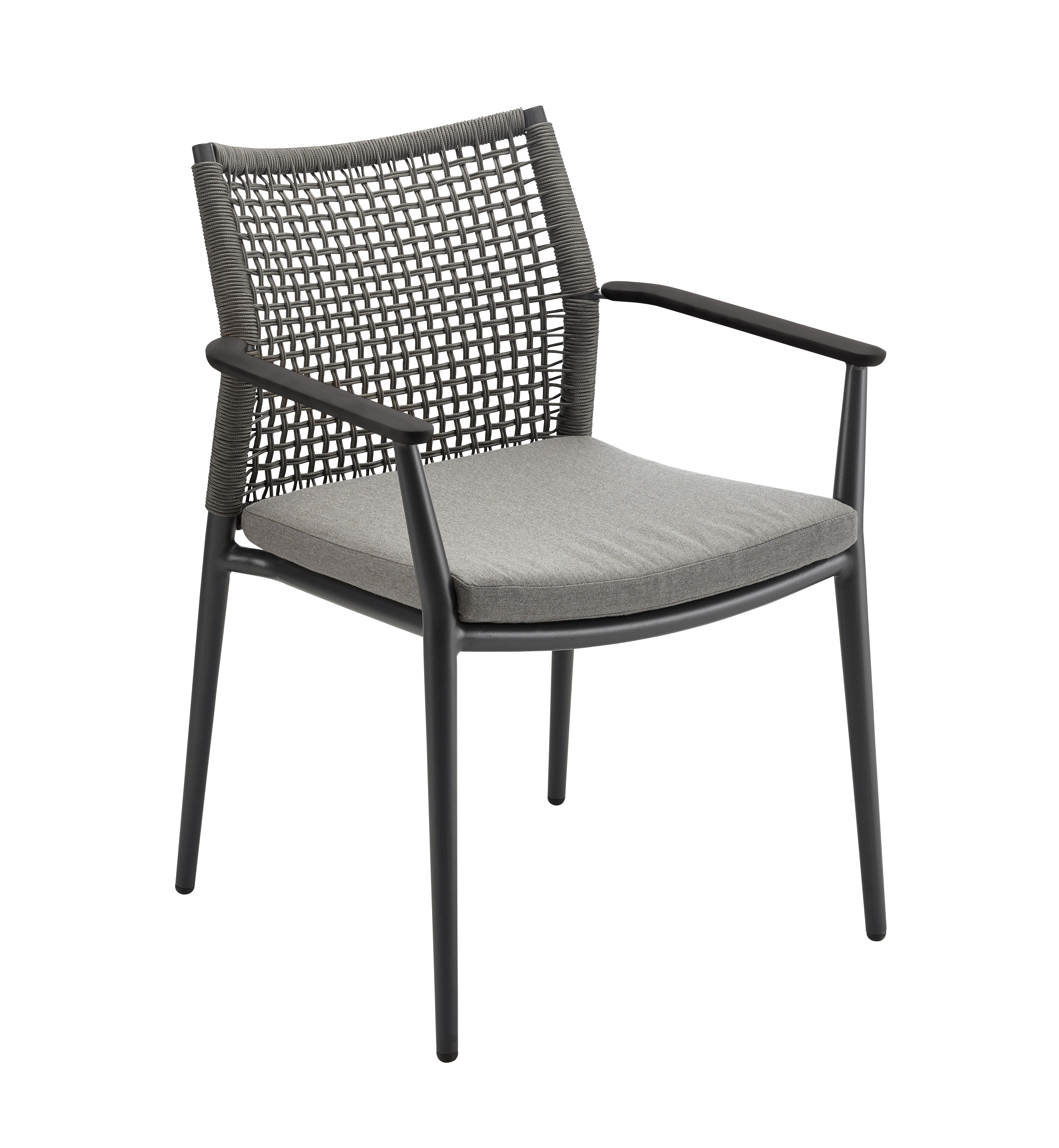 SOLPURI CARO Dining Sessel Der CARO Dining Sessel von SOLPURI überzeugt mit einer filigranen, gerundeten Silhouette und dem für die Kollektion charakteristischen offenen Rautengeflecht. Komfortable Sitz- und Rückenpolster verleihen ihm eine luxuriöse Ausstrahlung und machen ihn zu einer stilvollen Wahl für anspruchsvolle Outdoor-Dining-Bereiche. Filigranes Design mit offenem Rautengeflecht Gerundete, elegante Formensprache Inklusive Sitz- und Rückenpolster Maße (B × T × H): 59 × 68 × 78 cm Sitzhöhe: 42 cm + 4 cm Polster Gewicht: 8 kgPolster in Bombay anthracite wetterfest (-626.we) mit verkürzter Lieferzeit.