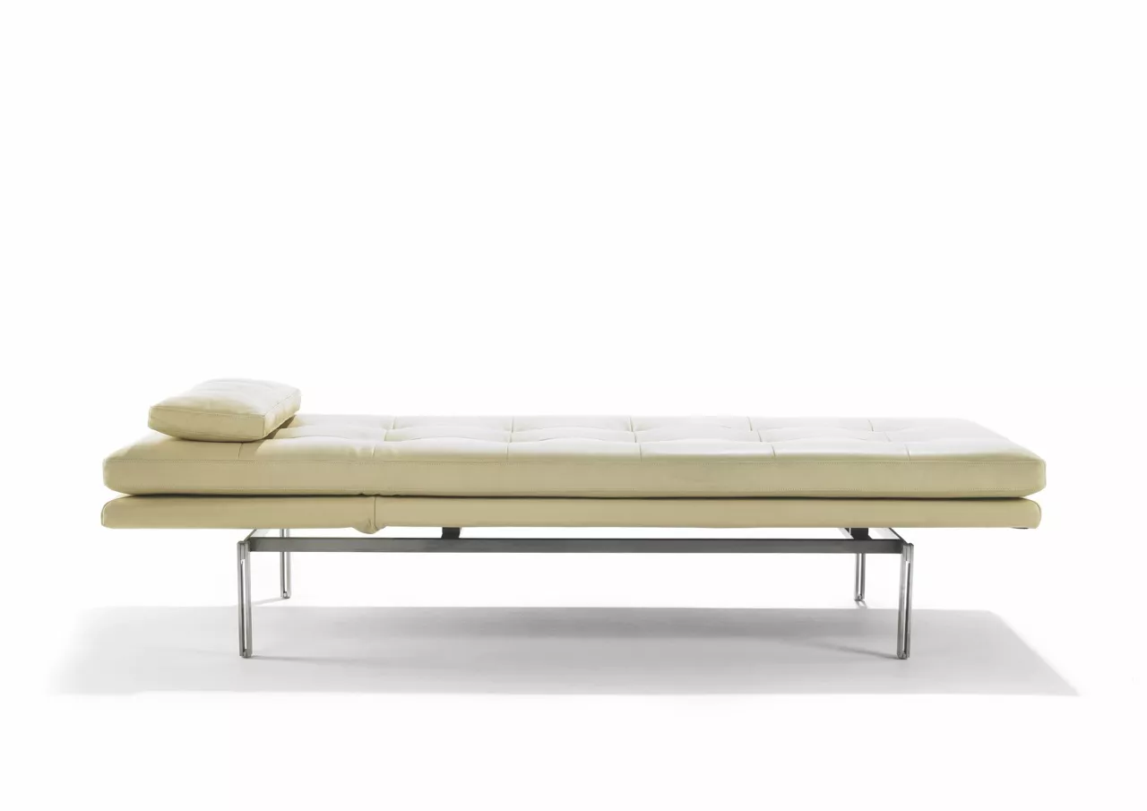 Das Fußgestell der Liege ist in verschiedenen Ausführungen erhältlich: pulverbeschichtet in Schwarz, verchromt für einen eleganten Glanz oder optional auch in hochwertigem Edelstahl für eine edle Optik.
