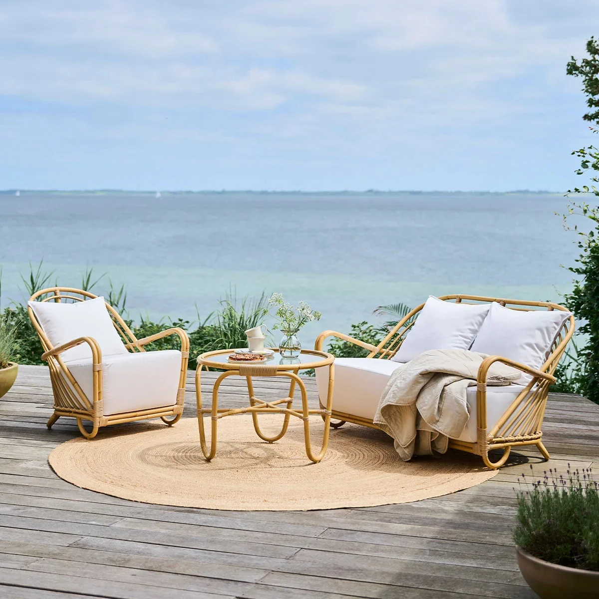 Das Geflecht der Charlottenborg Kollektion besteht aus einem Kunststoff, dass absolut resistent gegen Witterungseinflüsse ist und im Laufe der Zeit farbbestängig bleibt. Es ist handgflochten und hat eine Oberfläche, die sich ganz gut anfühlt und sehr natürlich aussieht.