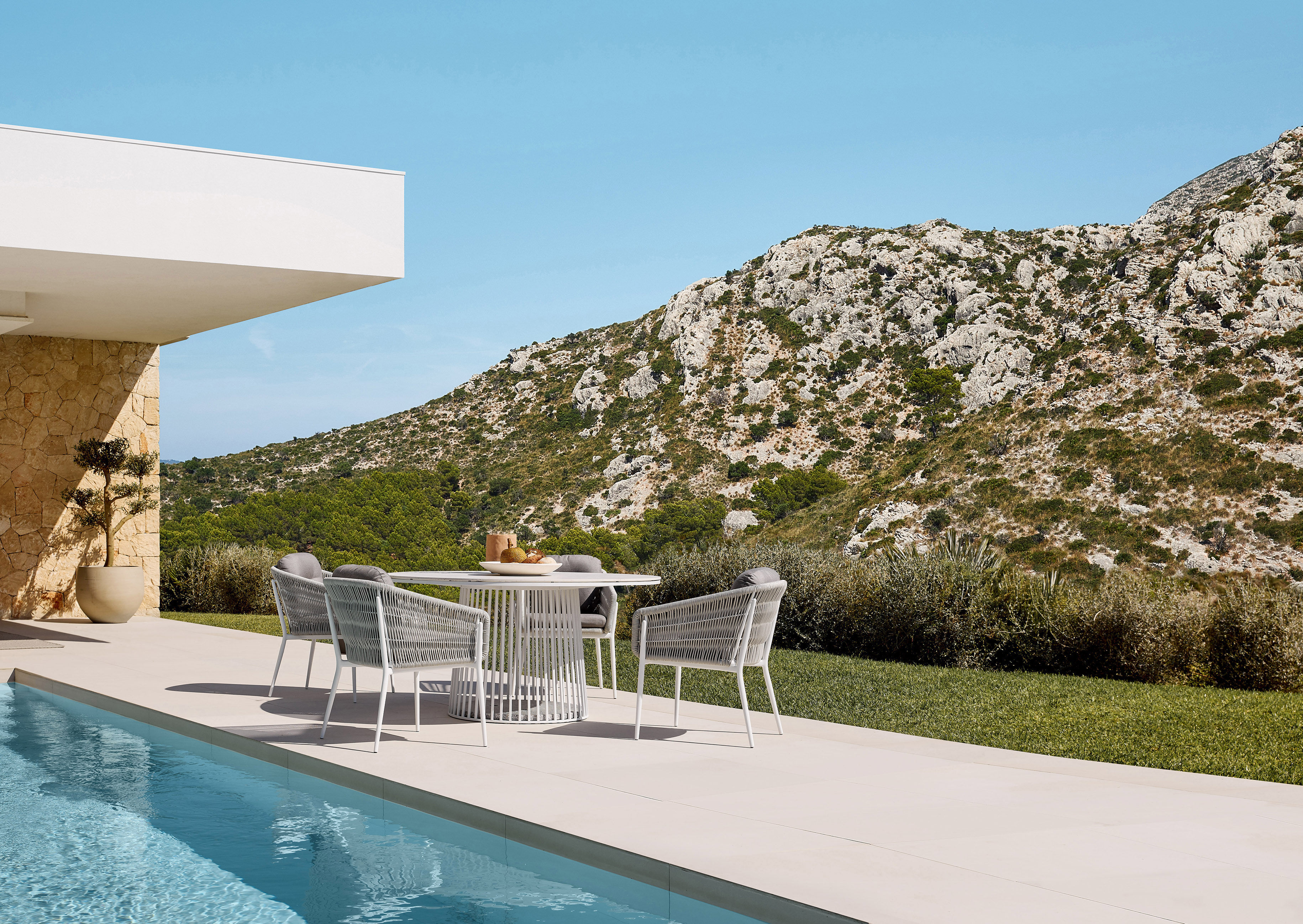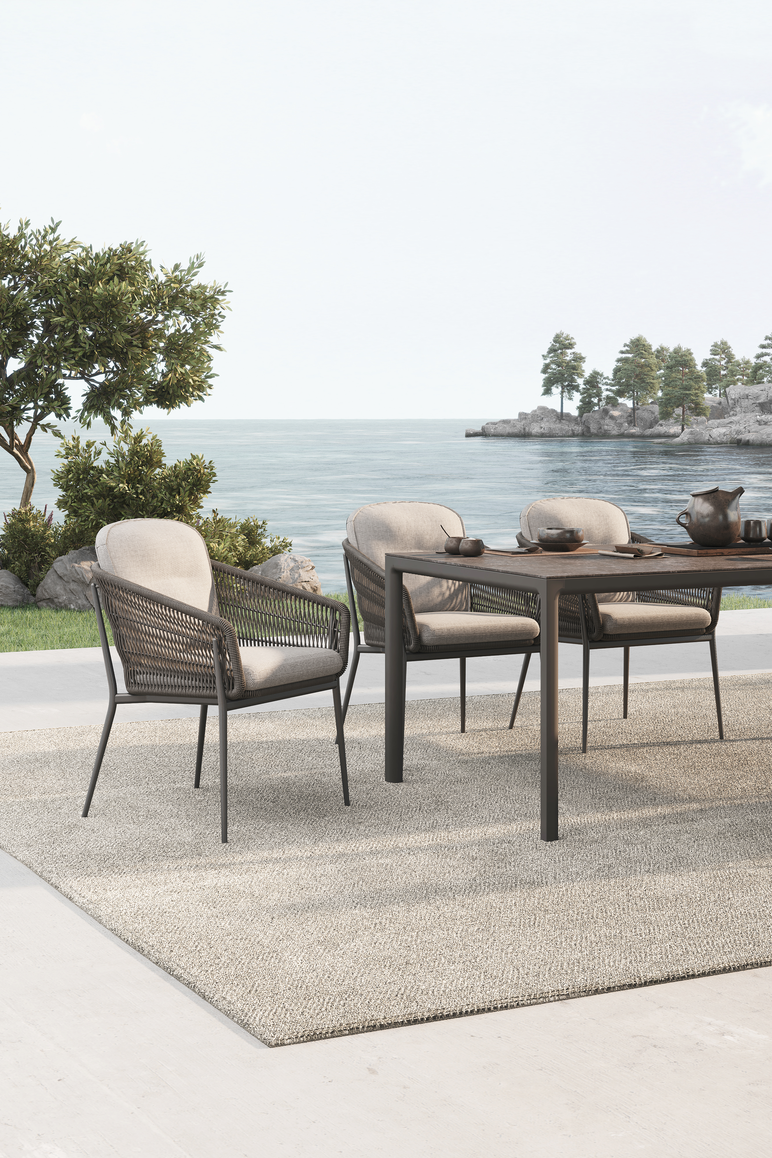 Der CESTINO Dining Sessel von SOLPURI verbindet filigrane Leichtigkeit mit zeitloser Eleganz und hohem Sitzkomfort. Das leicht wirkende Aluminiumgestell, die geflochtene Sitz- und Rückenschale sowie die komfortable Polsterung verleihen dem Sessel eine moderne, hochwertige Ausstrahlung und machen ihn zu einer stilvollen Wahl für anspruchsvolle Outdoor-Dining-Bereiche.