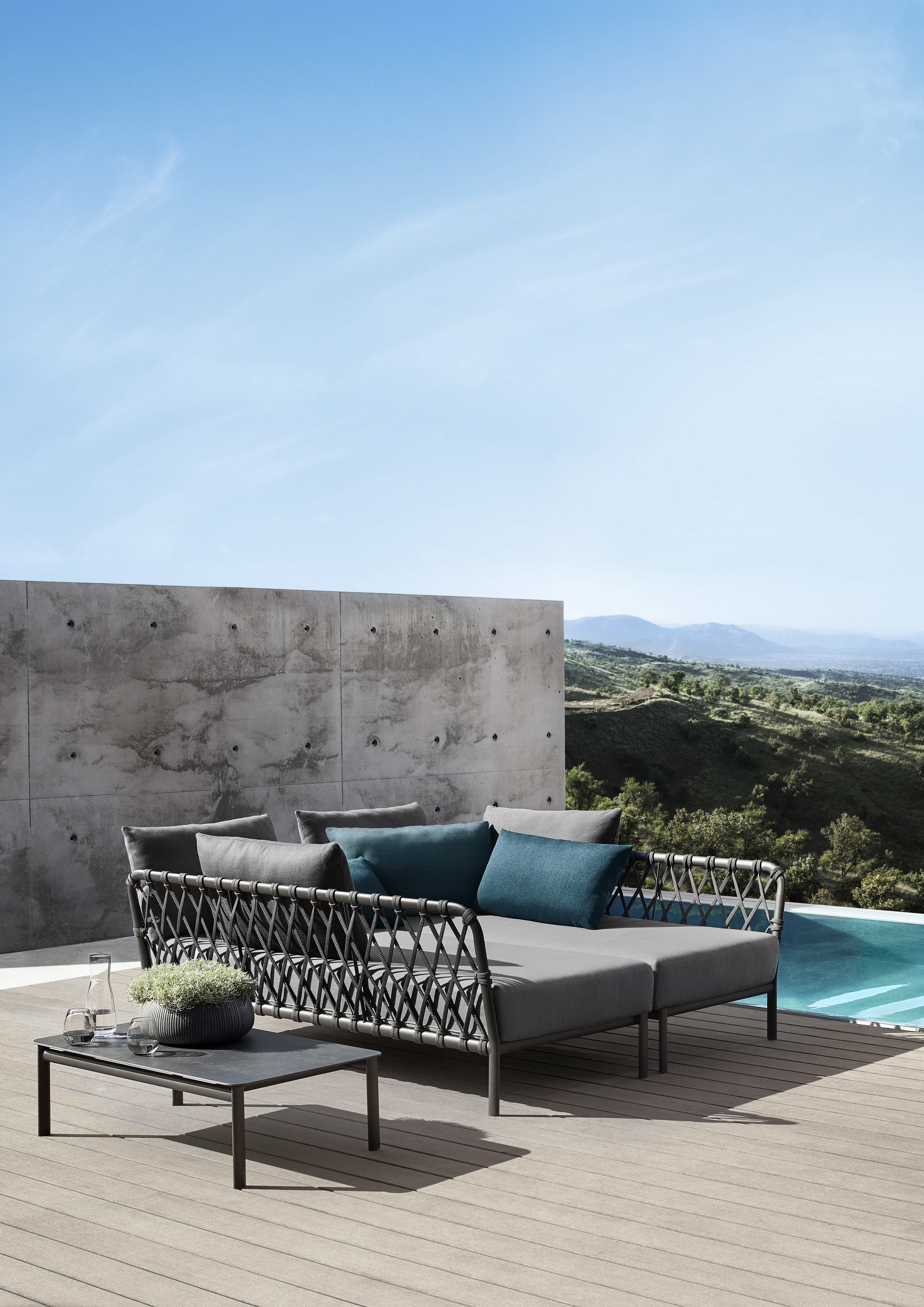 SOLPURI CARO Eckmodul XL Das CARO Eckmodul XL von SOLPURI verbindet eine gerundete, elegante Silhouette mit dem charakteristischen filigranen String-Flex-Geflecht der Kollektion und schafft so eine moderne, luxuriöse Outdoor-Ästhetik. Großzügige Polster und abgestimmte Rückenkissen sorgen für hohen Sitzkomfort und machen das Modul zu einer stilvollen Lösung für anspruchsvolle Lounge-Bereiche im Außenbereich. Gerundete, elegante Formensprache Filigranes String-Flex-Geflecht in charakteristischer CARO Optik Inklusive Sitzpolster und 2 Rückenkissen Maße (B × T × H): 71 × 150 × 115 cm Sitzhöhe: 24 + 20 cm Caro: Polster in Bombay anthracite wetterfest (-626.we) mit verkürzter Lieferzeit
