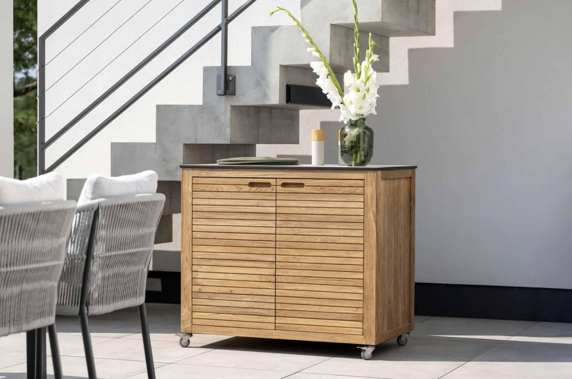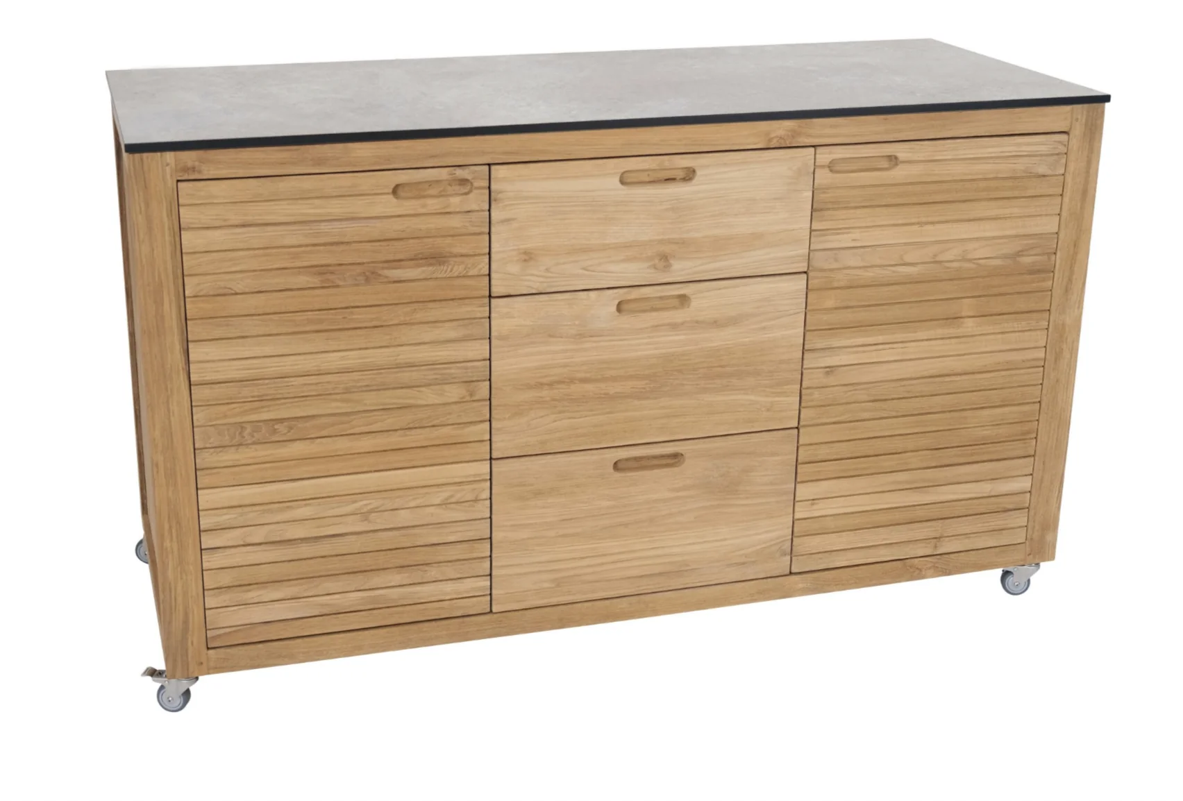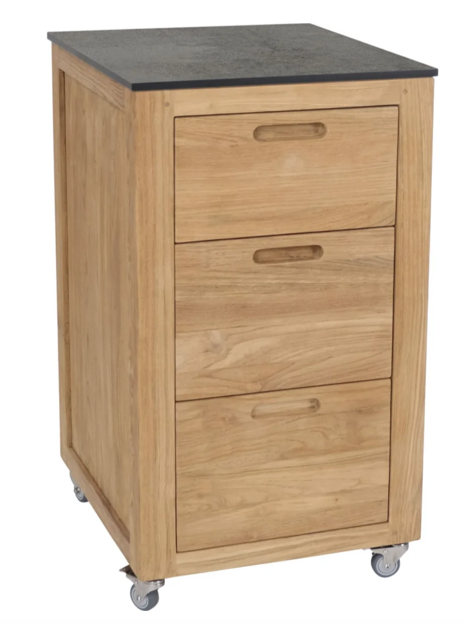 Stern ELMA Sideboard • verschiedene Größen • Old Teak Entdecken Sie den Mehrwert eines Sideboards auf Ihrer Dining-Terrasse. Ob für den Sektempfang, als Stauraum für Besteck oder als stilvolle Ablage für Ihre Speisekarten – das Sideboard ELMA ist nicht nur dekorativ, sondern vor allem äußerst praktisch.Produkteigenschaften Old Teak mit drei Schubladen und vier Lenkrollen, davon zwei mit Bremse; Maße: L: 50 cm x B: 58 cm x H:88 cm