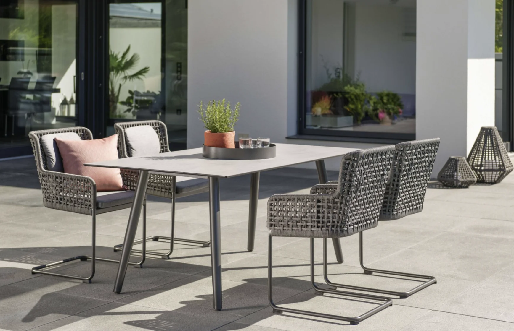 Stern GRETA Dining Set (Ecke) • Kordel Genießen Sie entspannte Stunden unter der Sonne mit dem Stern Greta Dining Ecke. Diese hochwertige Bank Ecke vereint stilvolles Design mit höchstem Komfort und langlebigen Materialien. Das leichte Aluminiumgestell sorgt für eine moderne Optik und hohe Stabilität, während die robuste Kordelbespannung (Synthetikfaser) eine elegante Note verleiht und gleichzeitig hohen Sitz- und Liegekomfort bietet. Das weiche Kissenset (100 % Polyacryl) macht das Sitzen besonders bequem. Perfekt für Garten, Terrasse oder Balkon! Polypropylen zeichnet sich durch seine besondere Strapazierfähigkeit aus. Es nimmt kaum Feuchtigkeit auf, ist äußerst lichtecht und hält Temperaturen bis –10 °C mühelos stand. Dank dieser Eigenschaften eignet sich die Faser ideal für den Einsatz im Outdoorbereich. Materialinformationen entnehmen Sie gerne den beigefügten Dokumenten. Produkteigenschaften Auflage: Abnehmbar & waschbar, 100% Polyacryl Alle Sitz- und Rückenkissen verfügen über einen Reißverschluss Gestell: Aluminium Optional: Ecke links oder rechts (sitzend)Sitzfläche: Kordel (100% Polypropylen) Maße: B252 × T54 × H86 cmSitzhöhe: 48 cm mit Kissen Armlehnenhöhe: 62,5 cm Gewicht: 46 kg Design: WinkelbauerDas anthrazitfarbene Aluminiumgestell sorgt für eine moderne Optik und hohe Stabilität. Die Sitzfläche aus robuster Kordelbespannung in Platin (Ø 4 mm, 100 % Polypropylen) verleiht der Bank eine elegante Note und bietet gleichzeitig hohen Sitz- und Liegekomfort. Produkteigenschaften Gestell: Aluminium, Farbe AnthrazitBestehend aus zwei Elementen die eine Eckbank erzeugen Sitzfläche: Kordel (100% Polypropylen), Farbe Platin Auflage: Seidengrau, 100% Polyacryl, abnehmbar & waschbar Optional: Ecke links oder rechts (sitzend) Maße: B252 × T54 × H86 cm Gewicht: 46 kg