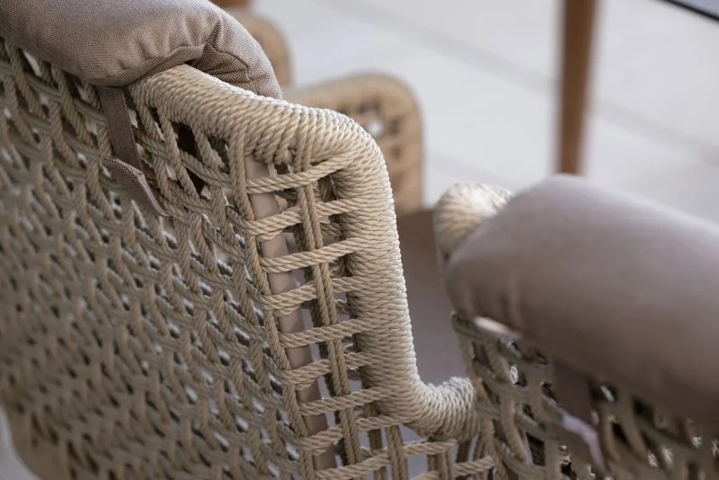 Stern GRETA Sessel Stern • Kordel Das leichte Aluminiumgestell sorgt für eine moderne Optik und hohe Stabilität, während die robuste Kordelbespannung (Synthetikfaser) eine elegante Note verleiht und gleichzeitig hohen Sitz- und Liegekomfort bietet. Das weiche Kissenset (100 % Polyacryl) macht das Sitzen besonders bequem. Perfekt für Garten, Terrasse oder Balkon! Polypropylen zeichnet sich durch seine besondere Strapazierfähigkeit aus. Es nimmt kaum Feuchtigkeit auf, ist äußerst lichtecht und hält Temperaturen bis –10 °C mühelos stand. Dank dieser Eigenschaften eignet sich die Faser ideal für den Einsatz im Outdoorbereich. Weitere Materialinformationen entnehmen Sie gerne den beigefügten Dokumenten. Produkteigenschaften Auflage: Abnehmbar & waschbar, 100% Polyacryl Alle Sitz- und Rückenkissen verfügen über einen Reißverschluss Gestell: Aluminium Sitzfläche: Kordel (100% Polypropylen) Maße: B62 × T62 × H87 cmSitzhöhe: 50 cm mit Kissen Armlehnenhöhe: 64,5 cm Gewicht: 6,9 kg Design: Winkelbauer