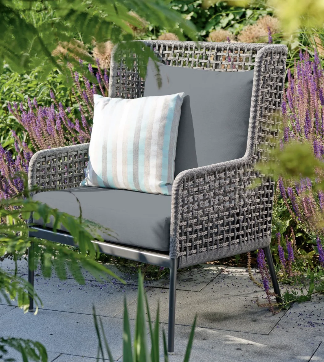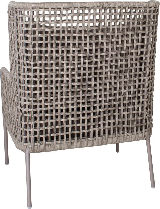 Stern GRETA Sessel Stern • Kordel Das leichte Aluminiumgestell sorgt für eine moderne Optik und hohe Stabilität, während die robuste Kordelbespannung (Synthetikfaser) eine elegante Note verleiht und gleichzeitig hohen Sitz- und Liegekomfort bietet. Das weiche Kissenset (100 % Polyacryl) macht das Sitzen besonders bequem. Perfekt für Garten, Terrasse oder Balkon! Polypropylen zeichnet sich durch seine besondere Strapazierfähigkeit aus. Es nimmt kaum Feuchtigkeit auf, ist äußerst lichtecht und hält Temperaturen bis –10 °C mühelos stand. Dank dieser Eigenschaften eignet sich die Faser ideal für den Einsatz im Outdoorbereich. Weitere Materialinformationen entnehmen Sie gerne den beigefügten Dokumenten. Produkteigenschaften Auflage: Abnehmbar & waschbar, 100% Polyacryl Alle Sitz- und Rückenkissen verfügen über einen Reißverschluss Gestell: Aluminium Sitzfläche: Kordel (100% Polypropylen) Maße: B62 × T62 × H87 cmSitzhöhe: 50 cm mit Kissen Armlehnenhöhe: 64,5 cm Gewicht: 6,9 kg Design: Winkelbauer